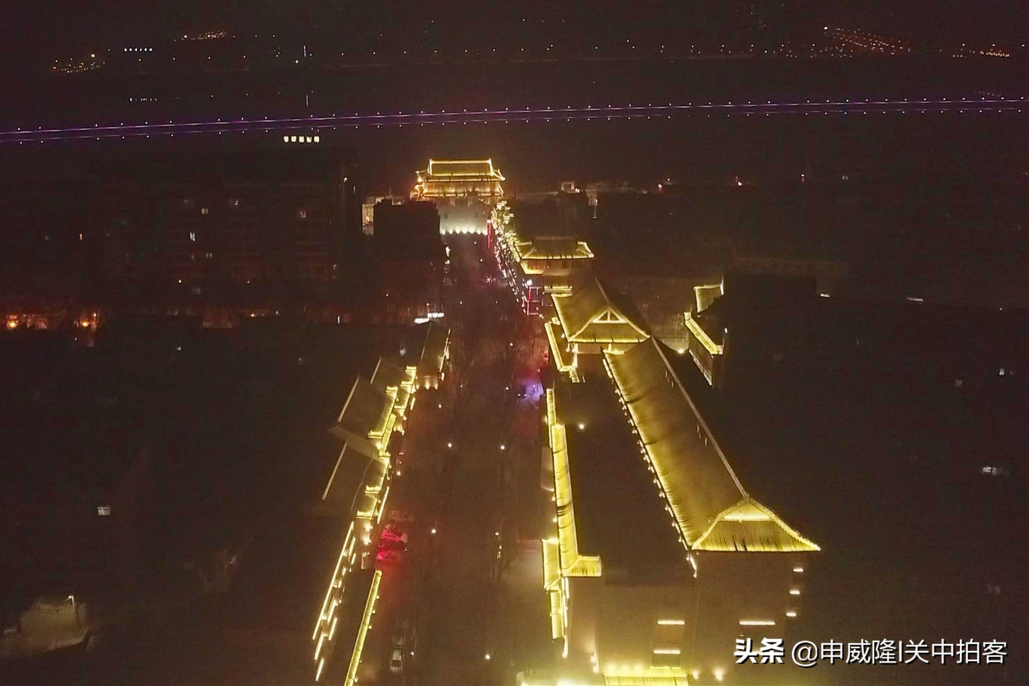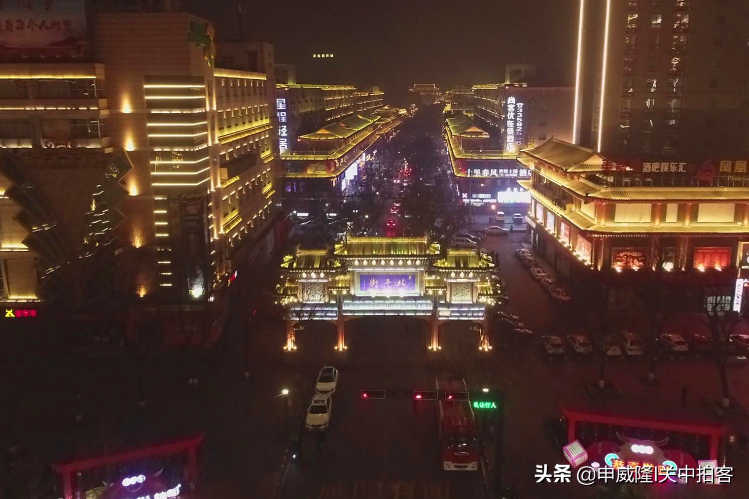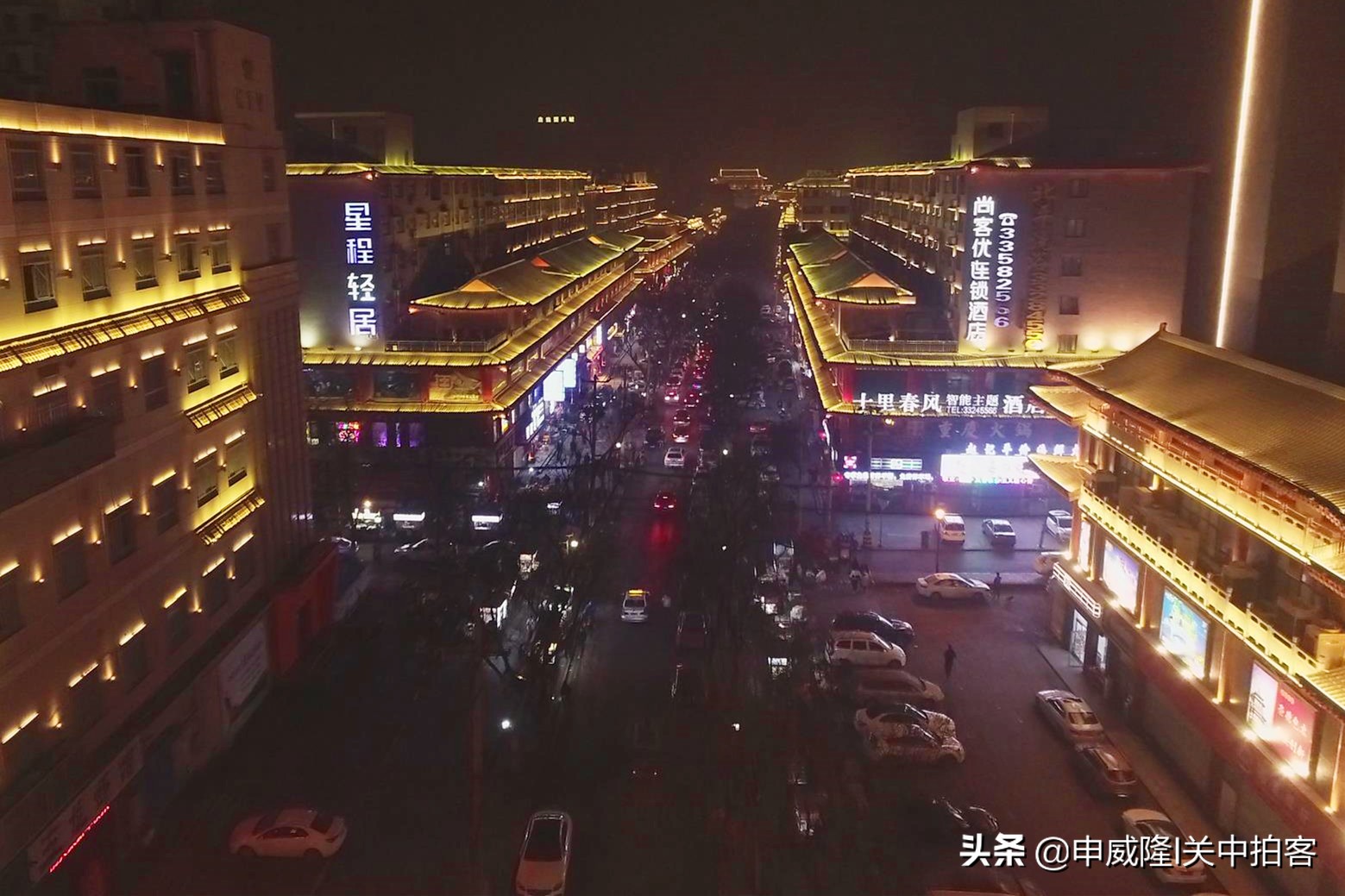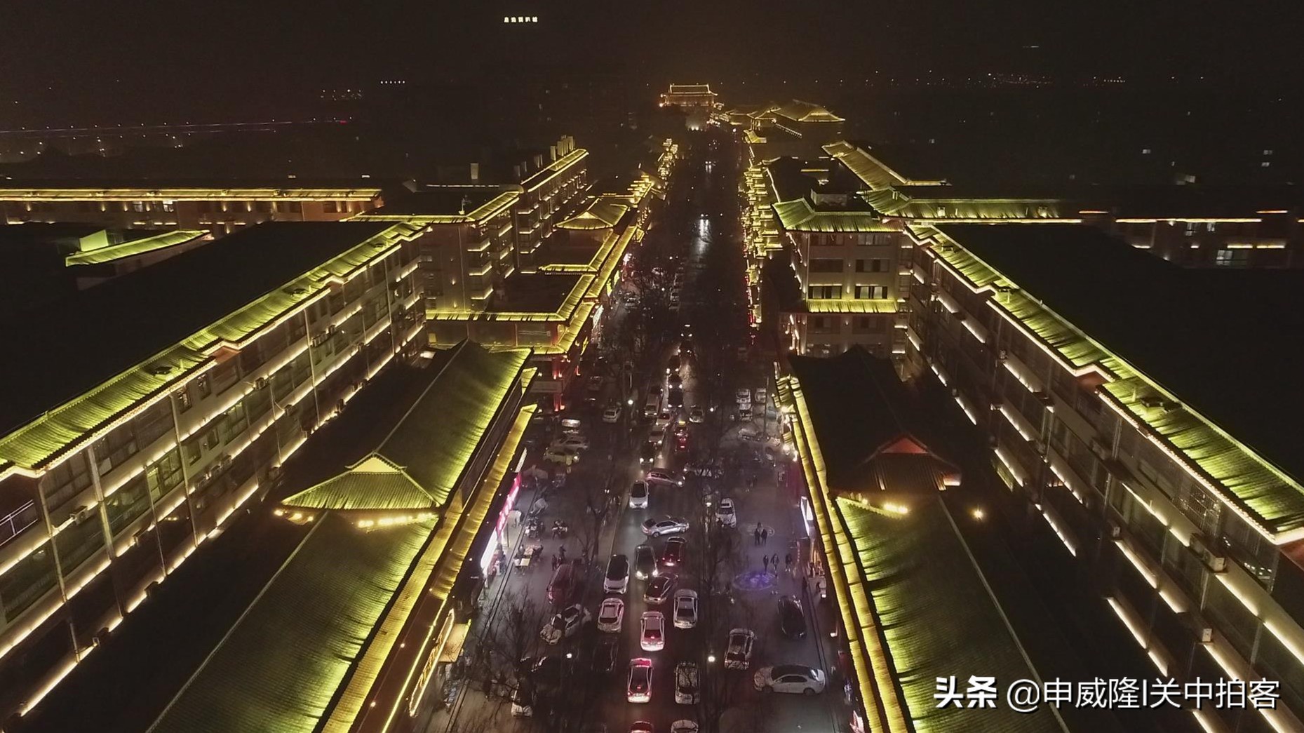 无人机从凤凰广场上起飞,越过写有“北平街”的仿古牌坊,沿着车水马龙的北平街向南飞去。灯火通明,热闹非凡,仿佛置身于西安大唐不夜城。