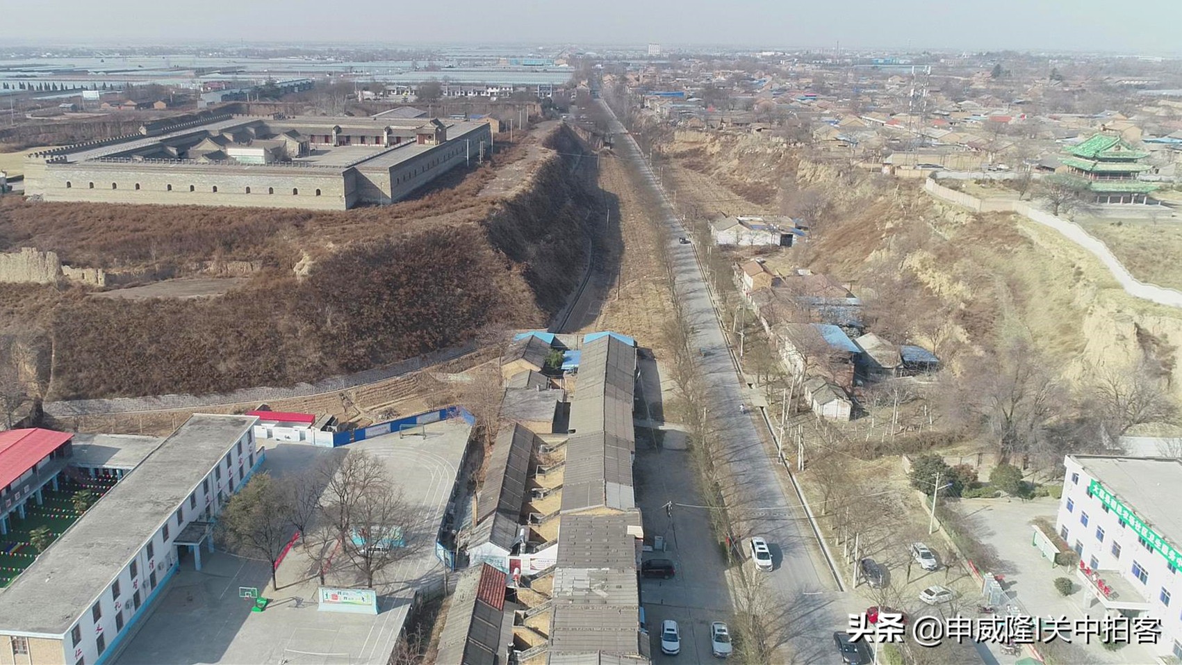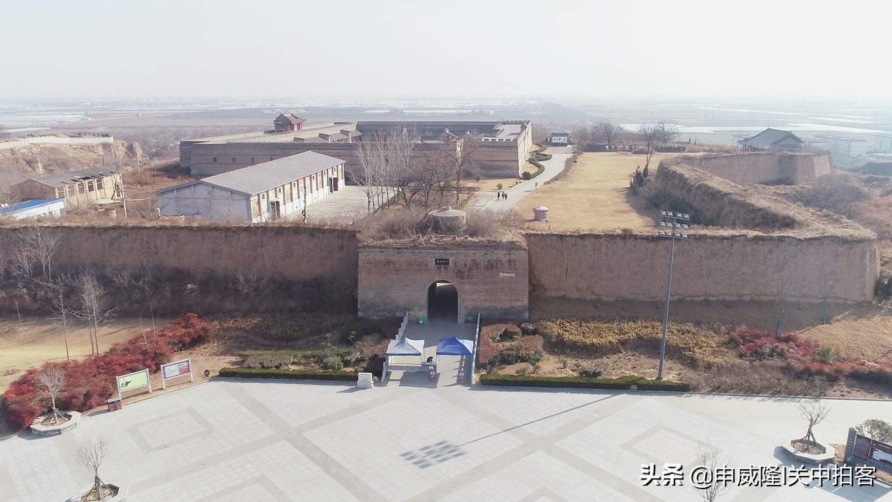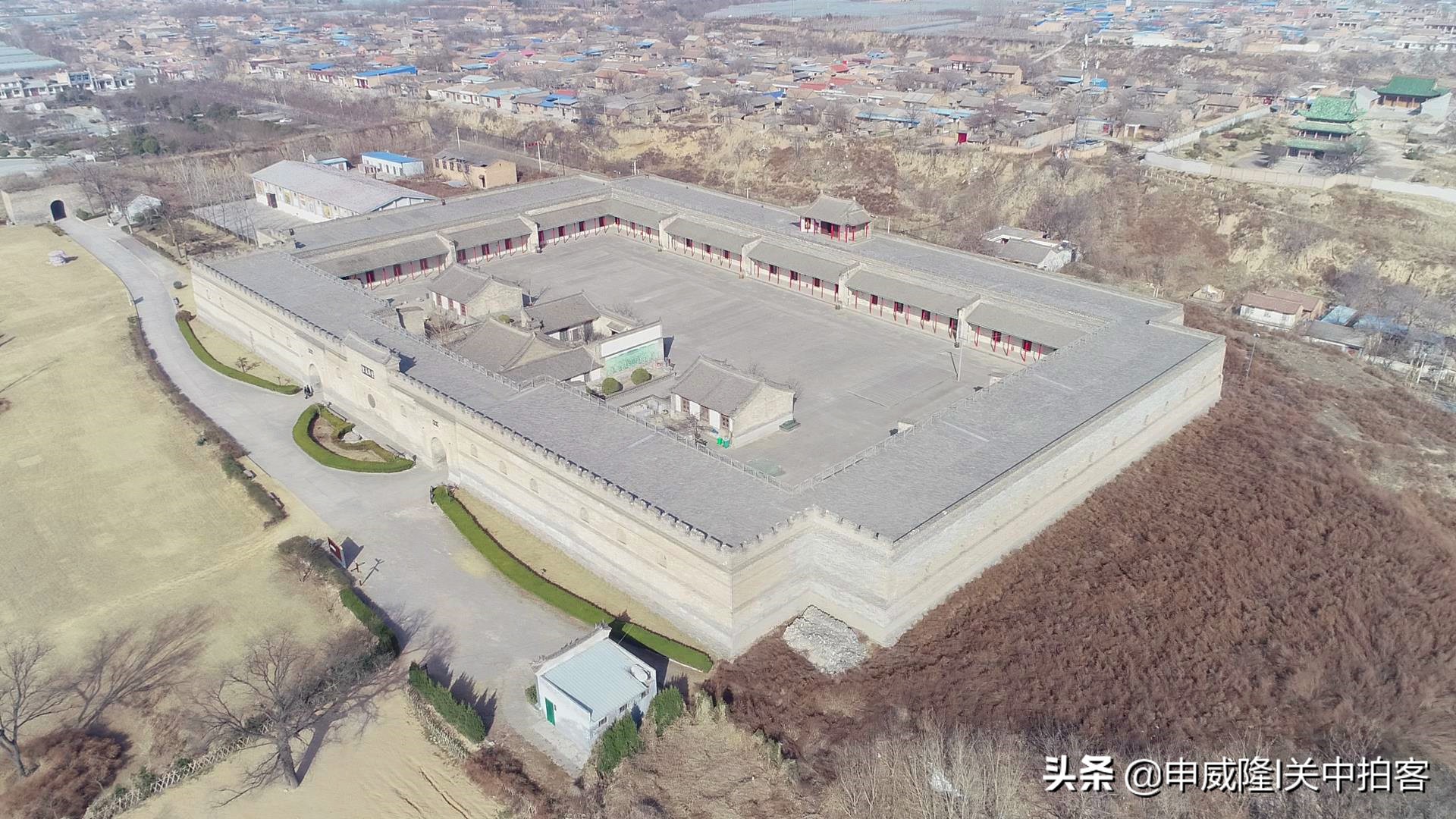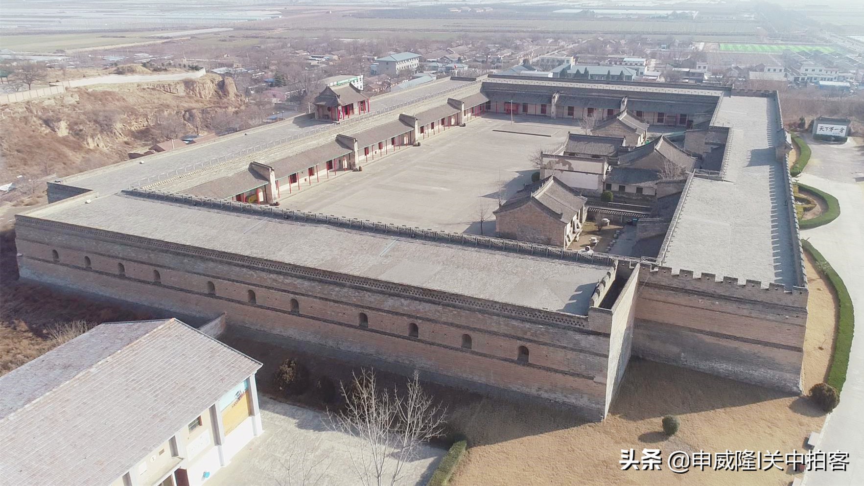 无人机从广场上升起,飞过阎敬铭的塑像后,丰图义仓便呈现在眼前。在粮仓主体建筑的外围,有一道半圆形的夯土寨墙,环绕于东、南、西三个方向。过去,在寨墙的外侧,还有一条壕沟;东侧寨墙中间,有一座雄伟的水门。现在,都已经消失了!