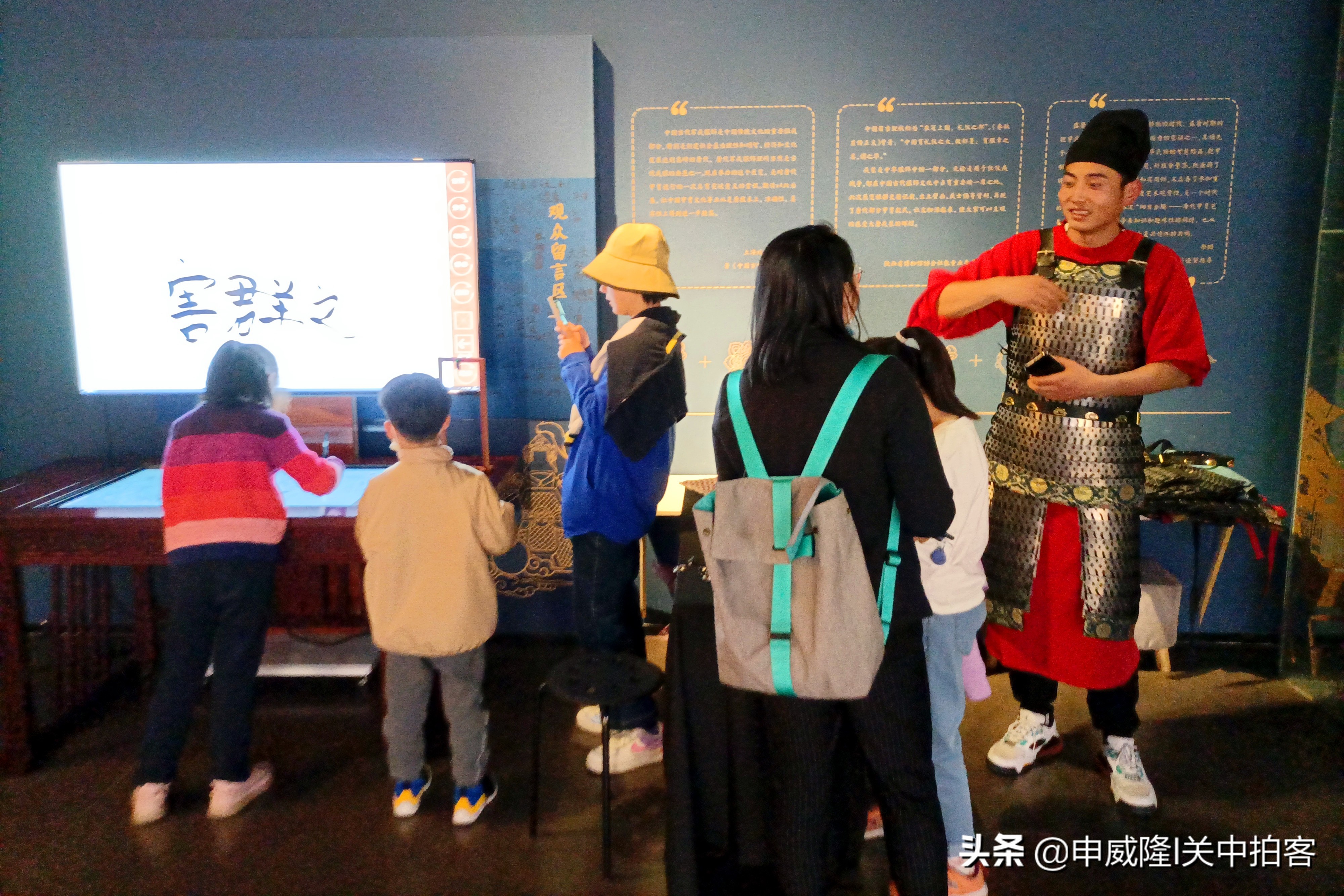 在展览的结尾处,身穿铠甲的男子,跟游客们进行互动,为大家讲解甲胄的历史知识,打破了现实世界与展览内容的壁垒。同时,可以在军戎诗画墙前拍照留念,还可以亲自参与“锁子甲”的编缀。