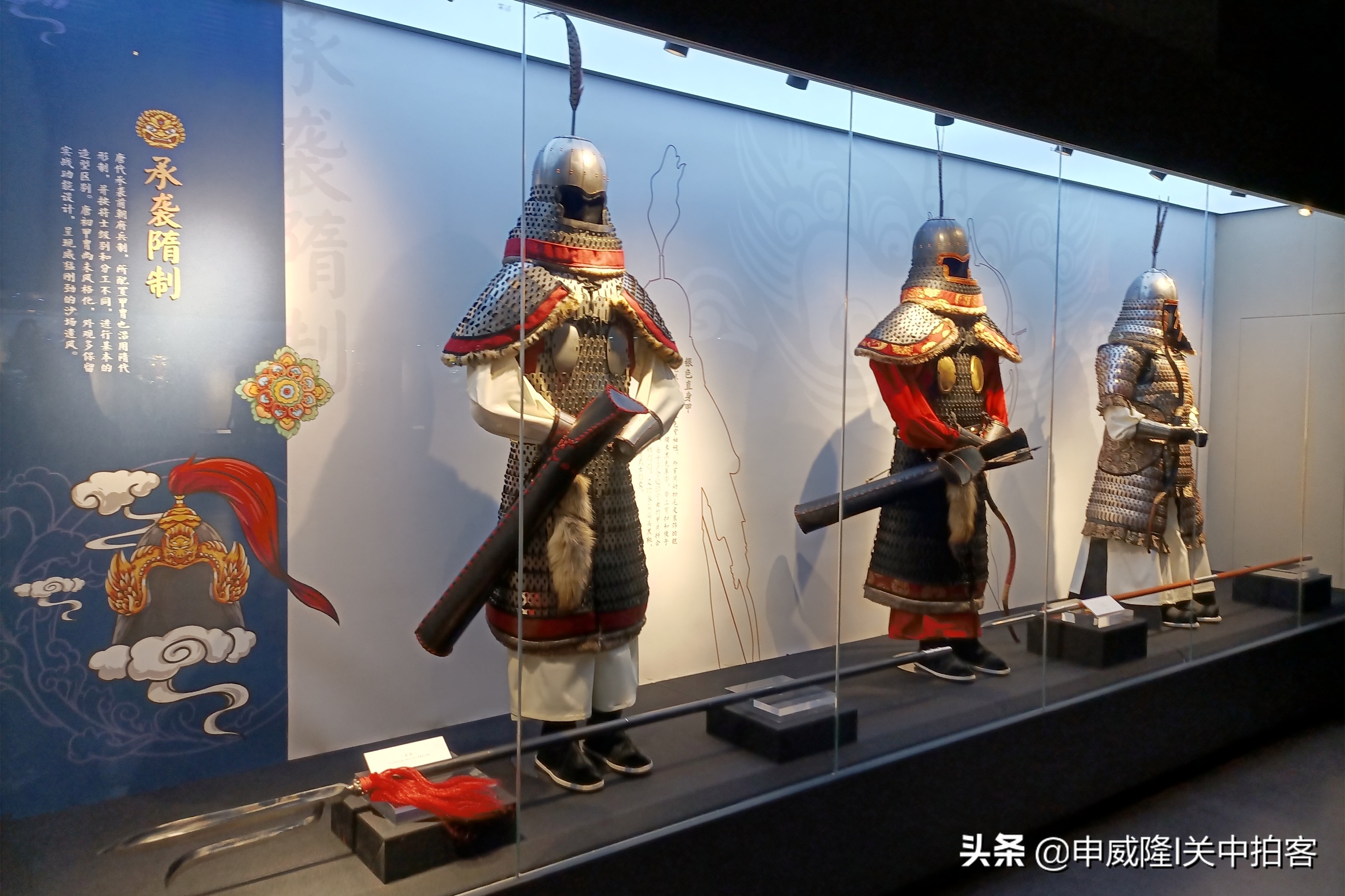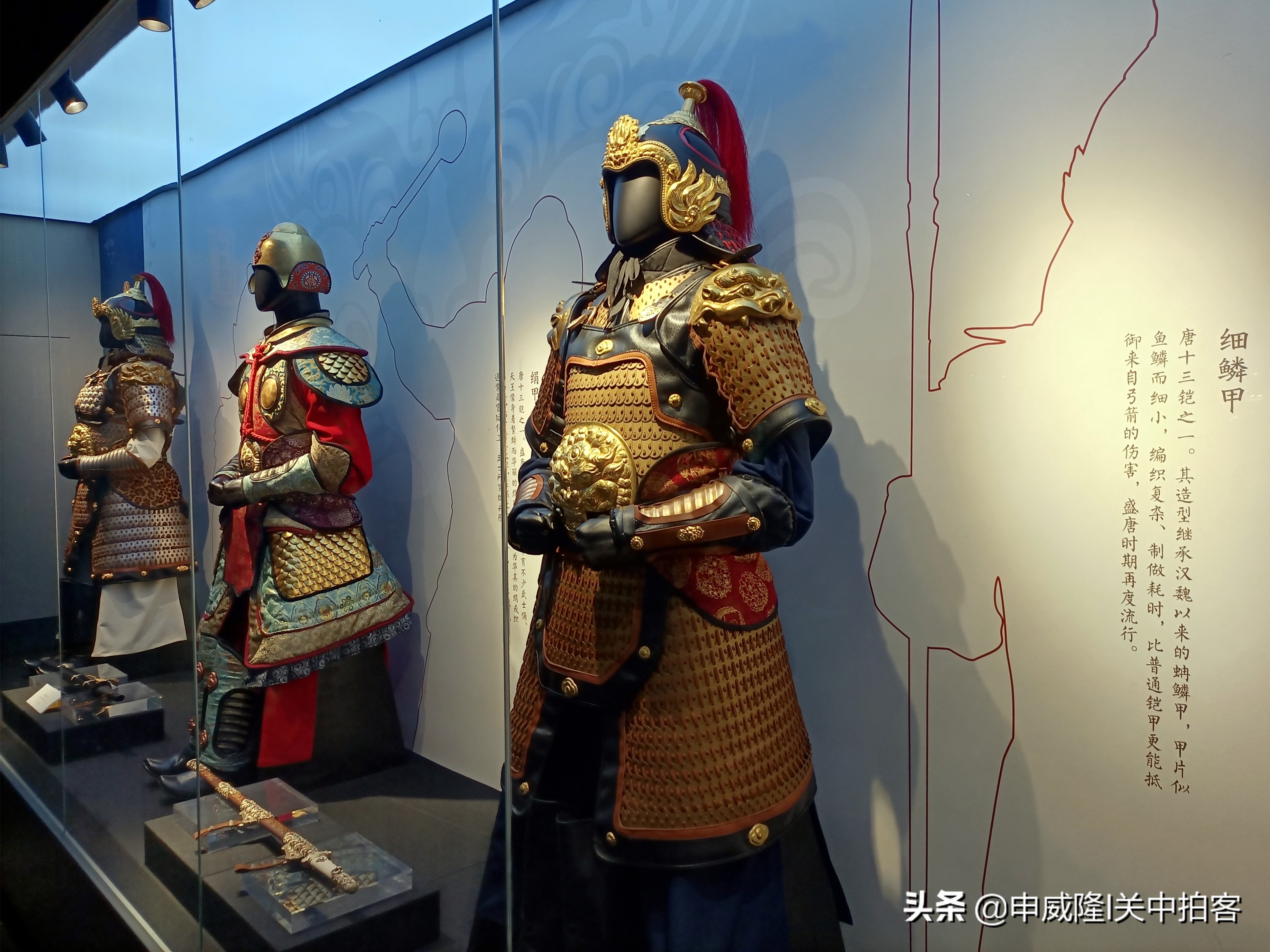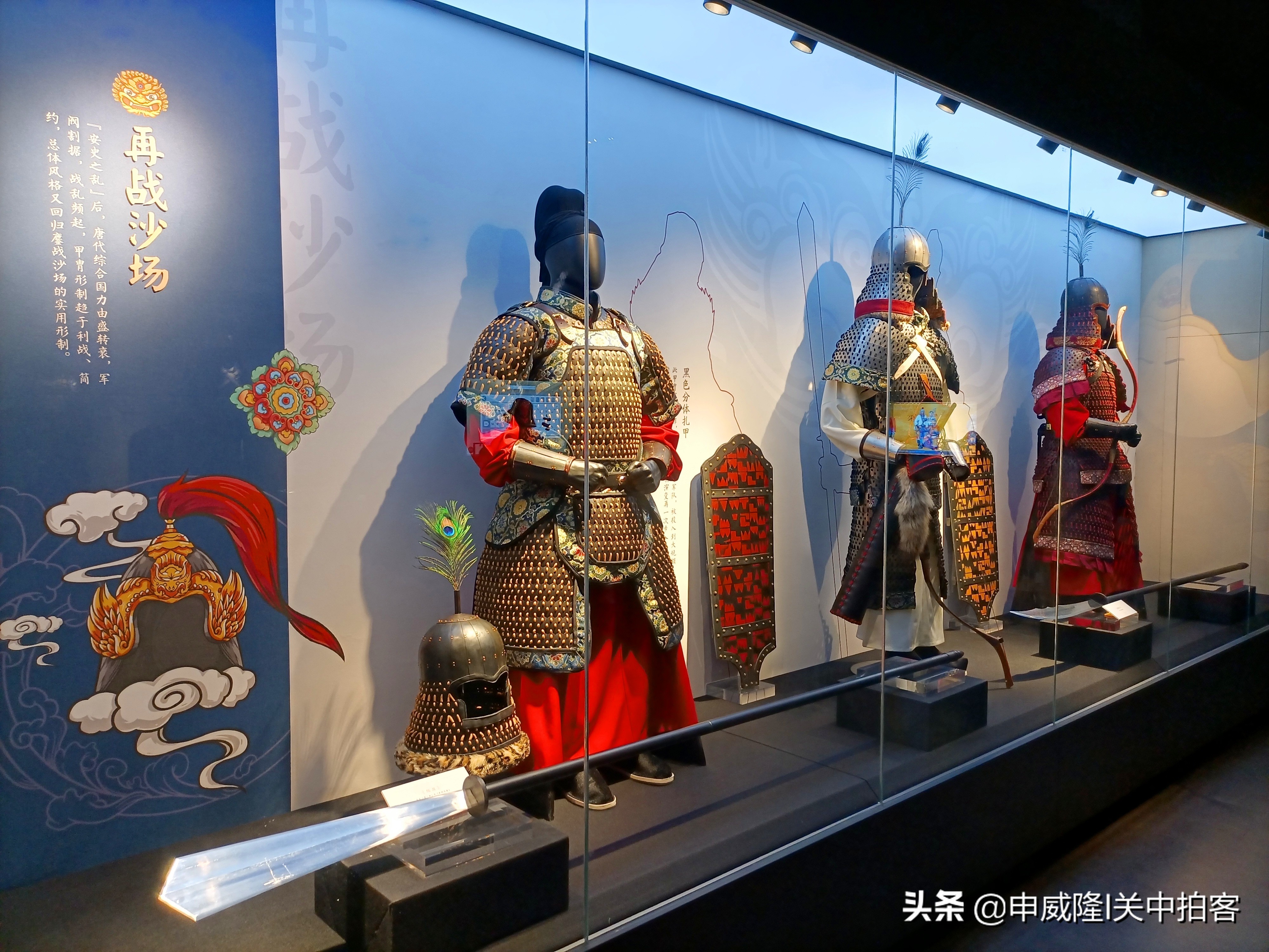 这个展览通过12套唐代甲胄的复原艺术品,结合唐墓壁画、陶俑、古籍等资料,展示了当时甲胄的形制、编缀、錾刻等严谨完善的工艺细节。