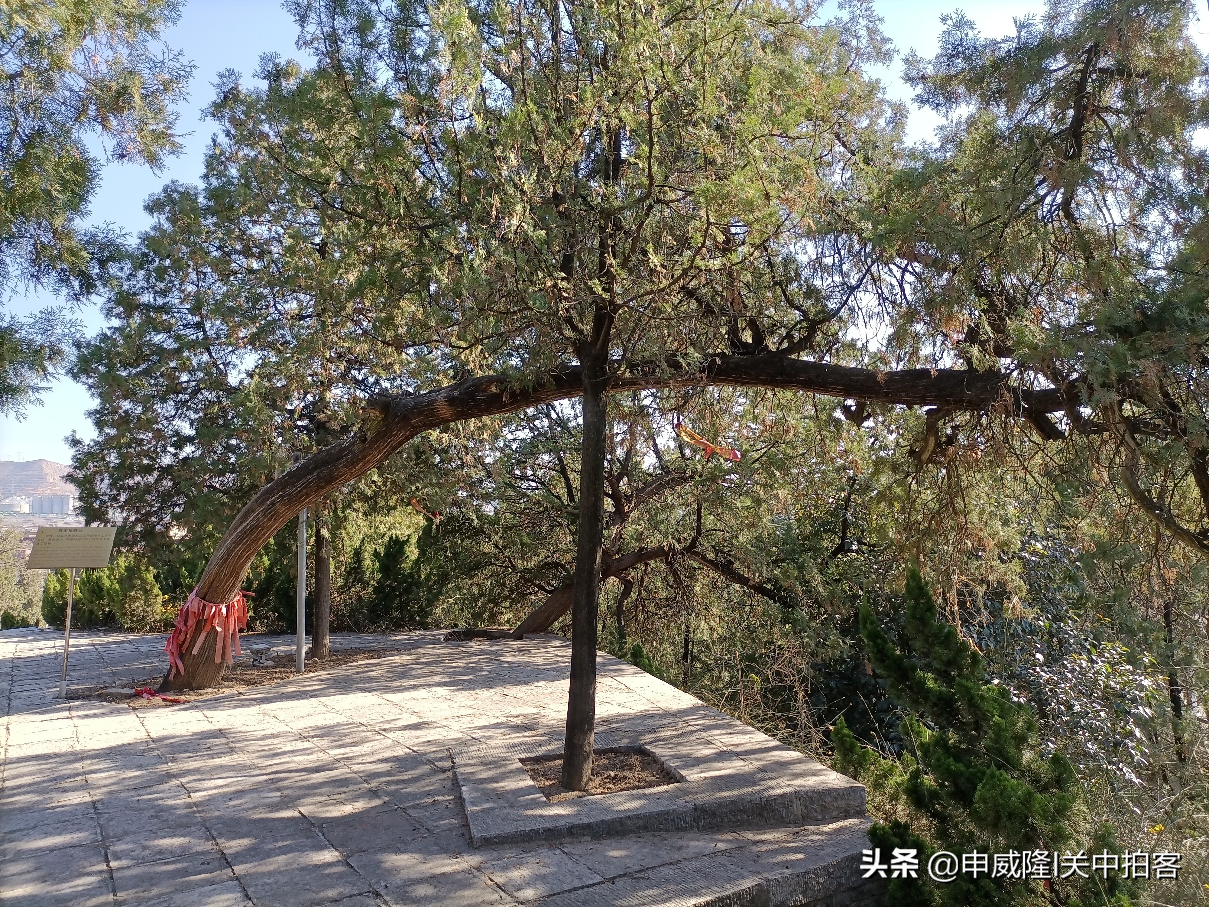 拾阶而上,登临台地,迎面是药王洗药池。旁边的山坡上,有药王挂药柏。相传,孙思邈曾经在这两株柏树上晾晒草药,树干被压弯,形成了卧柏。