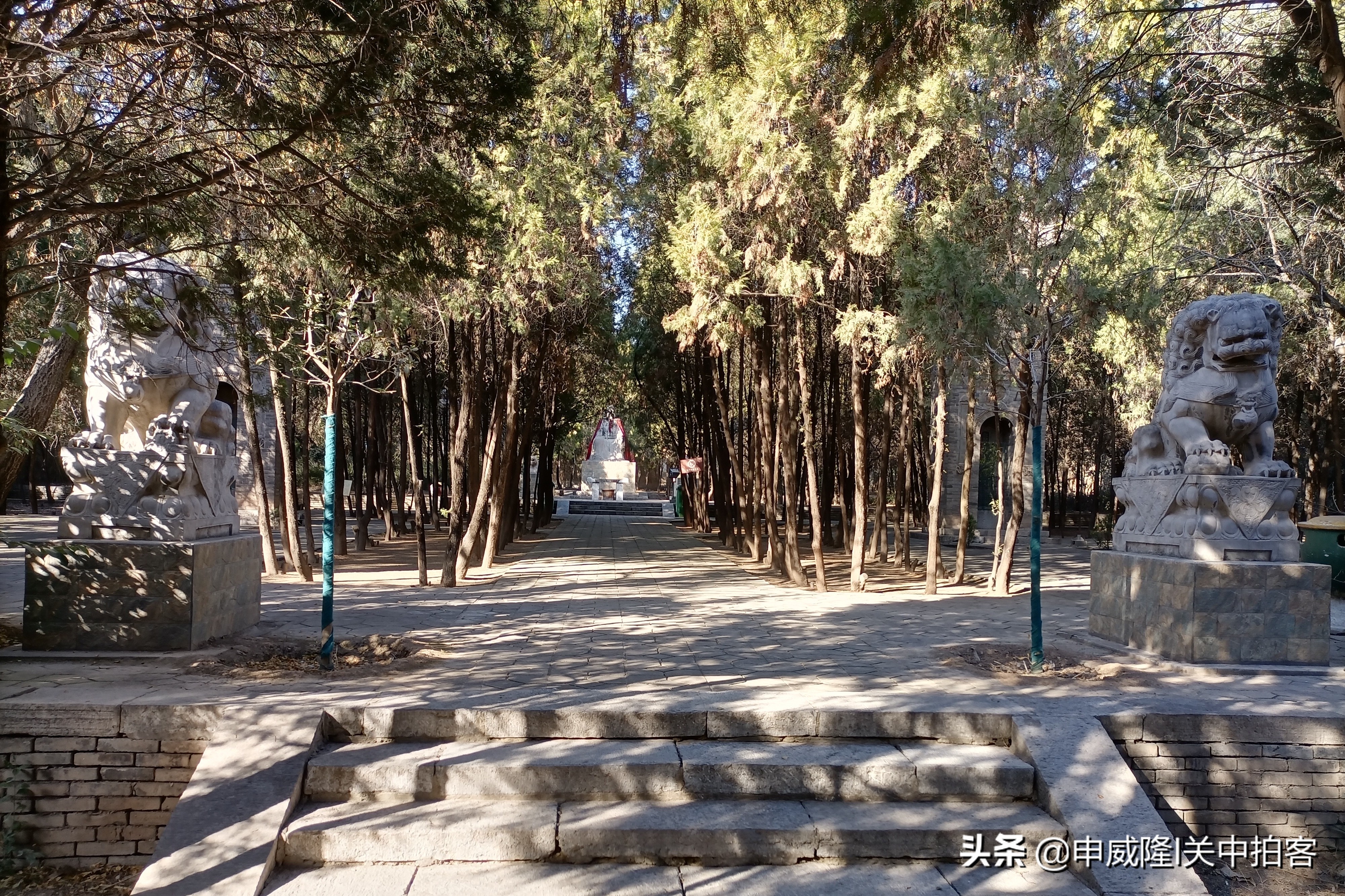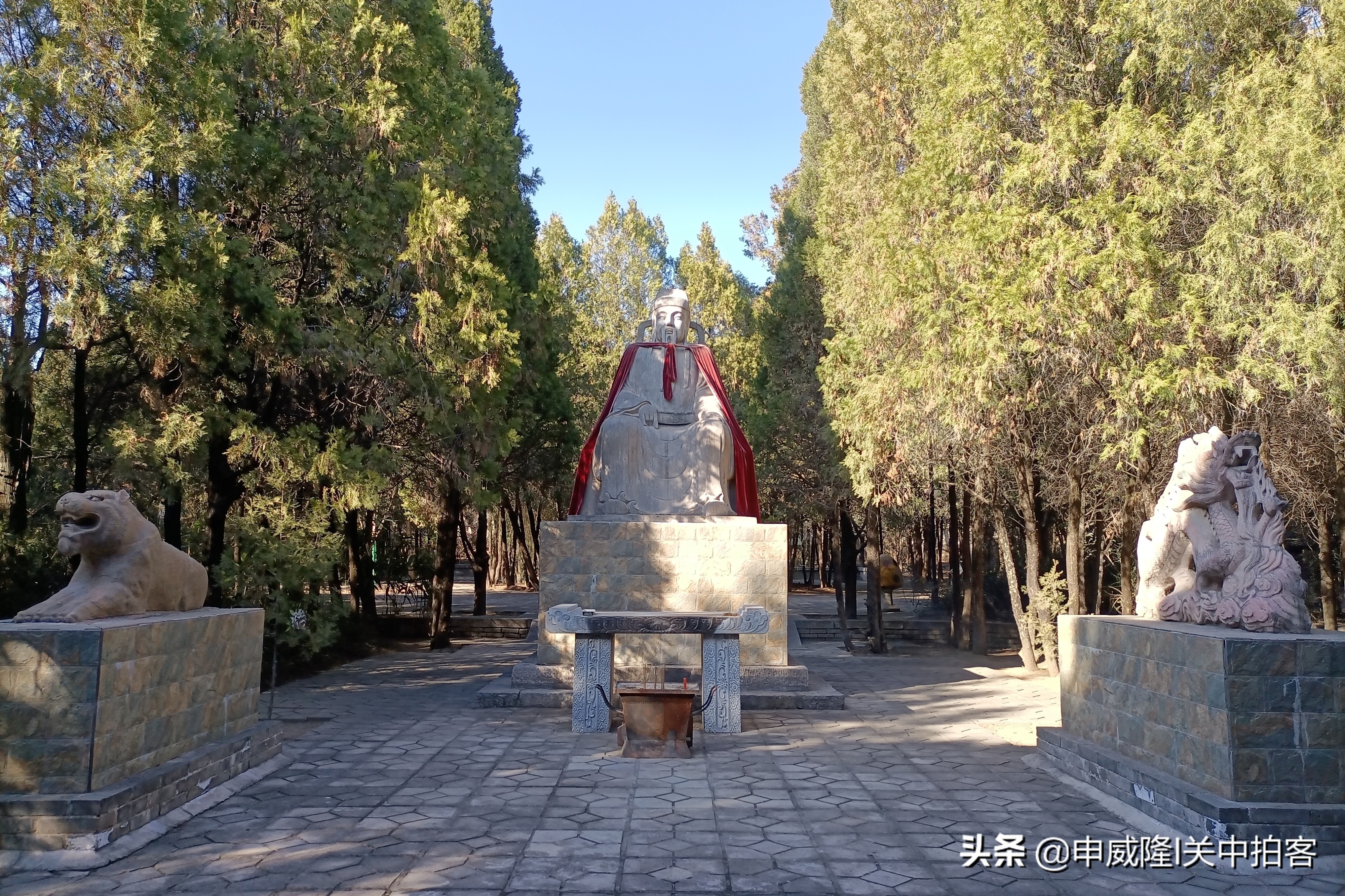 沿着墓园中间的道路,继续向前方行走,迎面是孙思邈像。他正襟危坐,身披红色斗篷,两侧卧着一条龙和一只虎。在这尊塑像的后方,就是孙思邈的墓葬了。