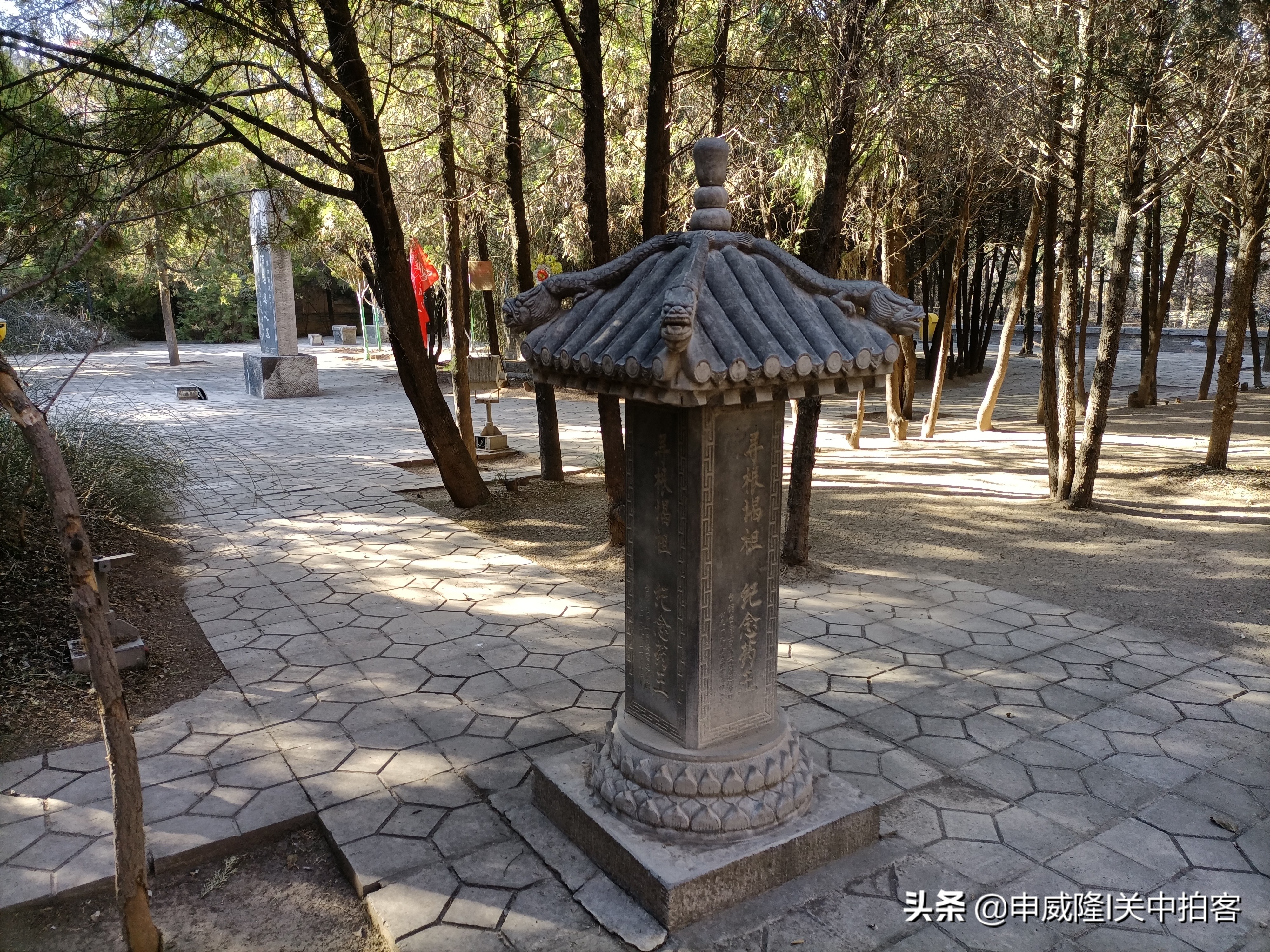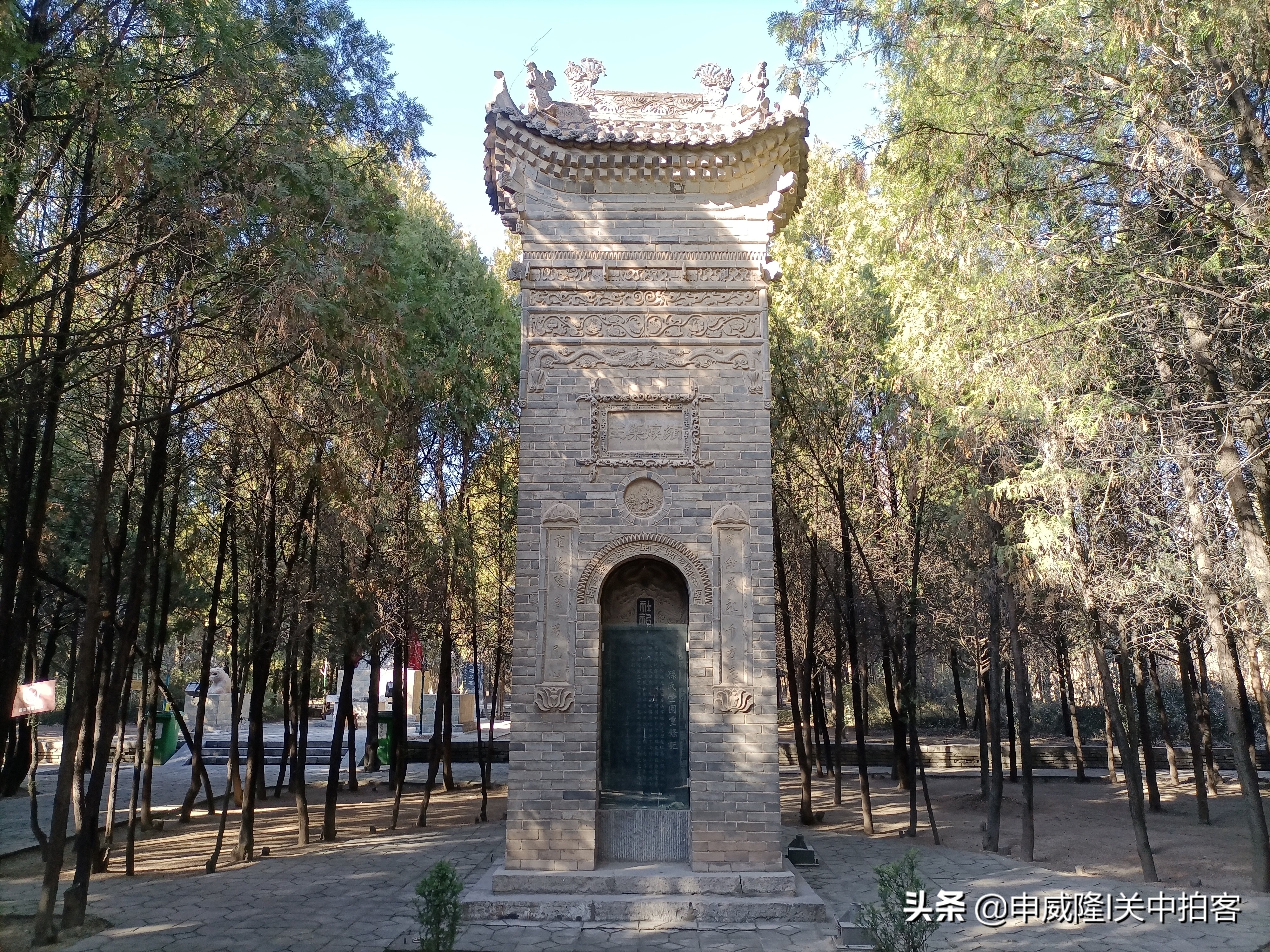 在墓园前方东西两侧的树林之中,可以看到1992年3月5日竖立的《孙氏茔园重修记》碑和清代同治十一年(1872)竖立的《唐代敕封妙应真人圣神之先茔碑》。两块石碑外侧都修建着精美的碑楼,青砖打磨雕刻而成,高约6.5米,宽约2米,厚约1.5米。