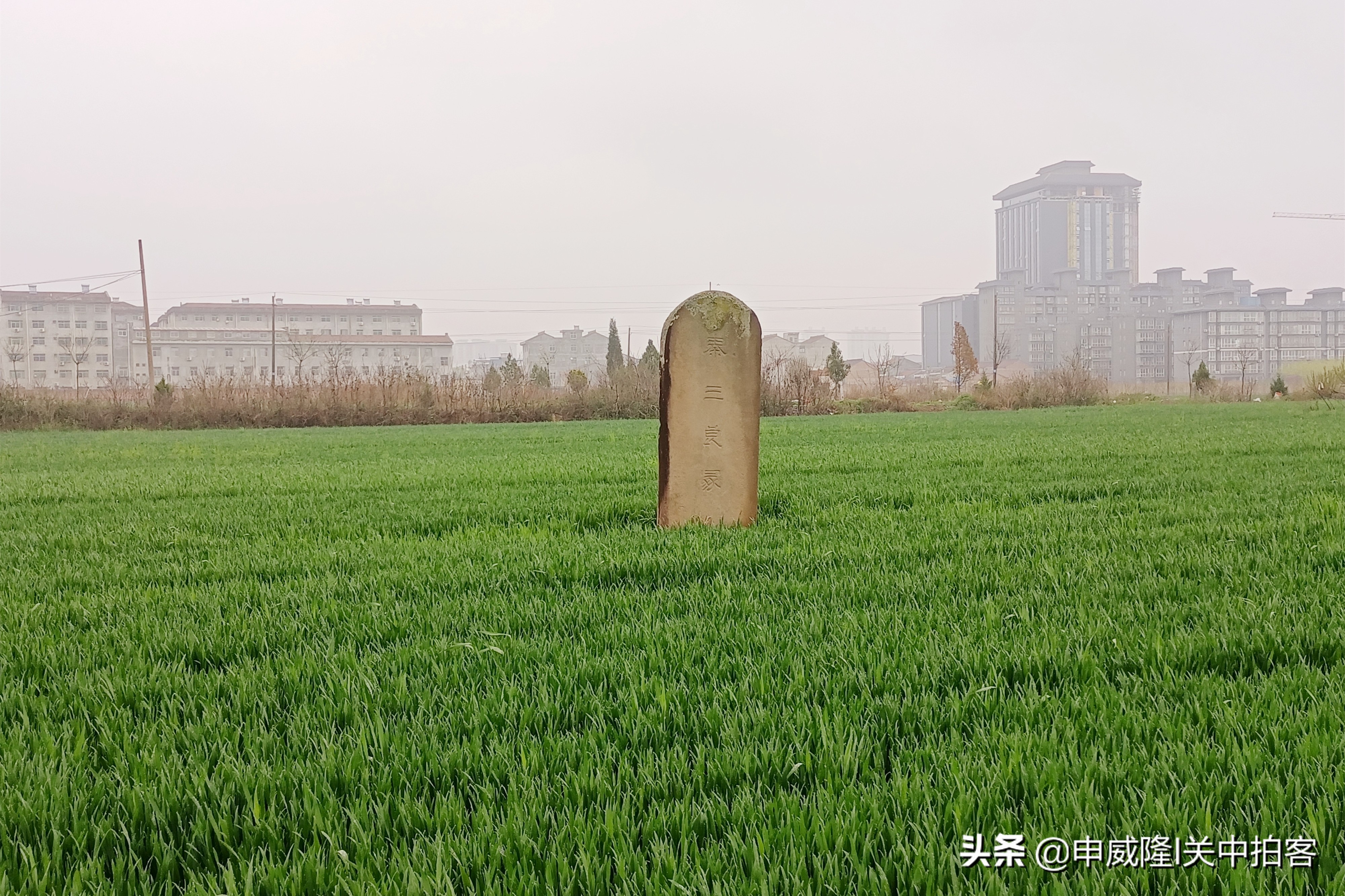 中午,冒着蒙蒙的细雨,我们开车到达翟家寺村。顺着水泥路,穿过村庄后,在东边道路南侧的田野里,可以看到一座高耸的石碑。周围空空荡荡,什么也看不到,所以那里应该就是传说中的“秦三良冢”遗址了!