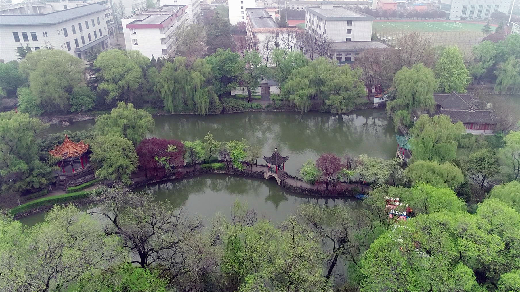 无人机飞过南侧新建的外湖,便来到古老的内湖上方。这里以“古饮凤池”为中心,以两段石桥和三块岛屿为界,将湖面分为南、中、北三个部分。