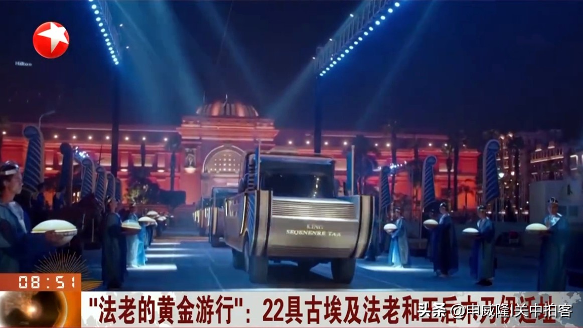 这22具木乃伊被分别安放在22辆古埃及风格的花车上,每一辆花车的前方都醒目地写着这位法老和皇后的名字,包括著名的塞格嫩拉·陶二世、拉美西斯二世、哈特谢普苏特女王等。