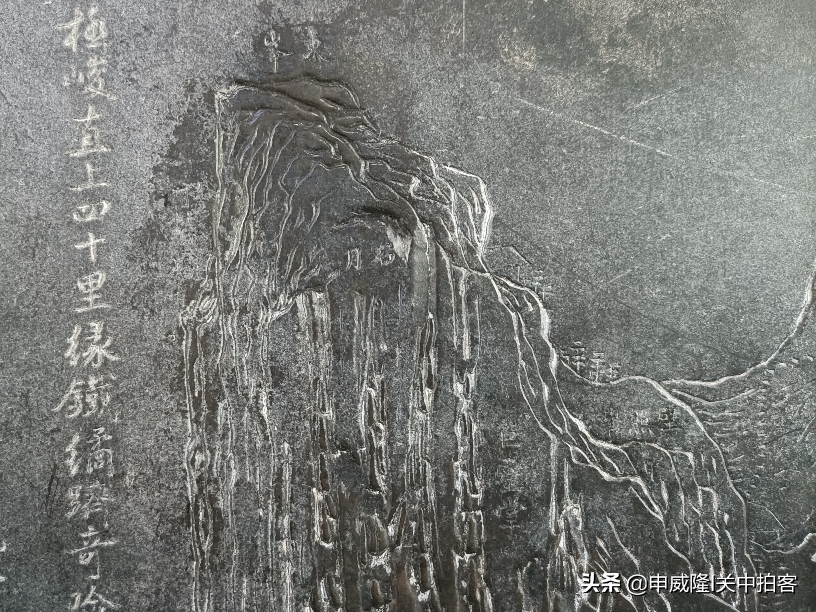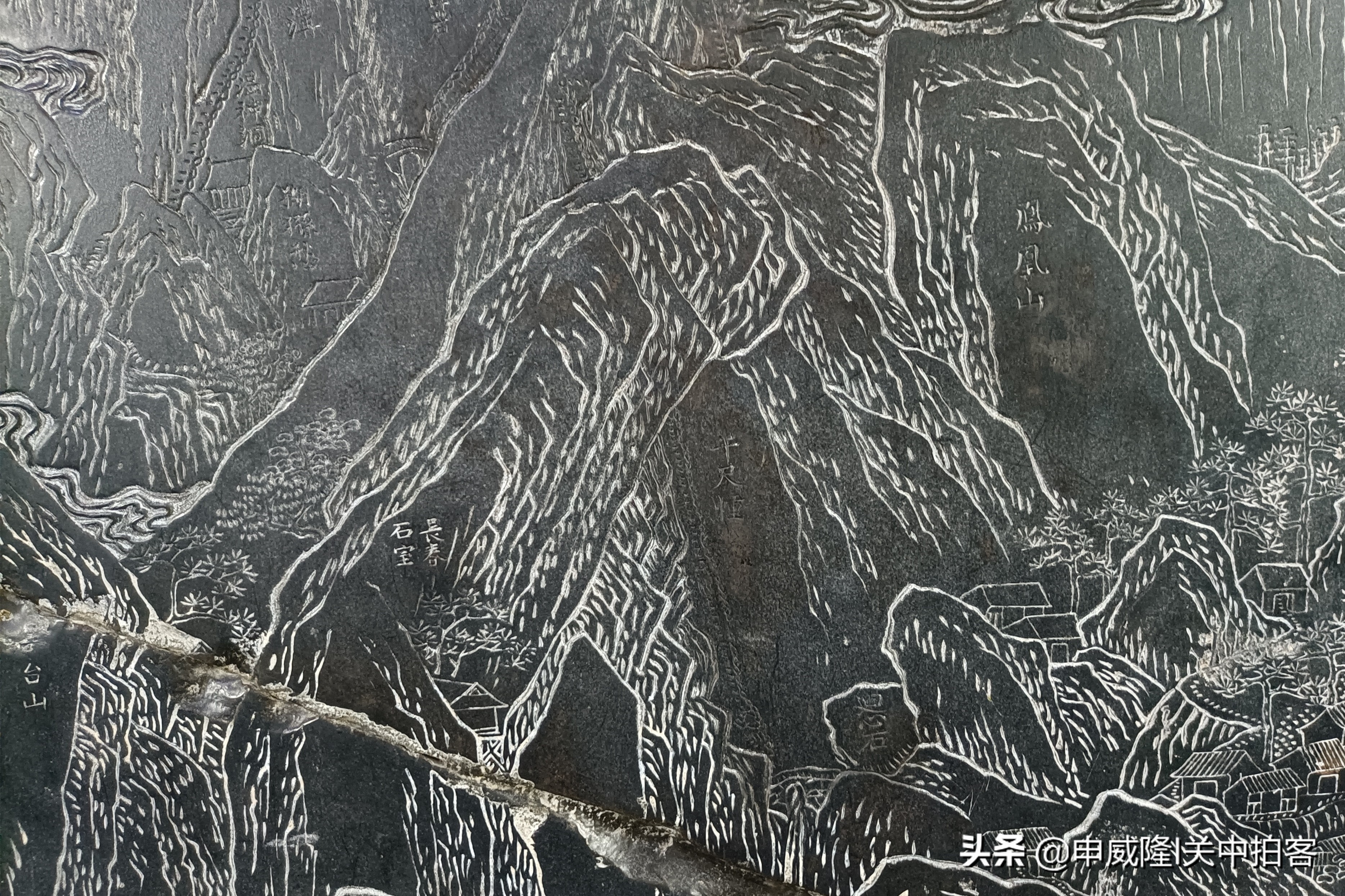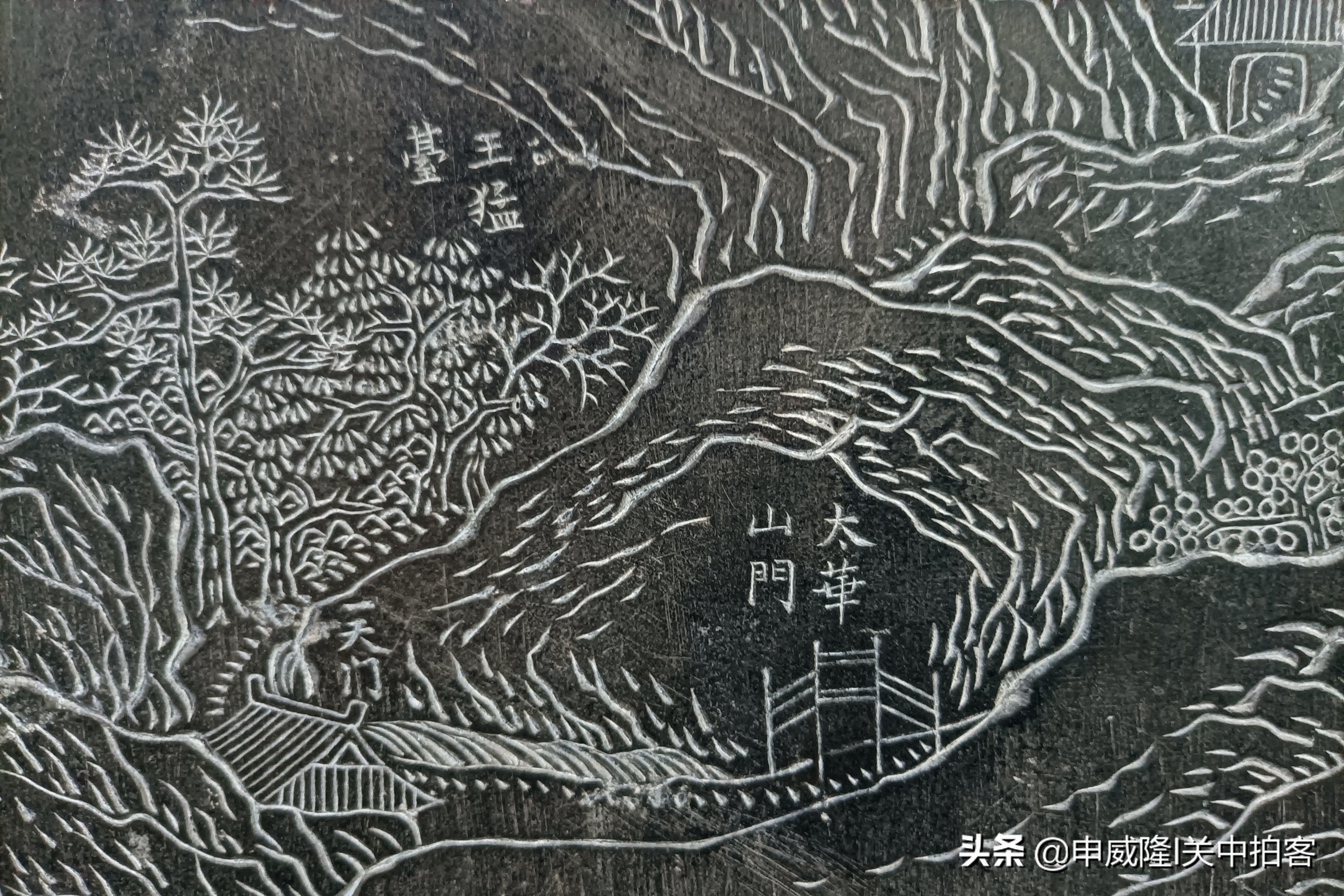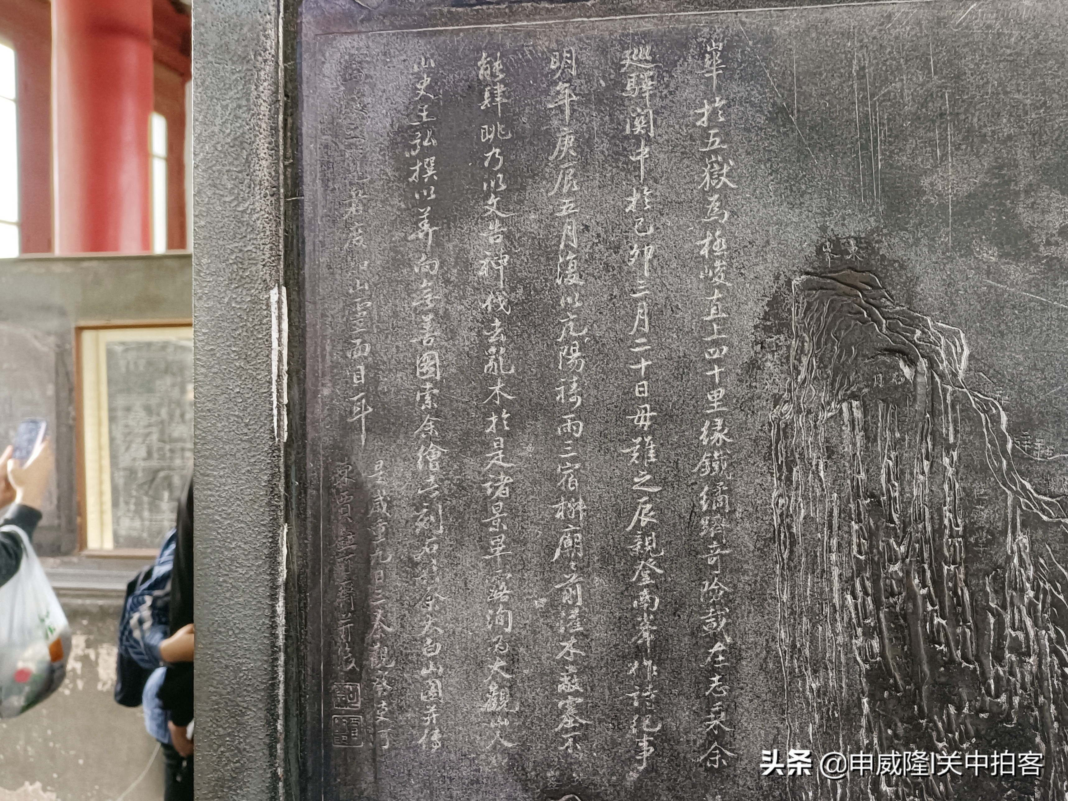 石碑左上角有大量文字记载道:“华于五岳为极峻,直上四十里,缘铁繘,跻奇险,载在志乘。余巡驿关中,于已卯三月二十日母难之辰,亲登南峰,作诗纪事。明年庚辰五月复以亢阳祷雨,三宿椒庙。庙前灌木蔽塞,不能肆眺,乃以文告神,伐去乱木。于是,诸景毕露,洵为大观。山人山史王弘撰以华向无善图,索余绘此刻石,与余太白山图并传焉。后之览者,庶知山灵面目耳。”