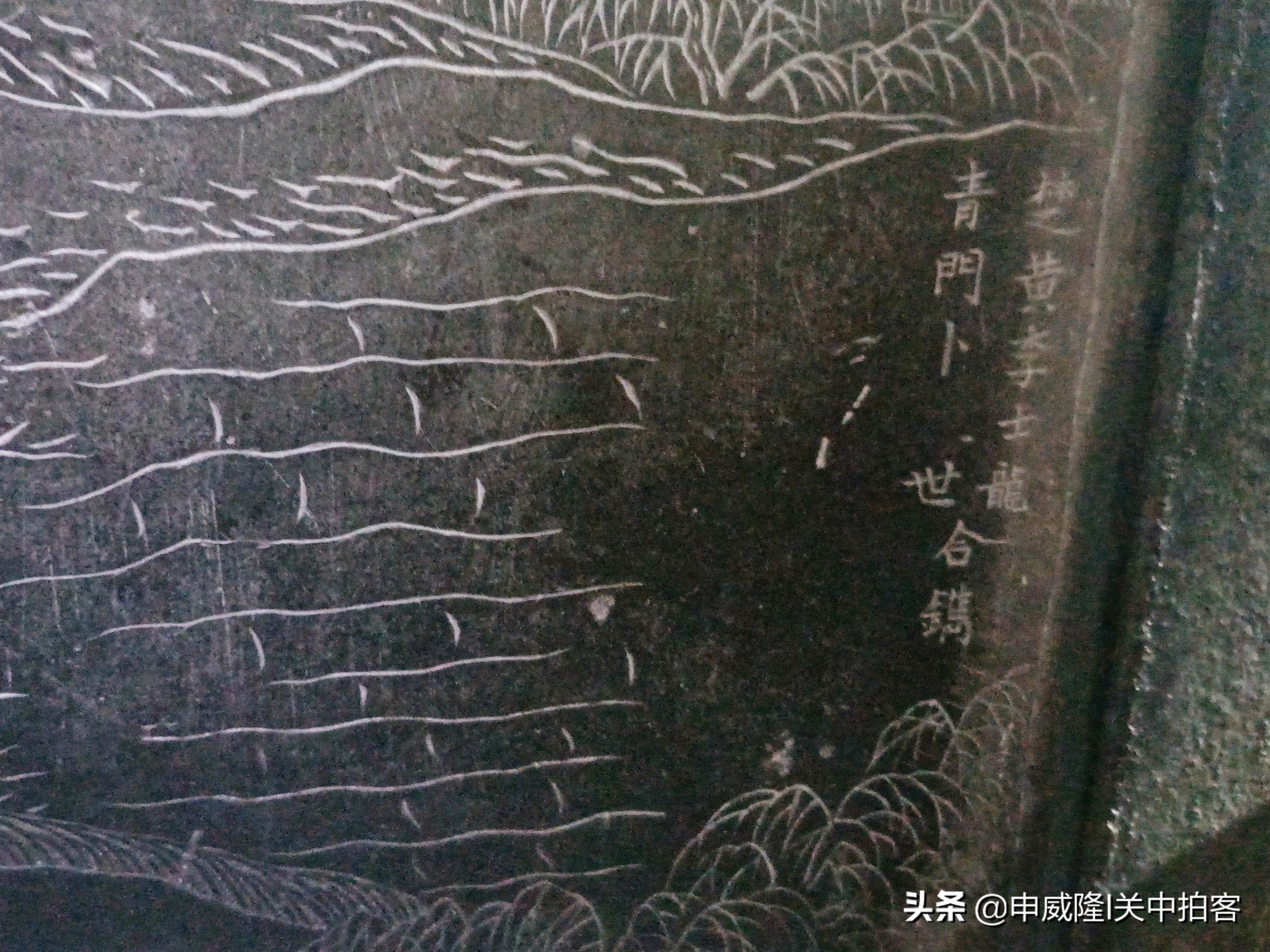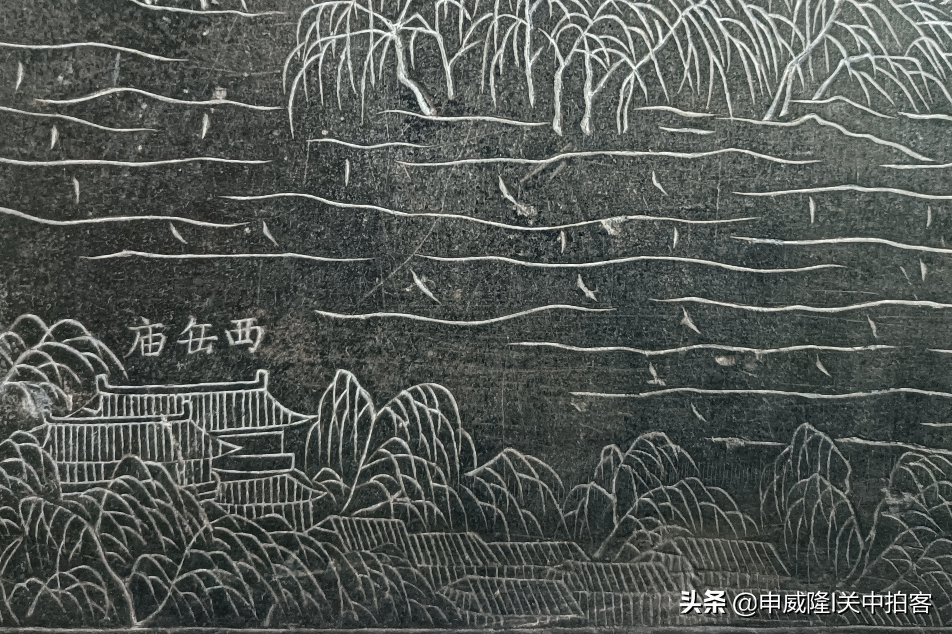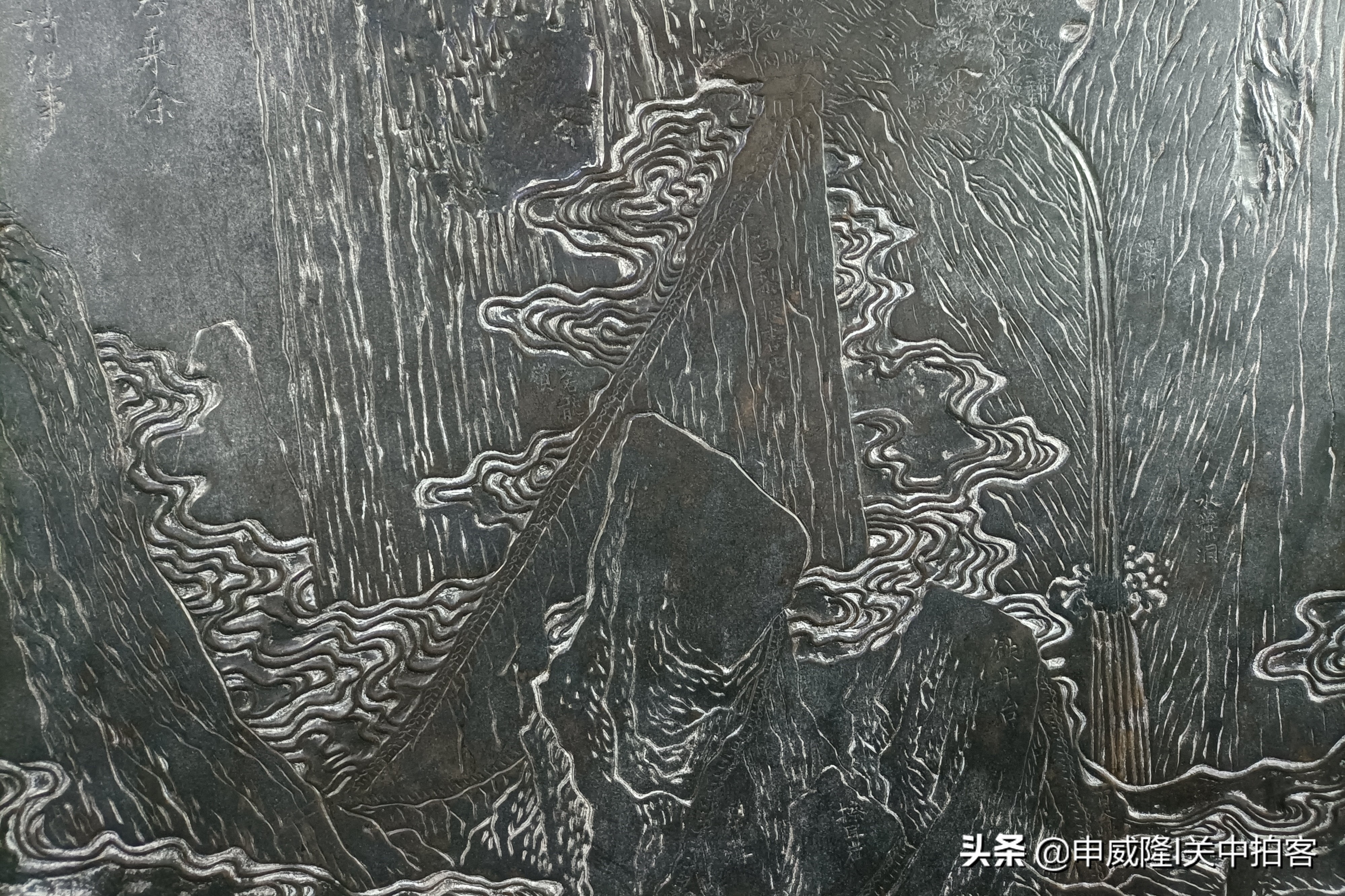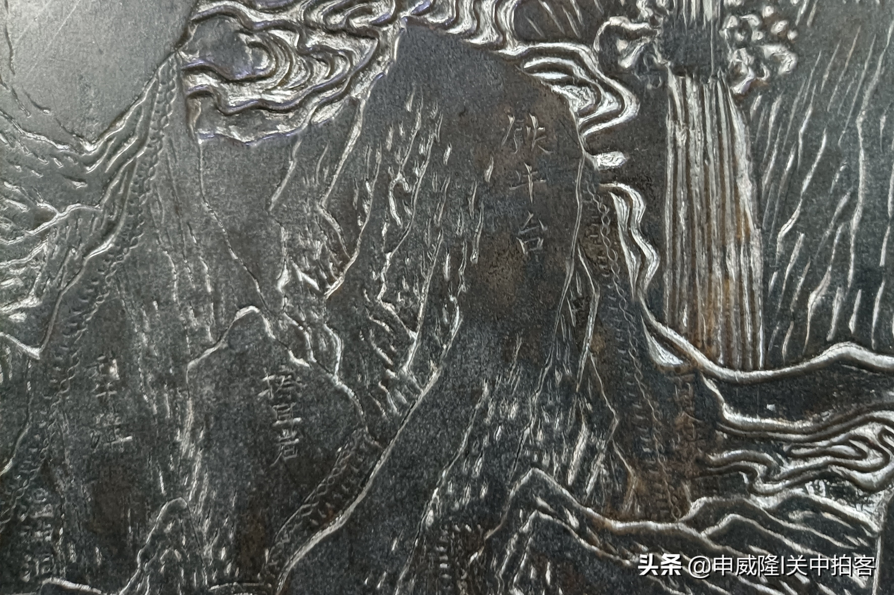石碑左上角有大量文字记载道:“华于五岳为极峻,直上四十里,缘铁繘,跻奇险,载在志乘。余巡驿关中,于已卯三月二十日母难之辰,亲登南峰,作诗纪事。明年庚辰五月复以亢阳祷雨,三宿椒庙。庙前灌木蔽塞,不能肆眺,乃以文告神,伐去乱木。于是,诸景毕露,洵为大观。山人山史王弘撰以华向无善图,索余绘此刻石,与余太白山图并传焉。后之览者,庶知山灵面目耳。”