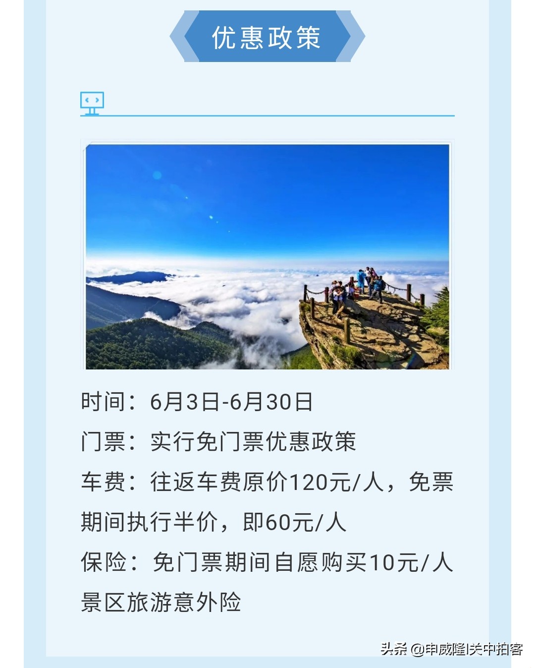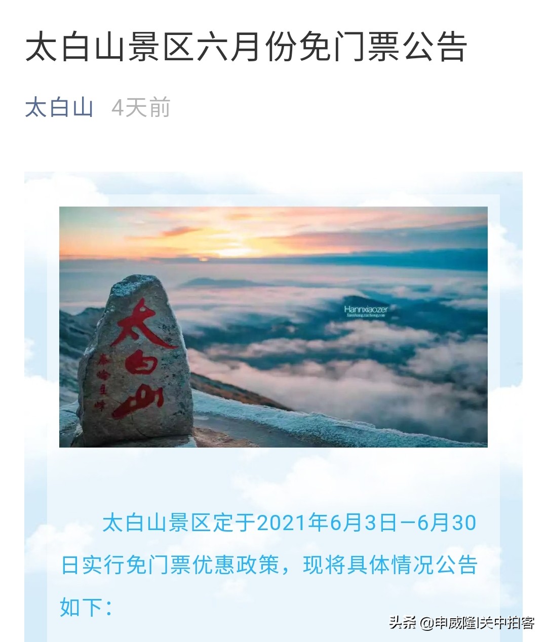 6月2日,在太白山景区的微信公众平台上,我看到《太白山景区六月份免门票公告》说道:6月3日至6月30日,太白山景区实行免门票优惠政策。