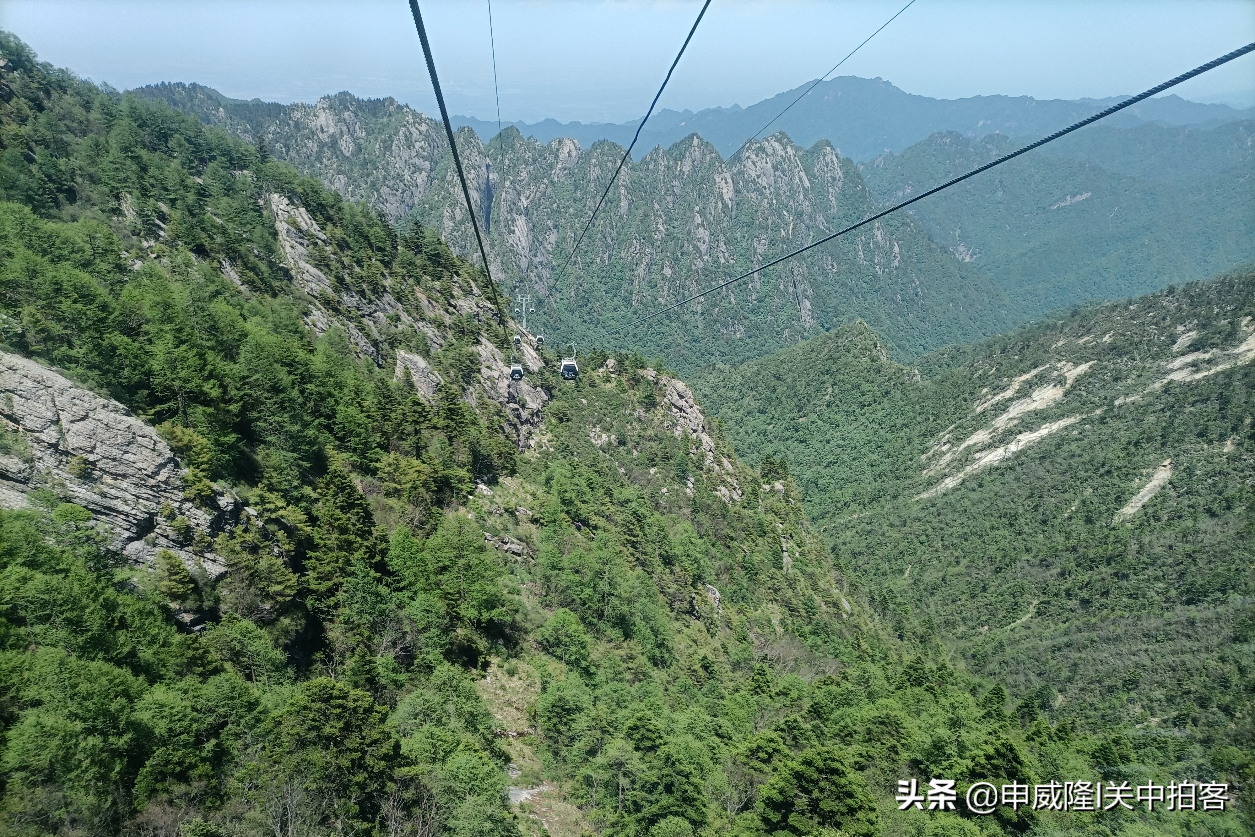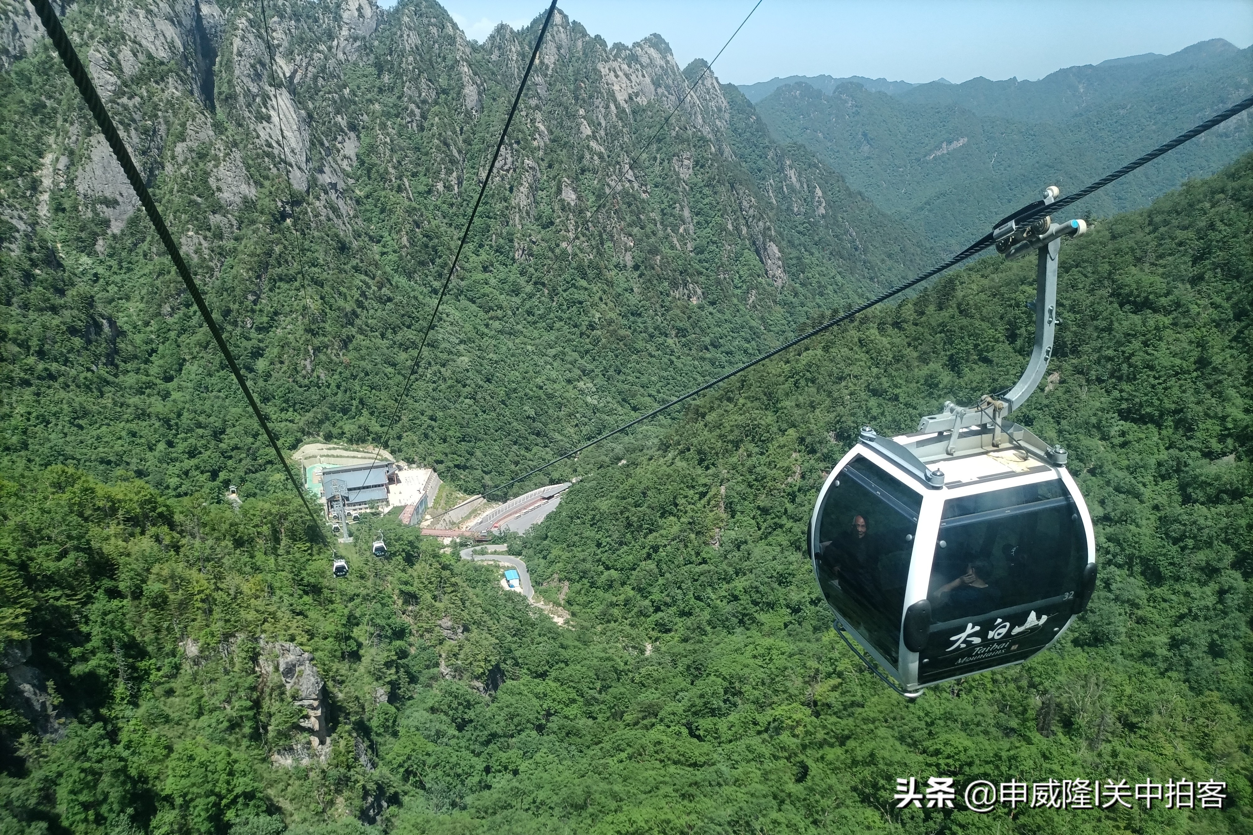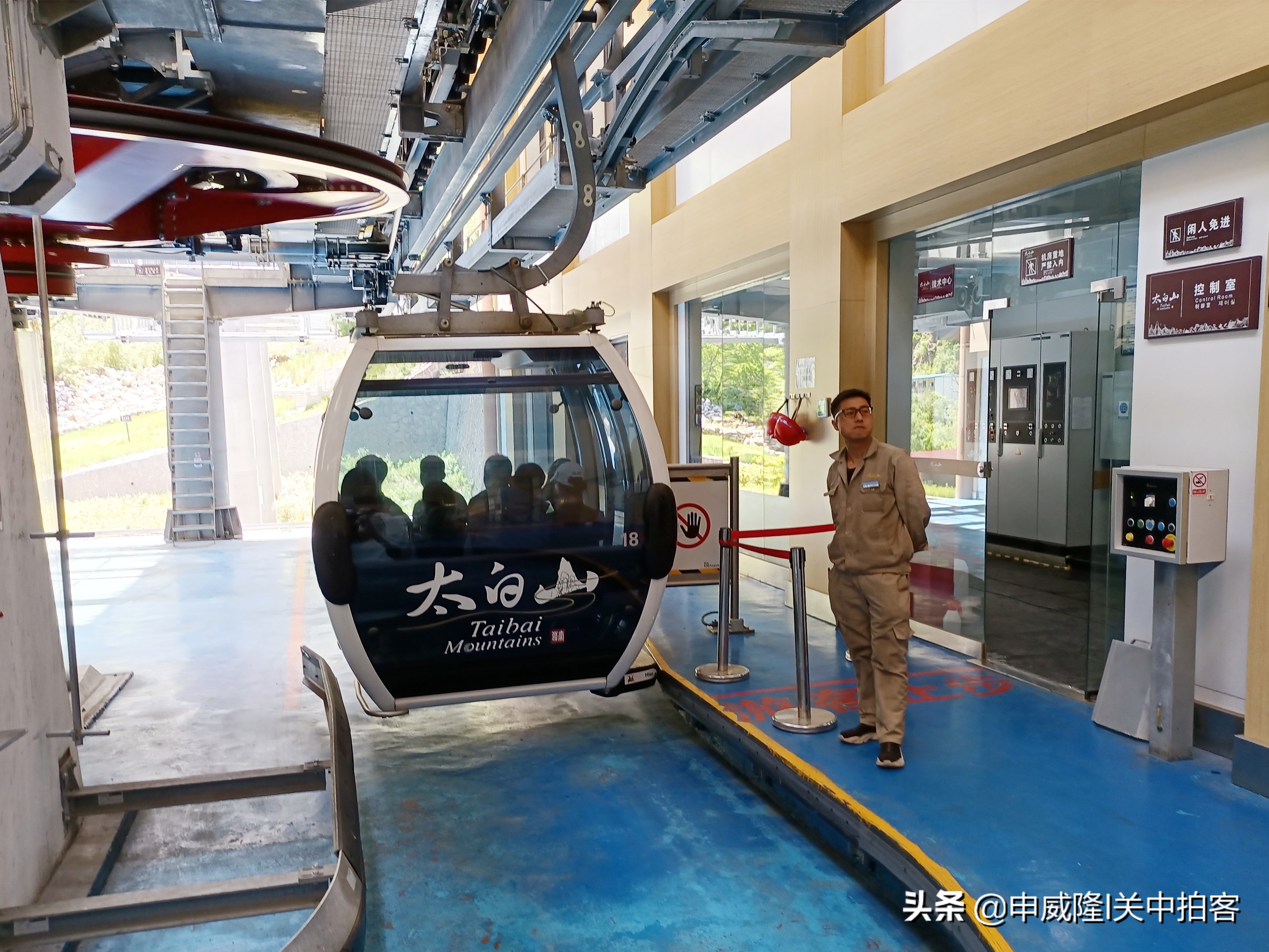 我们登上二楼,排队刷票进入,按照次序登上缆车,跟另外一个家庭共坐一个车厢。据说,这条天下索道是全国最大的客运索道之一,采用奥地利多贝玛亚公司制造的索道设备,号称为:“乘天下索道 观太白绝景”。