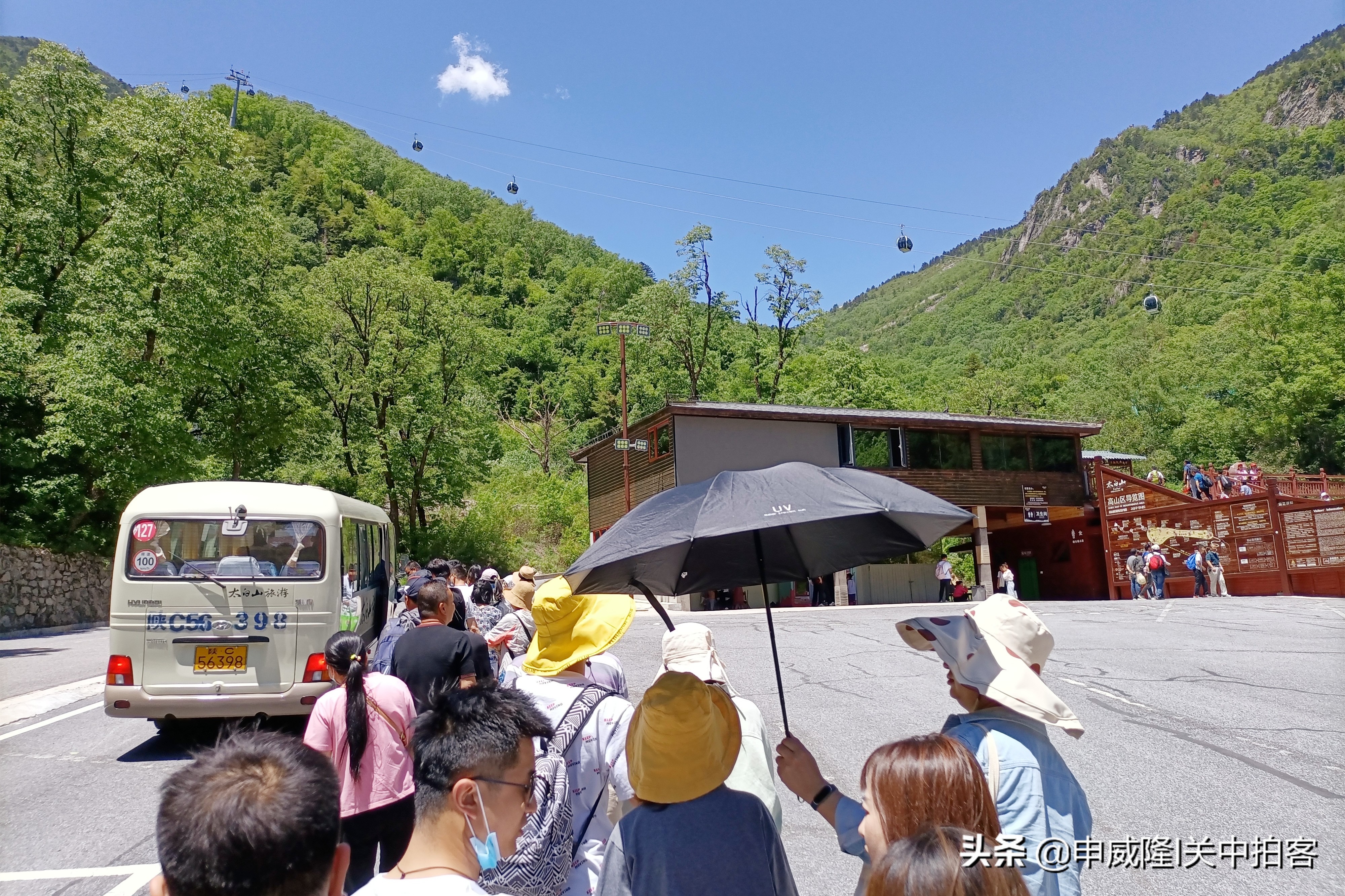 6月5日清晨,从咸阳市出发,经过高速公路,我们很快到达太白山下的游客服务中心,在这里排队购买10元/人的保险费和60元/人的公交费。然后,乘坐旅游大巴车,进入太白山景区。
