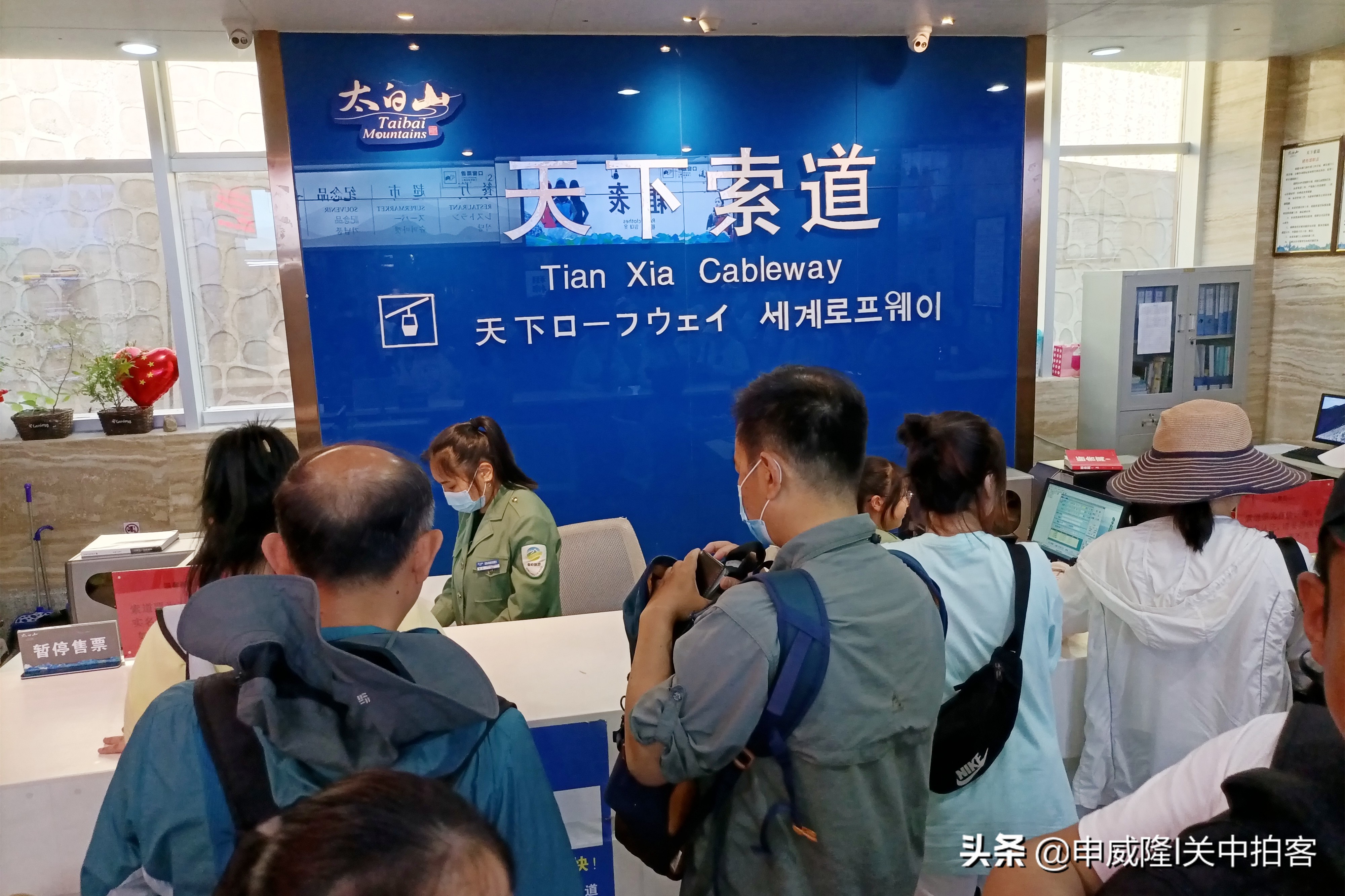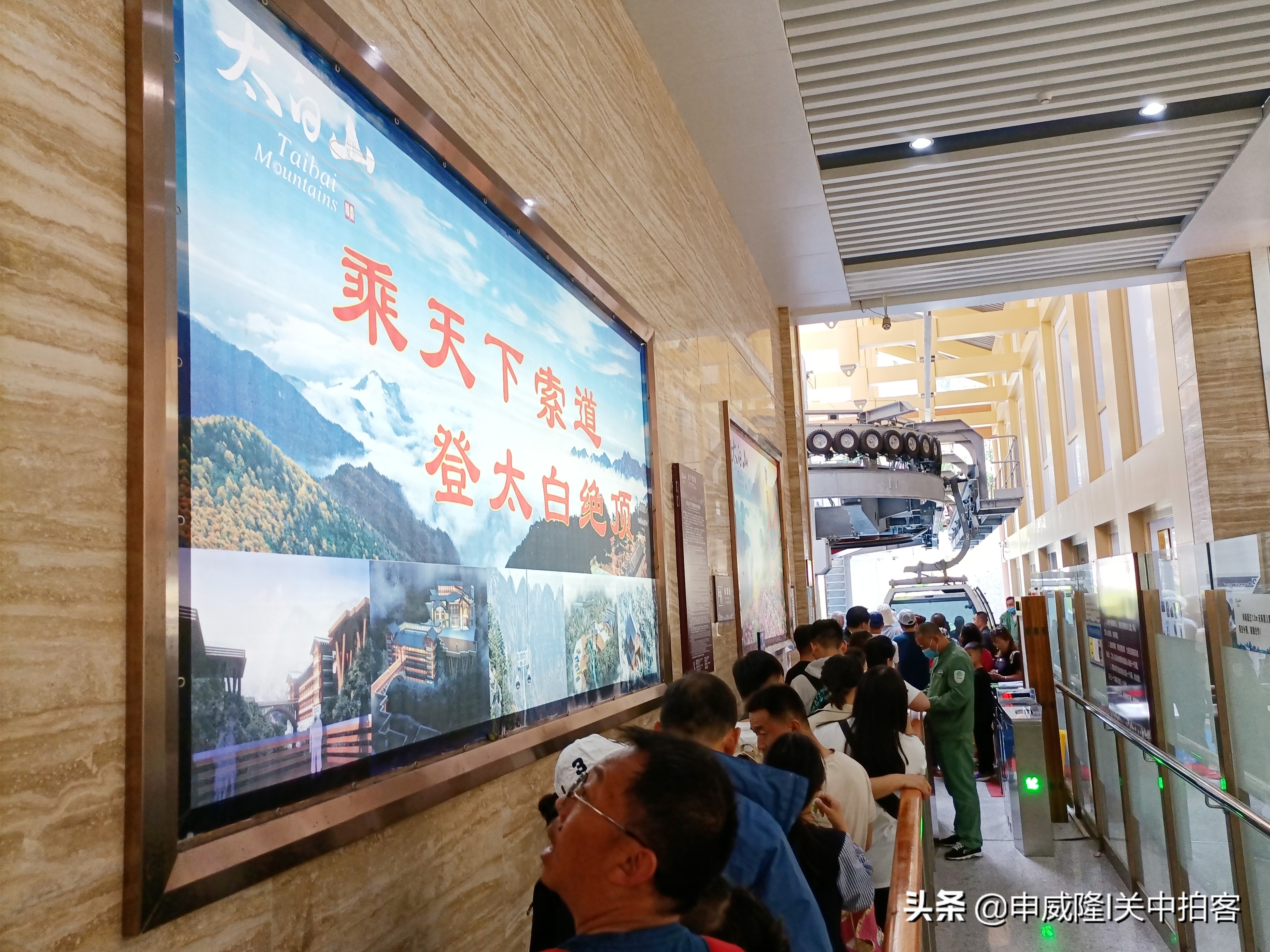 于是,我们乘坐旅游大巴车返回红桦坪,决定在这里乘坐索道,继续游览太白山景区。走进乘坐索道的大厅内,这里排队买票的人很多,周围还有餐厅和文创品商店。