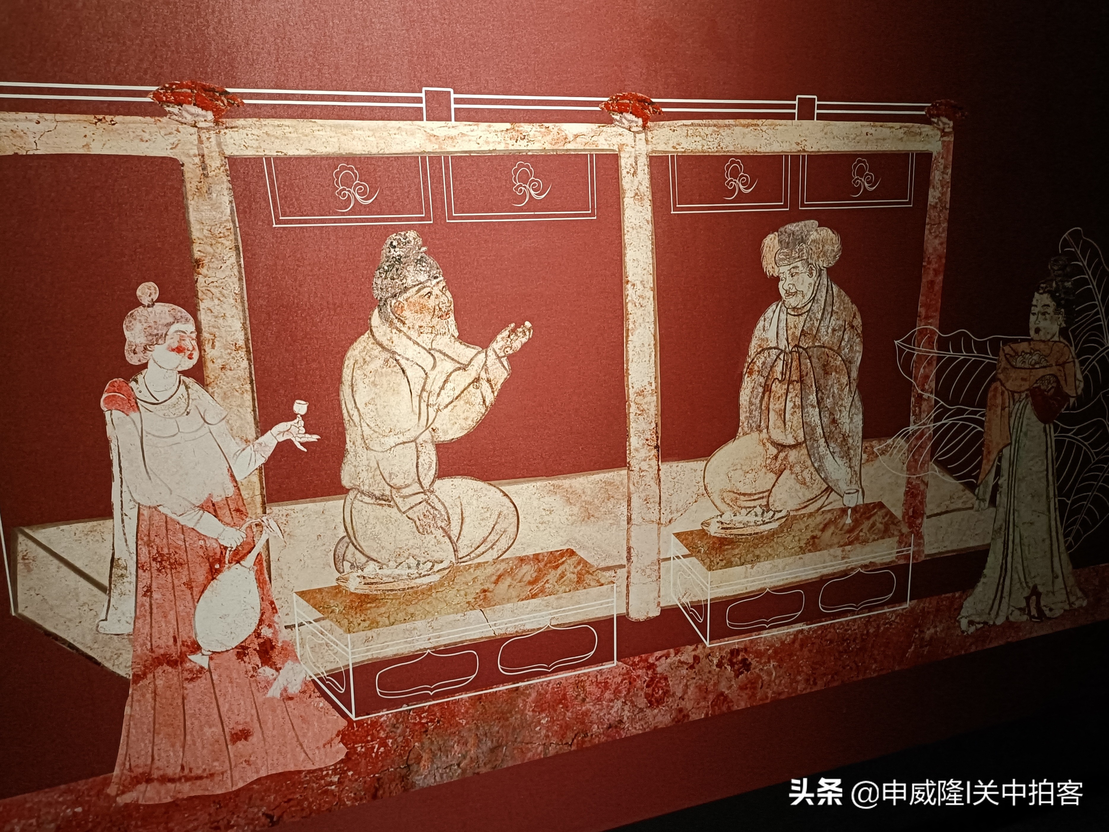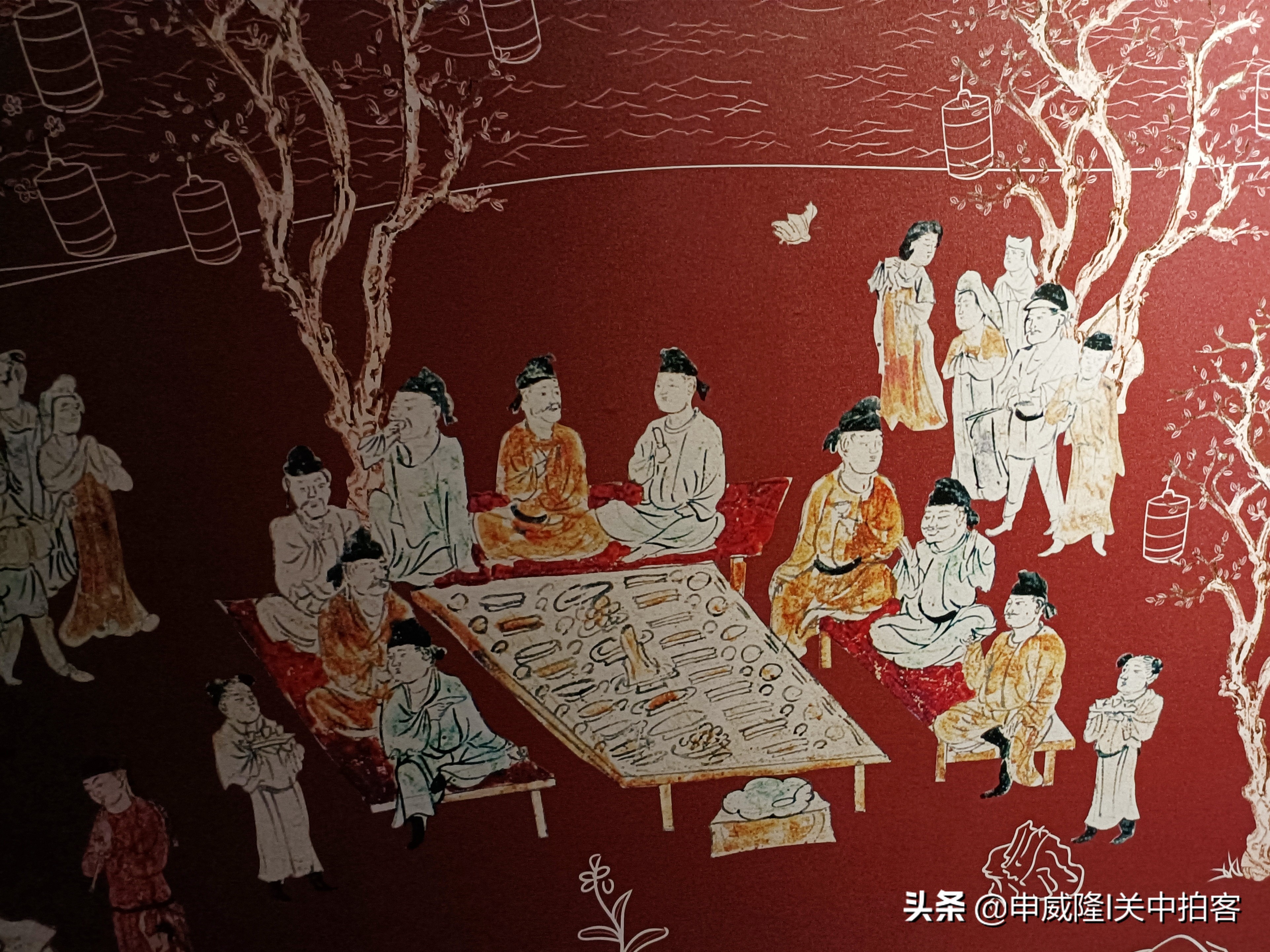 曲江位于唐长安城东南隅,乃当时著名的风景区,因“水流曲折”而得名。每年的三月初三的上巳节和七月十五日的中元节,贵族们会在这里举行集会饮宴,普通百姓也赶来看热闹,形成了一年两度的盛会。在西安市南里王村韦氏家族墓的墓室东壁上,描绘了一幅宏大的《宴饮图》,展示了当时盛行的游玩享宴之风。