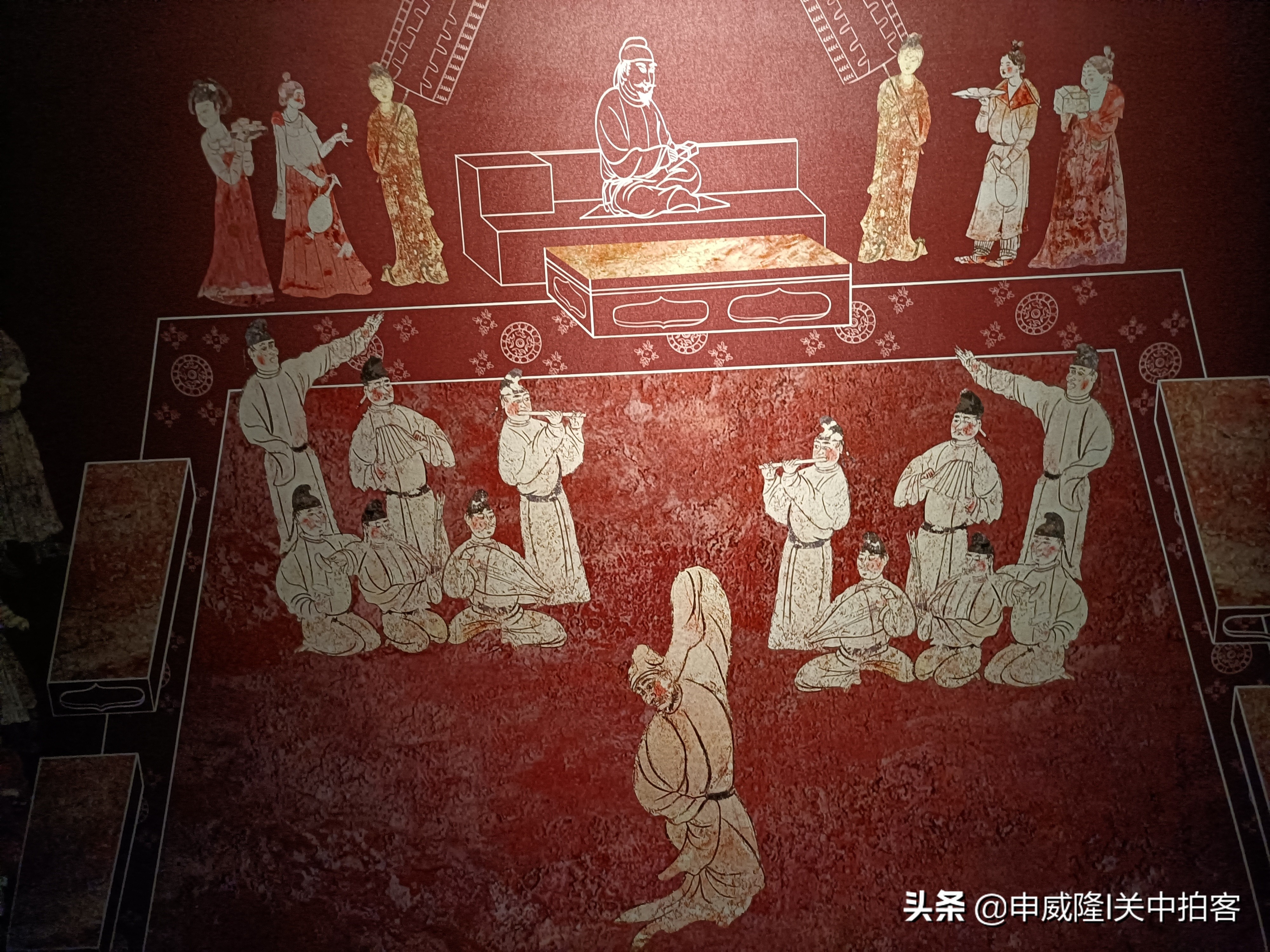 在唐长安城大明宫中,有一座雄伟的麟德殿,乃皇帝举行宴会的场所。这里以苏思勖墓墓室东壁的《乐舞图》为核心,展示了唐太宗李世民宴请各国使节的盛大景象:中间的舞蹈者为胡人形象,右手叉腰,左手高举,旋转起舞。两边是乐队,由十人组成,分为两排,或站或坐。
