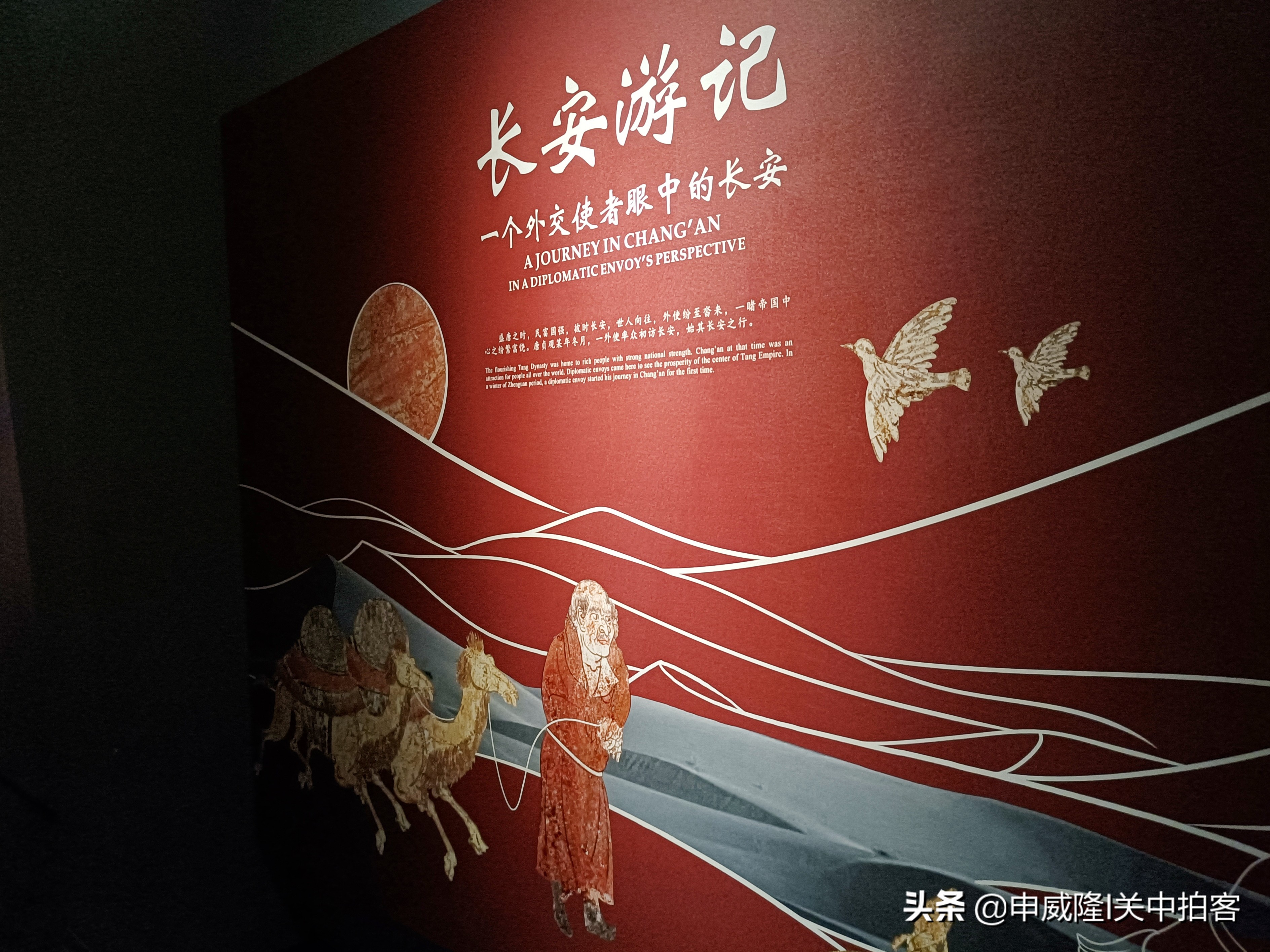 在西安唐皇城墙含光门遗址博物馆内,以“长安游记”为主题,结合唐墓出土的壁画,通过八块简单的图板,展示了一个外交使者眼中的长安。2021年6月19日上午,参观完这里的临时展览后,我仔细欣赏了这八块展板——