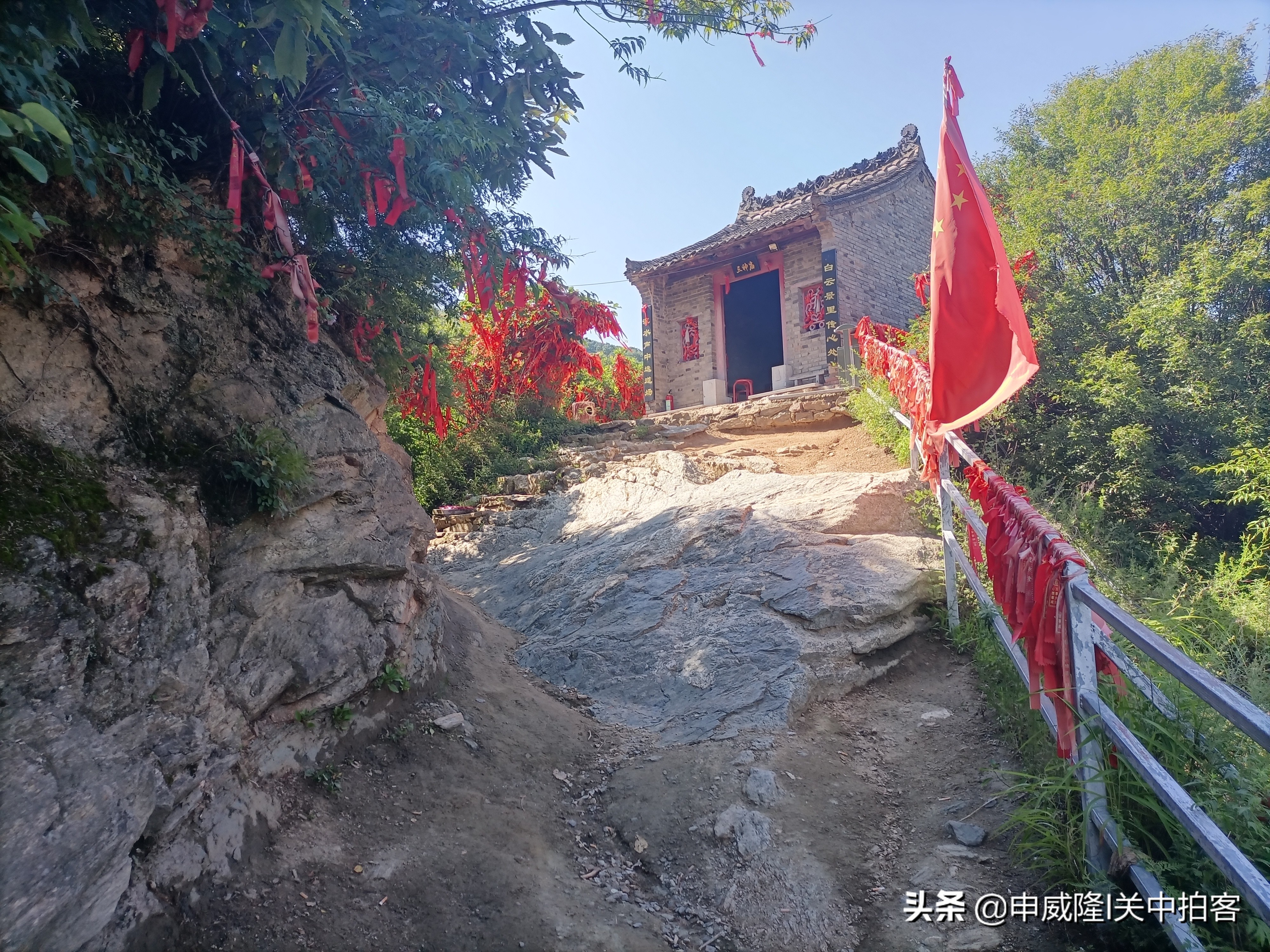 由于时间有限,我们没有继续前行,选择向西离开景区。最后,经过一座三神庙,里面供奉着观音菩萨等三位神灵。三神庙外的树木和栏杆上,系着许多红颜色的小布条,上面写着祈福的吉祥话语。站在这里,俯瞰周围,群山连绵起伏,视野无比开阔。