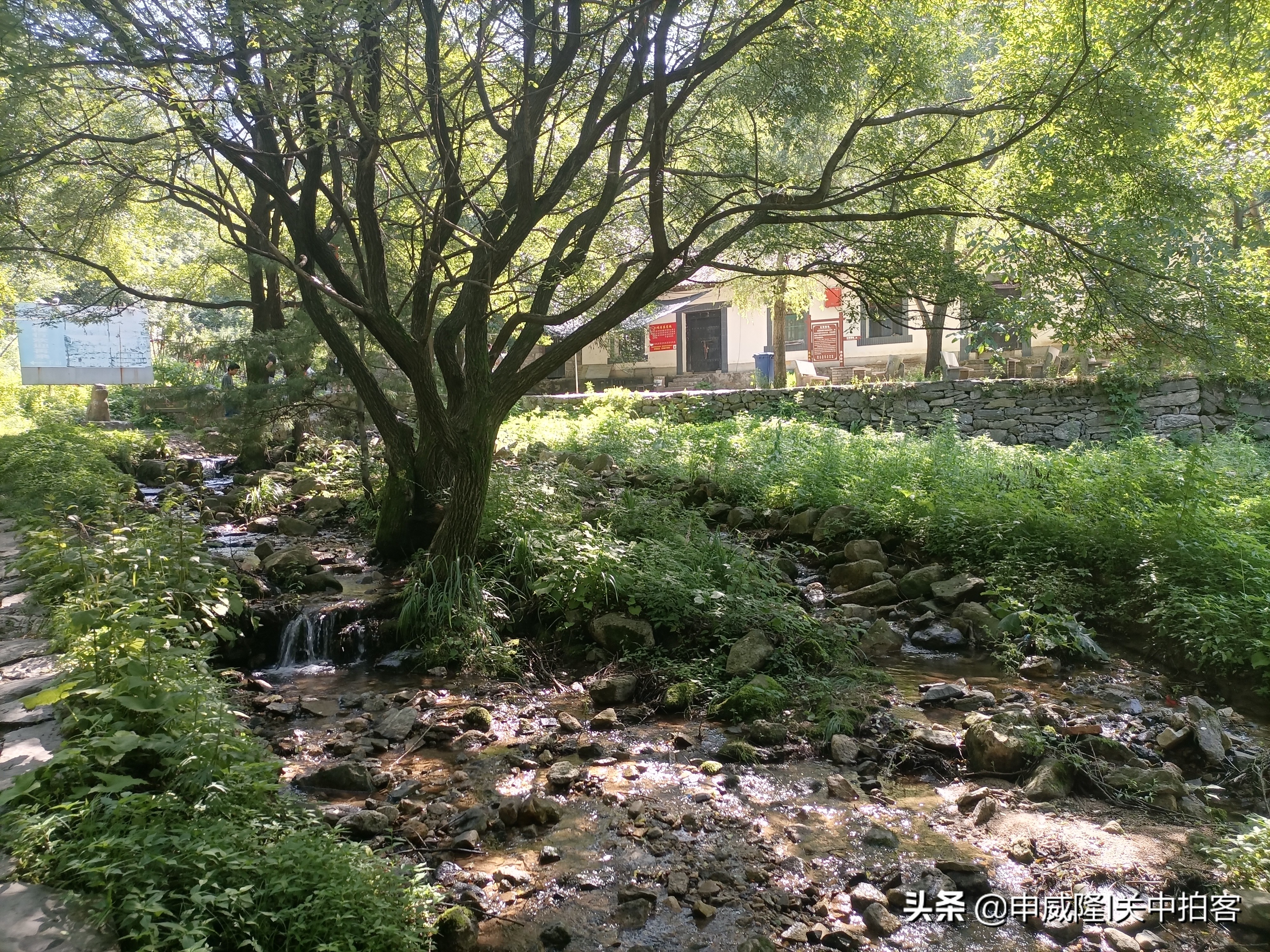 沿着小溪,漫步而行,树木遮天蔽日,仿佛置身于山谷之中。继续向前,十字路口,有一个叫“六间房”的地方。在小溪旁边,有几间房子,经营农家饭。