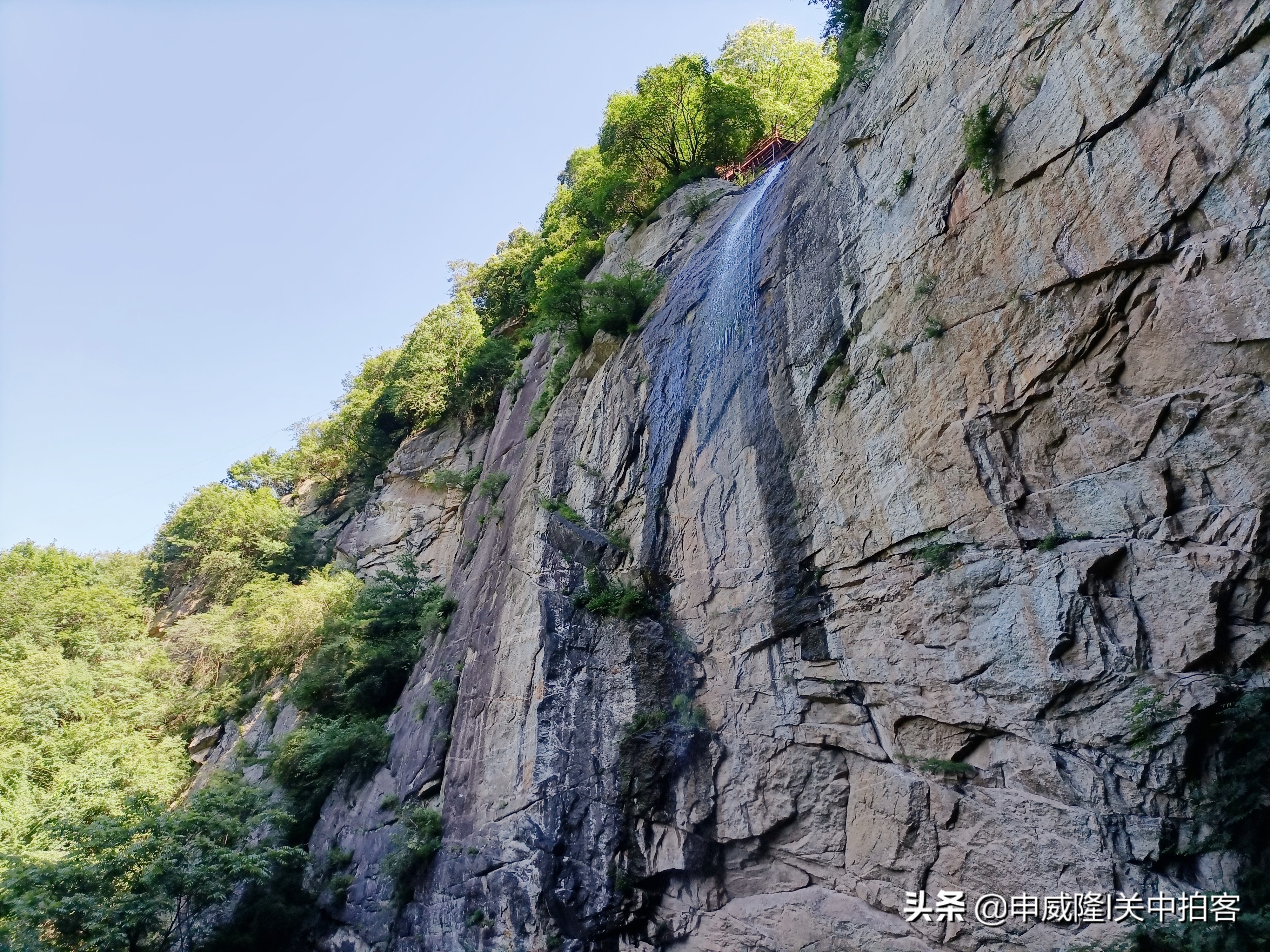 经过20多分钟,顺着蜿蜒的山路,终于来到云梯上方。然后,继续向上攀登,沿途没有什么险阻,让人感到轻松愉悦。经过天池和野风寨,迎面的崖壁之上,挂着一条小瀑布,被称为“龙宫瀑布”。瀑布从崖壁上倾泻而下,仿佛墨汁一样,将石壁染黑了!