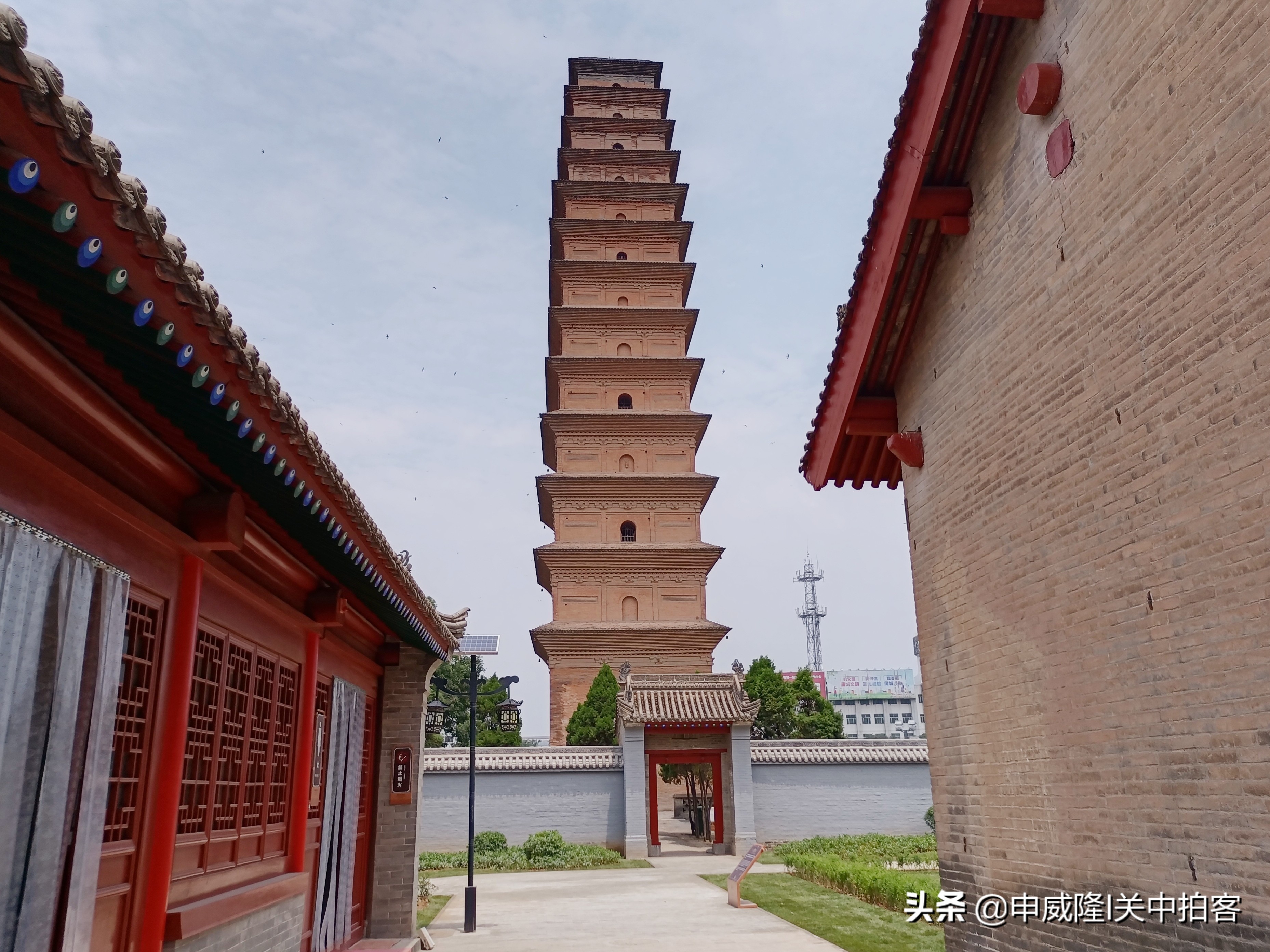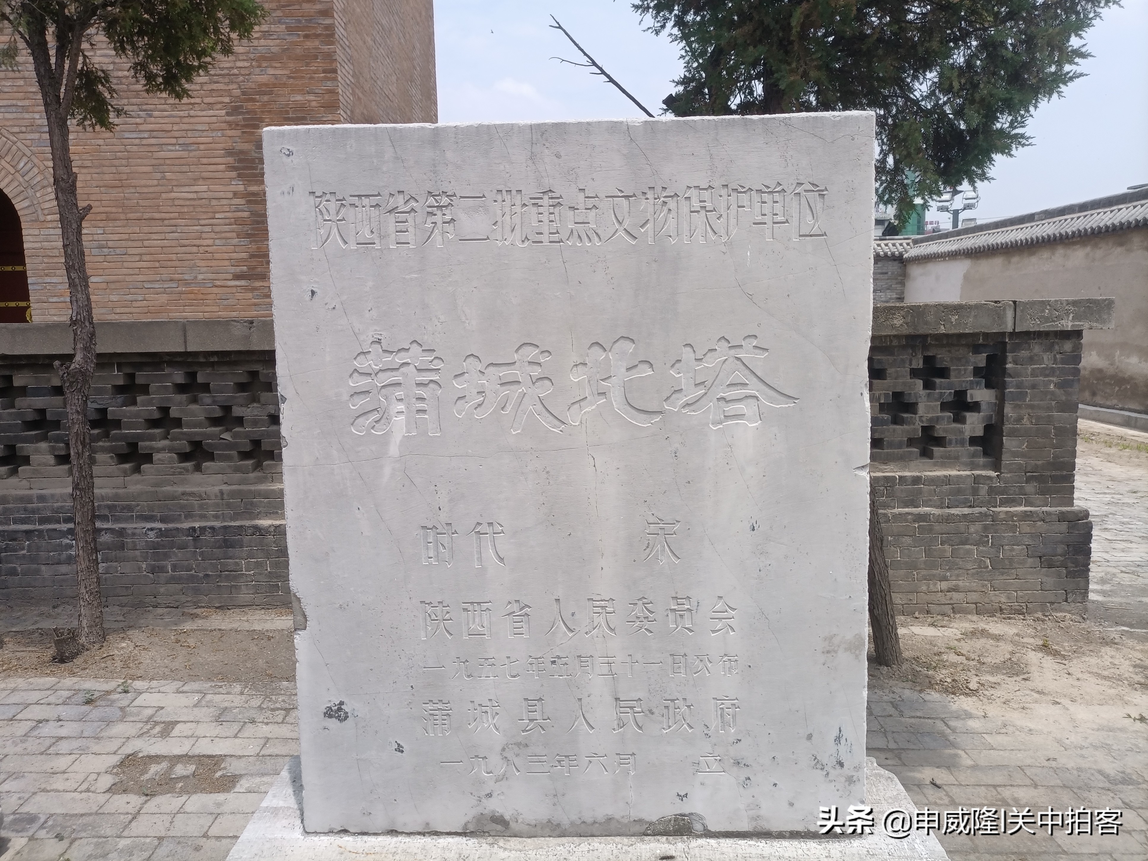 离开蒲城县博物馆,绕到北侧的广场上,在这里望崇寿寺塔,更加显得高大挺拔。塔底层北侧,有一座小庙,摆放着一尊宋代释迦牟尼石像和一块青石碑,记载了北宋绍圣三年(1096)修建此塔的经过。