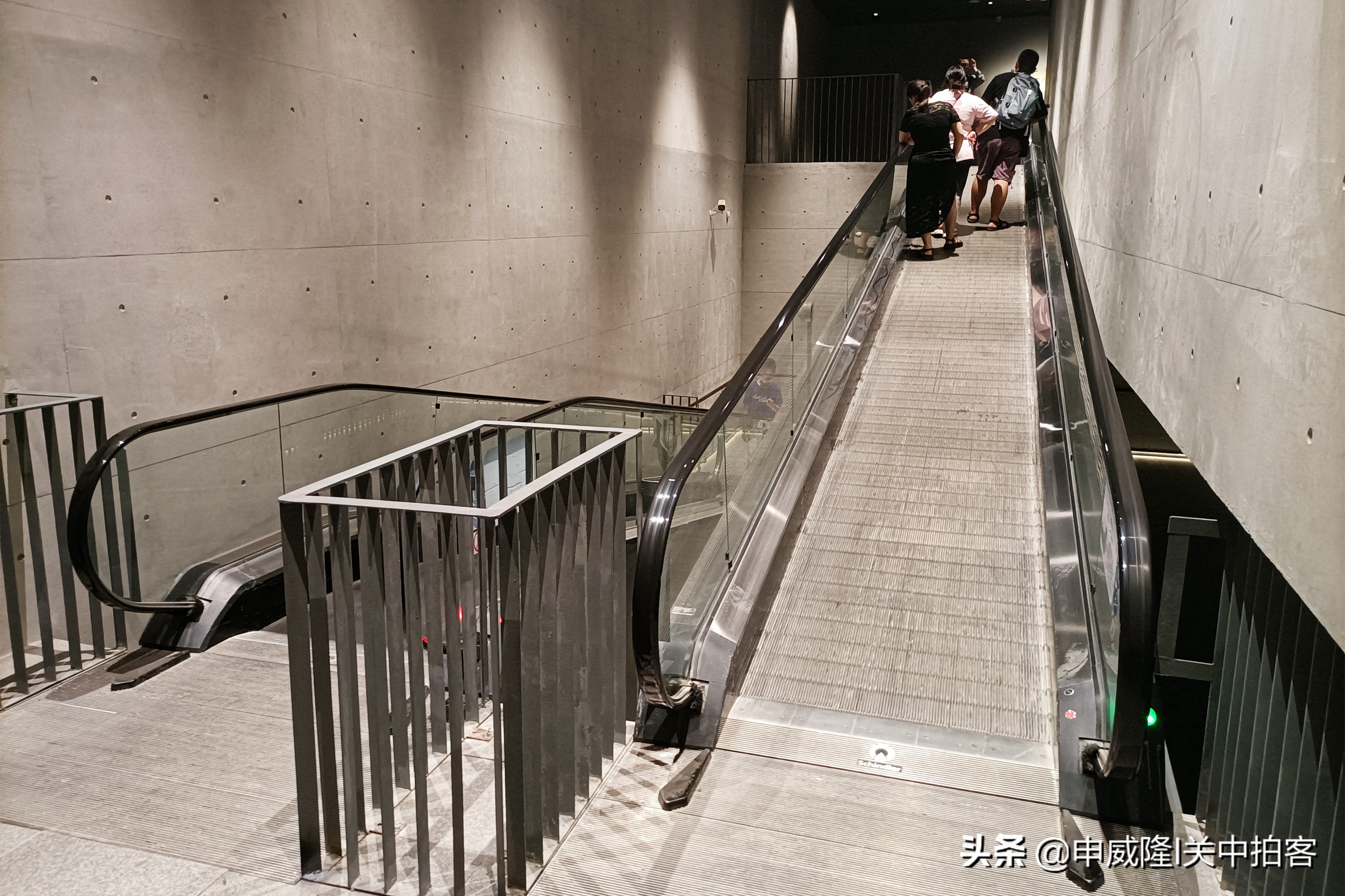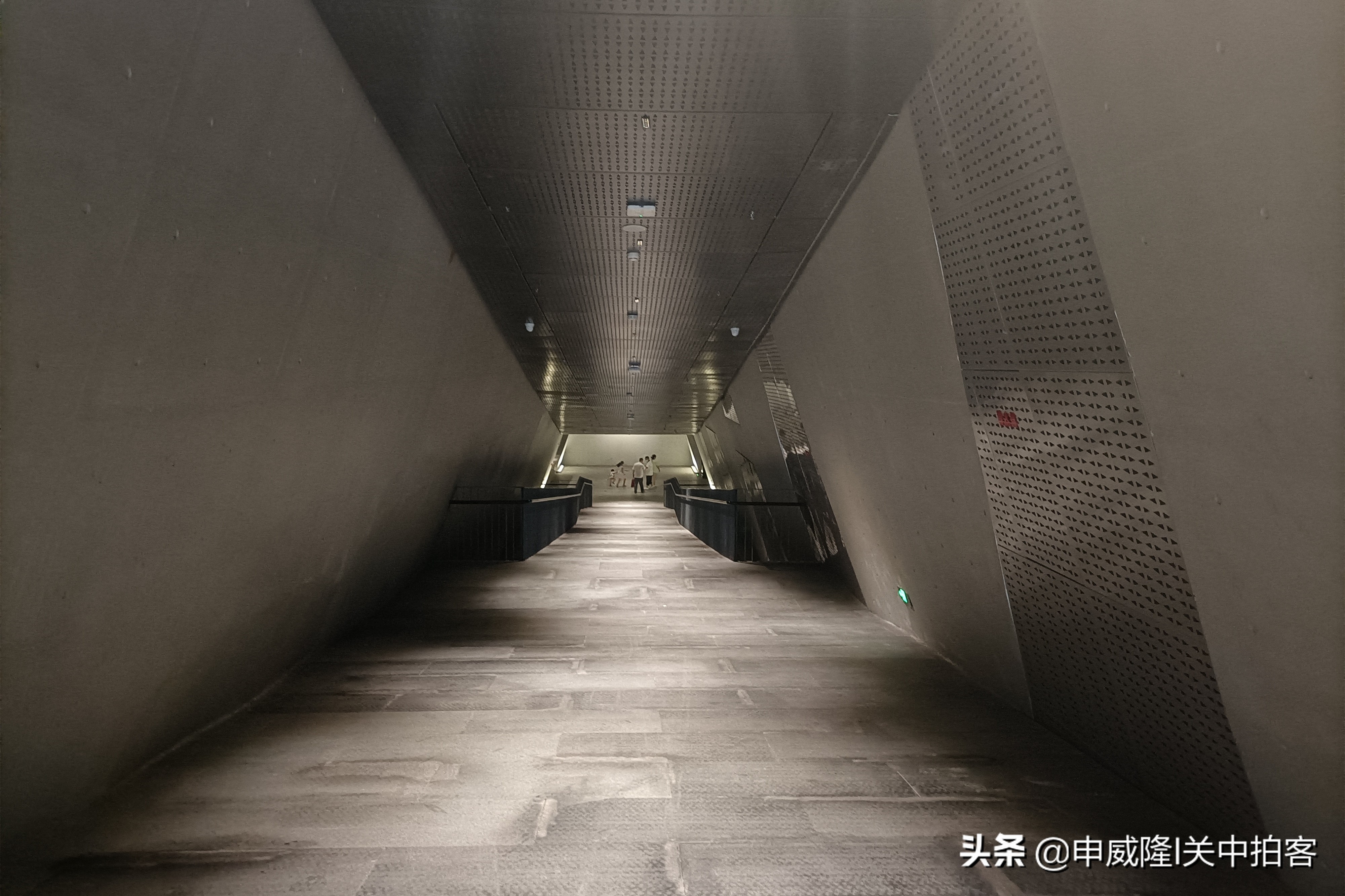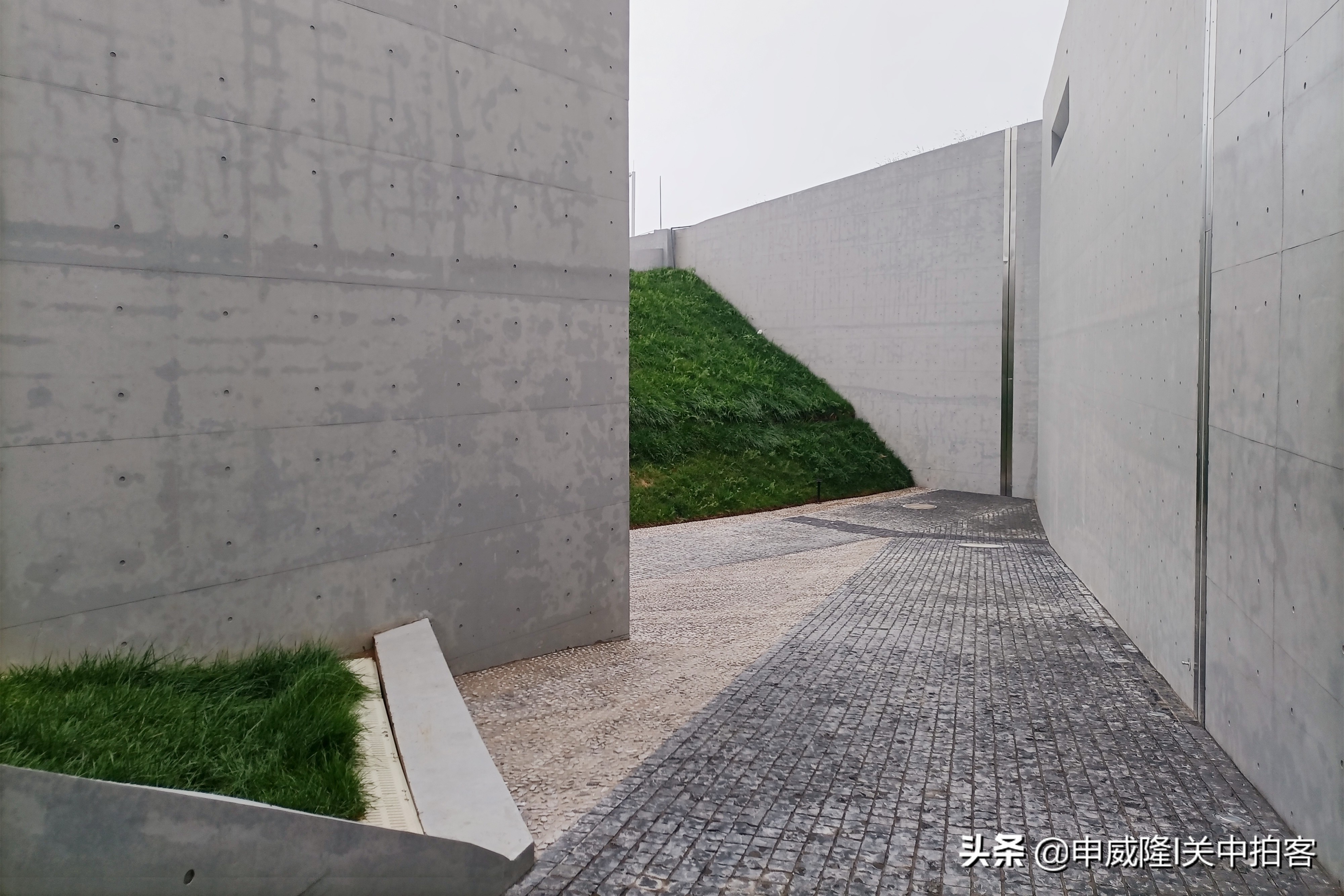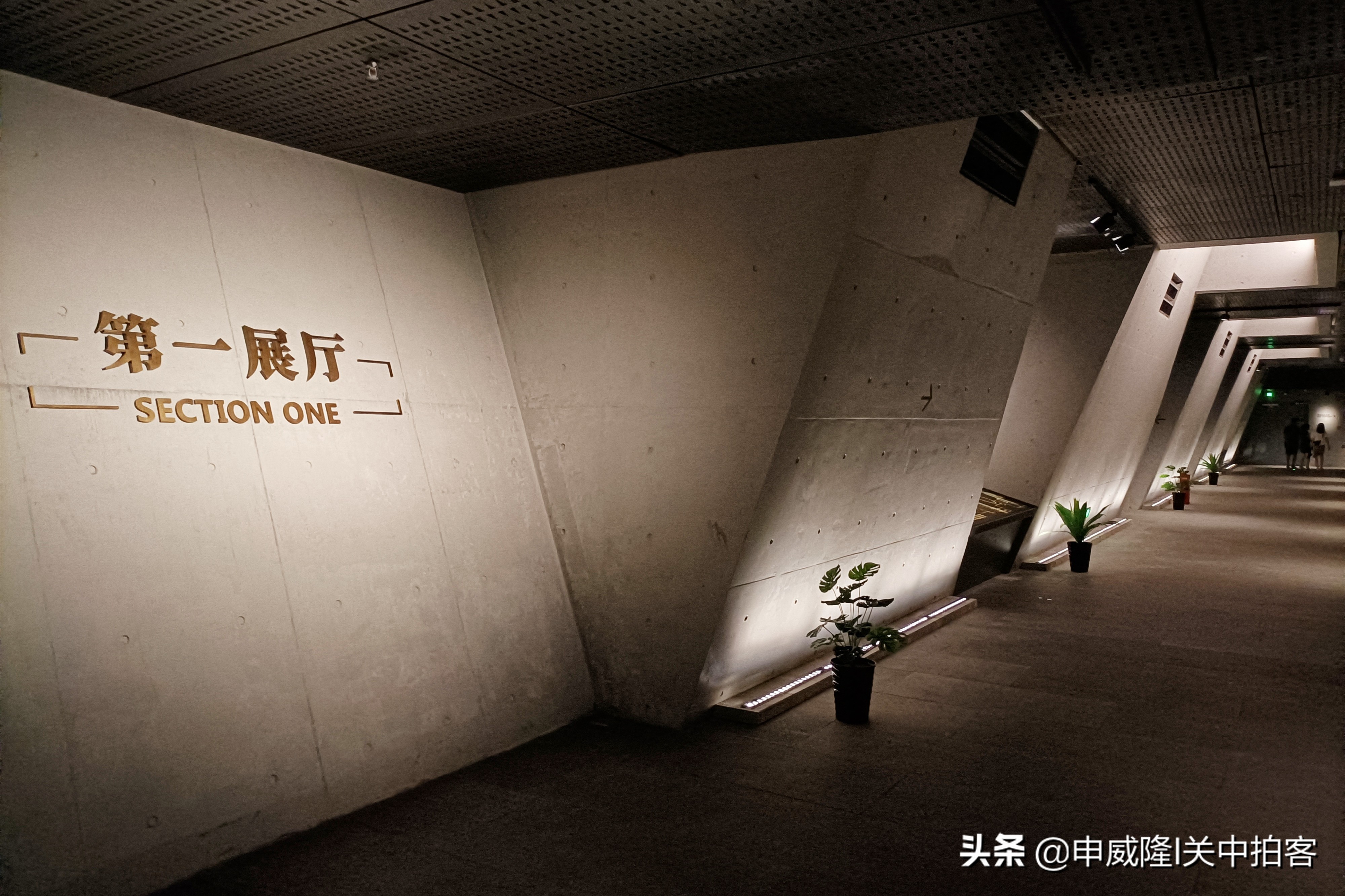 沿着曲折的坡道,走到地下一层,便是展厅入口。梯形的大门很有特点,好像一条神秘的墓道,吸引游客们走进参观。穿过门洞,沿着通道,不断向下,迎面的墙壁上写着“青铜之冠”四个篆书大字。