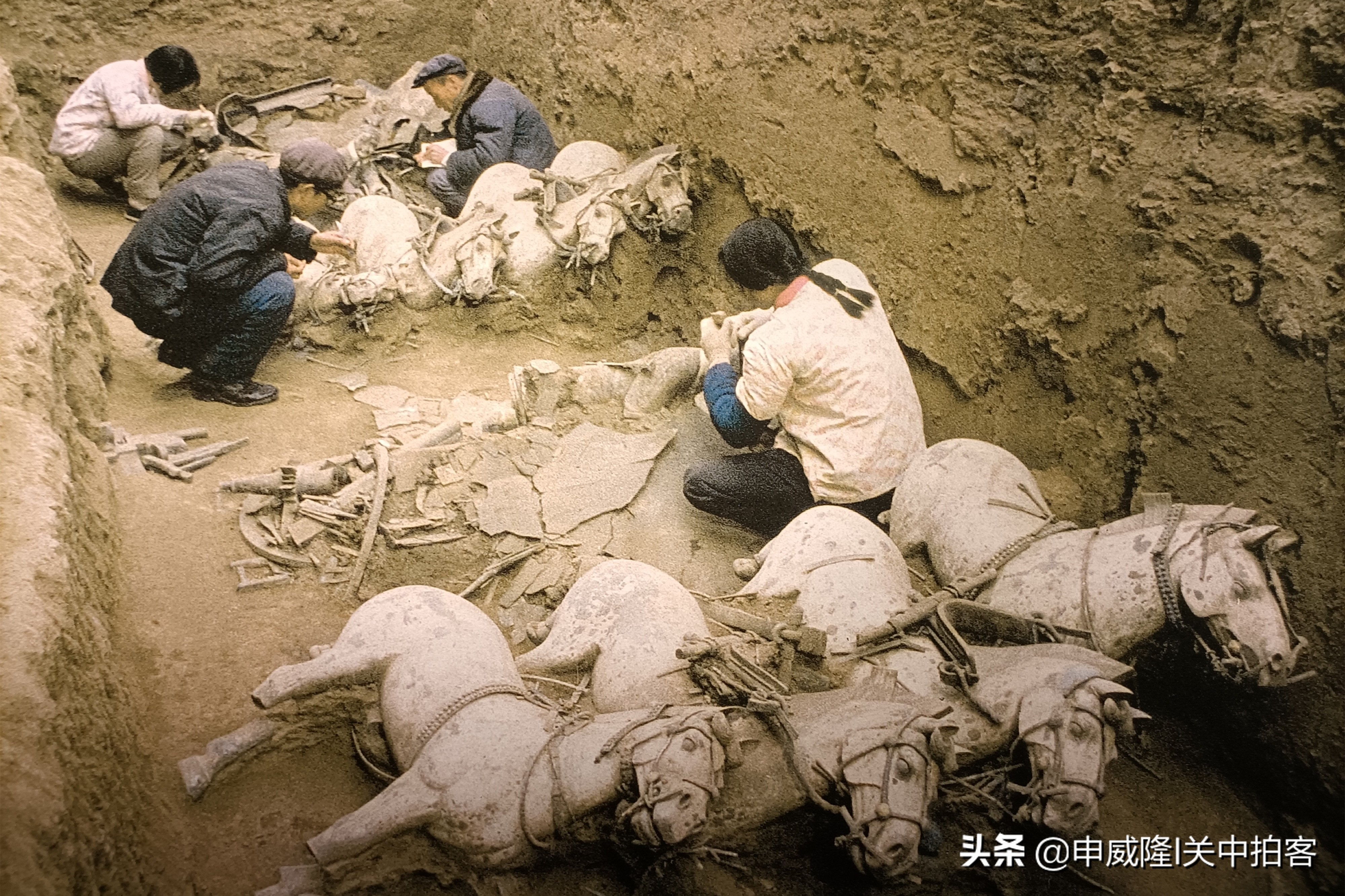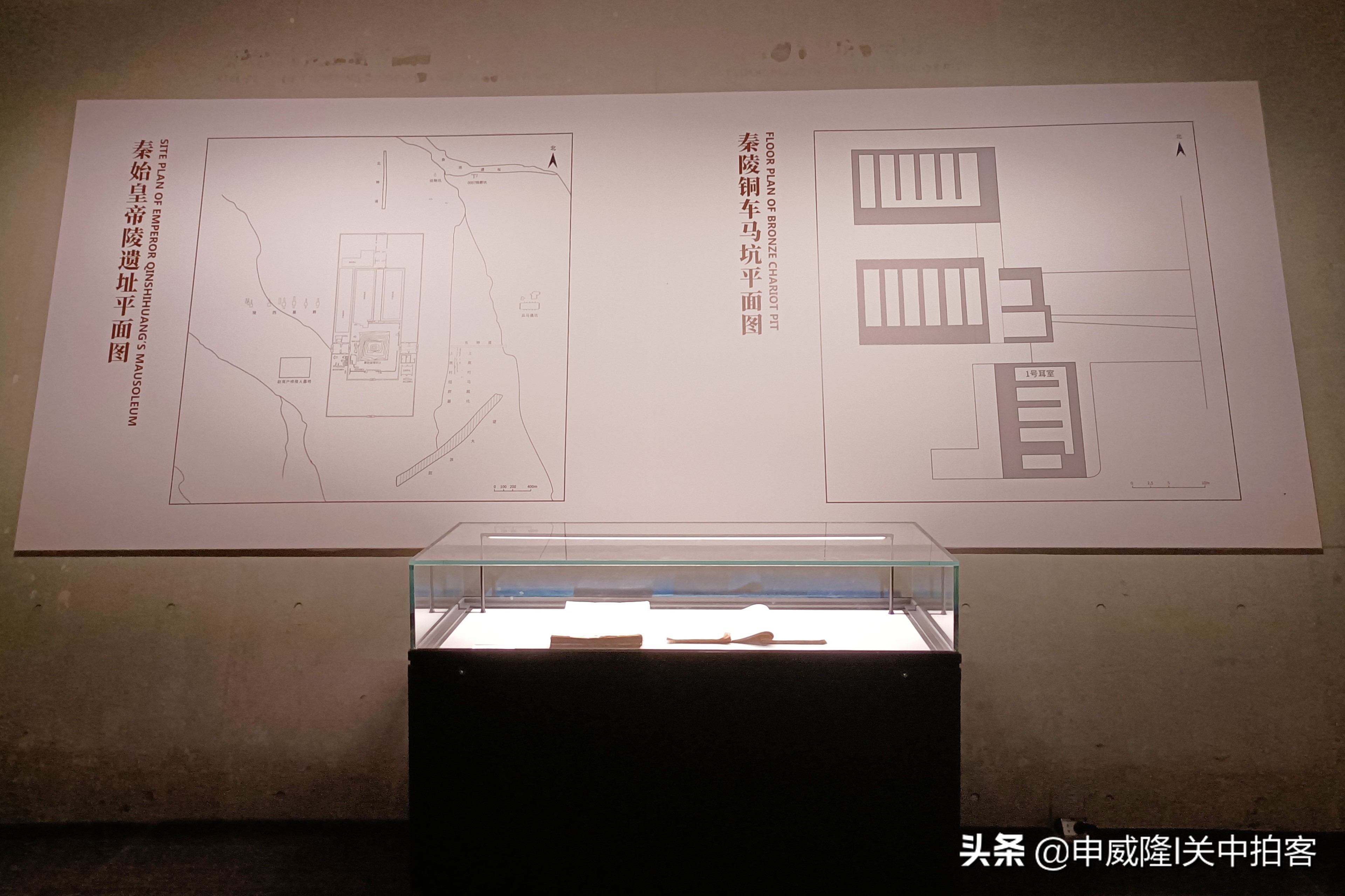 拐向右侧,在序厅内,通过大量文字、图片和实物资料,详细介绍了铜车马的考古发掘和修复过程。当年,出土铜车马的土坑,用木板拼成长方形,形成巨大的木椁室,长11.8米,宽3.1米,底部距离地面7.8米,被编为“1号耳室”。
