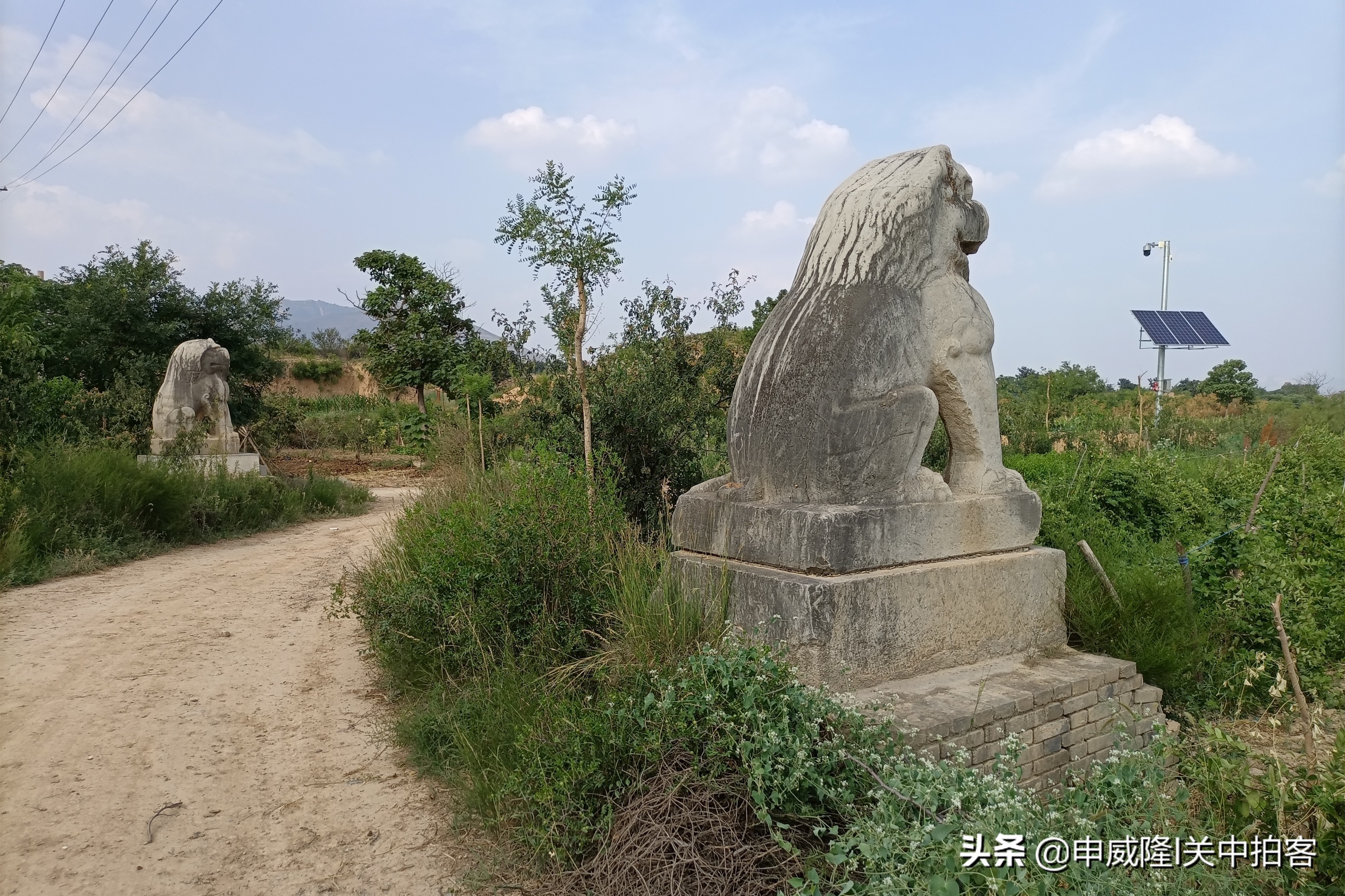 在夯土阙台后方约50米,中间矗立着两尊石狮子,蹲踞在路边的草丛之中,紧邻“丁”字路口交叉处,周围没有保护围栏环绕。两件石狮子坐西朝东,守卫在东门遗址两侧,背靠帝陵,面朝东方,威风凛凛。