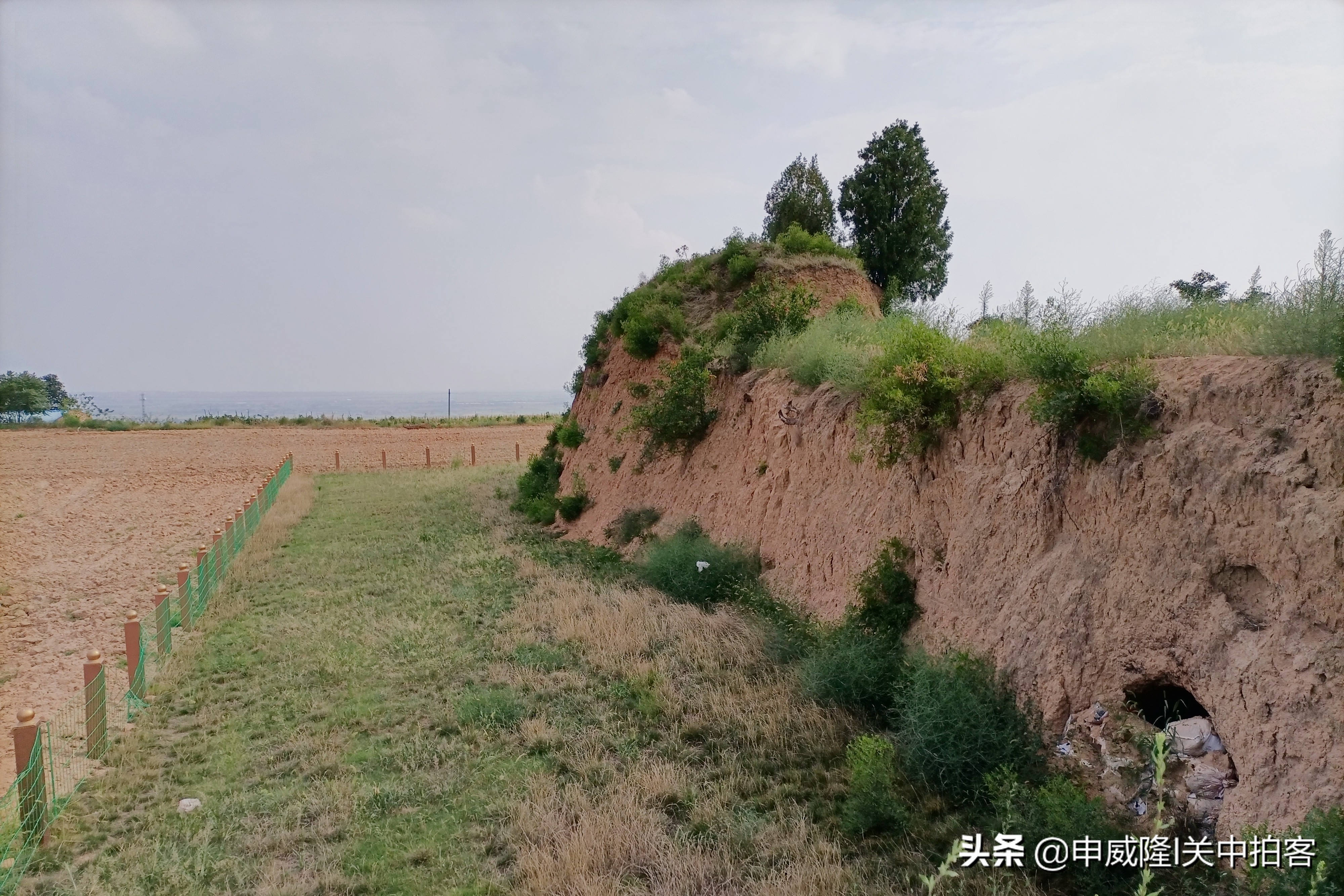 下午4点半左右,我们自东向西穿过西山村后,尽头处就是唐景陵东门遗址。首先,迎面是两座南北相对的夯土阙台遗址,分别矗立在公路的南北两侧,外观为圆锥形,残存高约5米,相距大约50米。