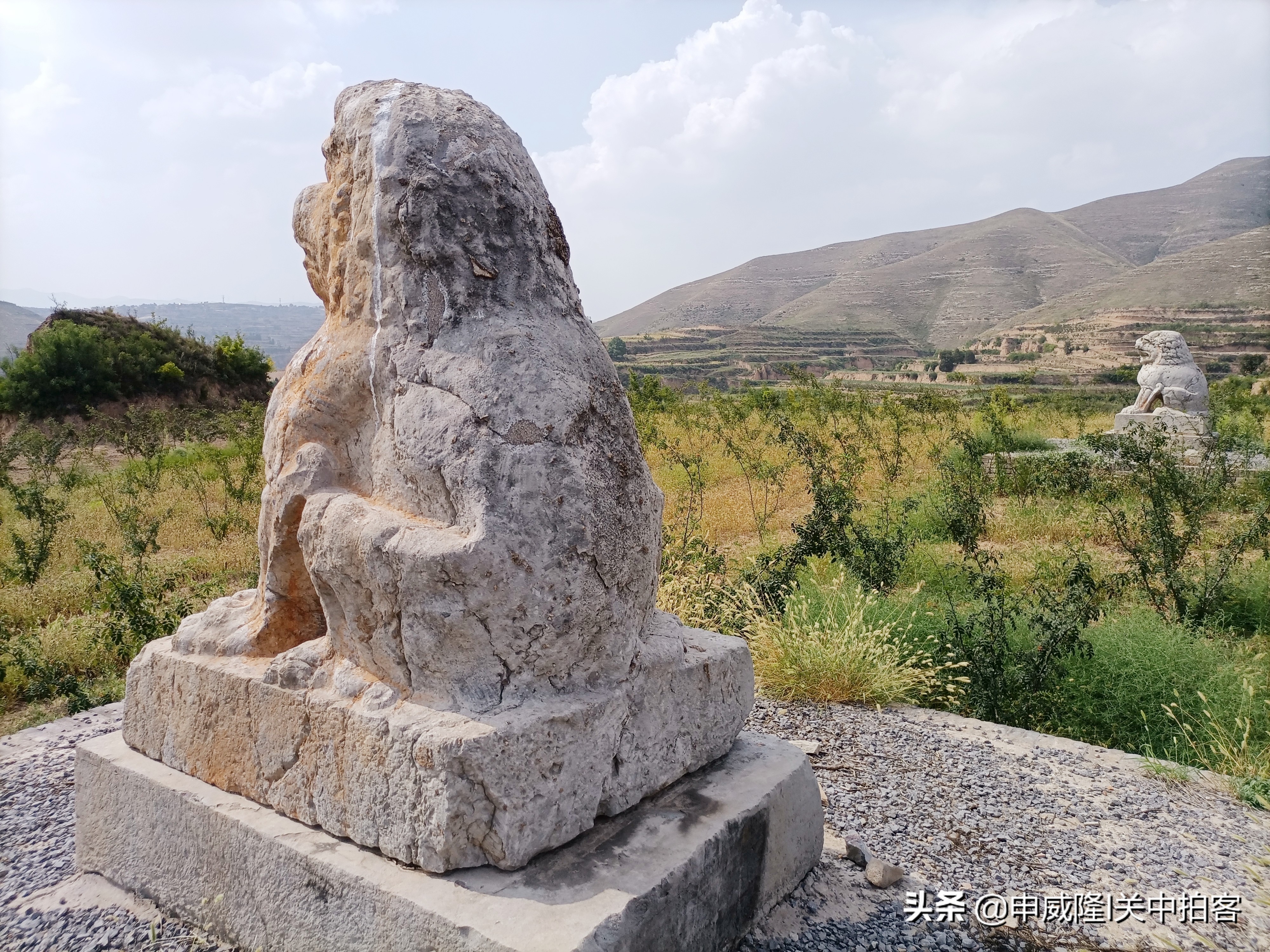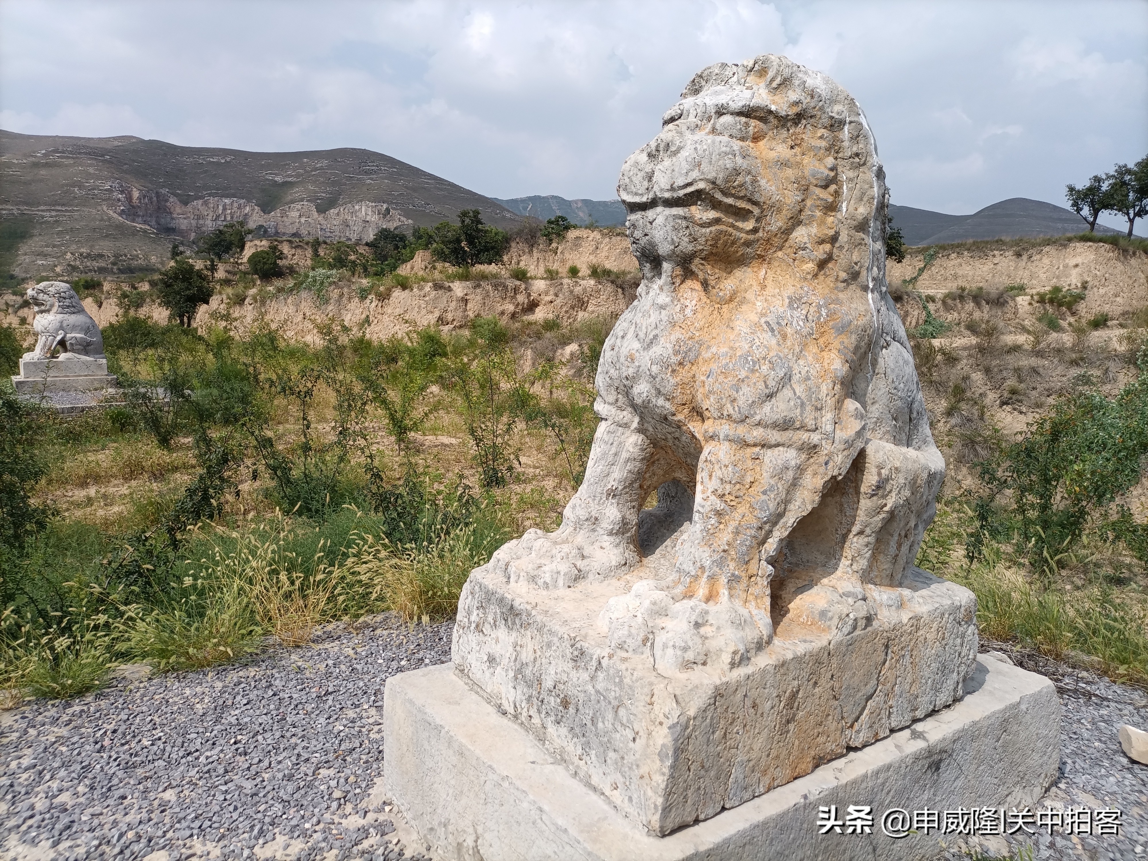 两件雕刻精美的石狮子背靠着高大的唐光陵主峰,镇守西门,威风凛凛。这两件石狮子均由一整块石灰岩雕刻而成,身体和底座连为一体,通体高度约为150厘米,胸部宽度约为85厘米。