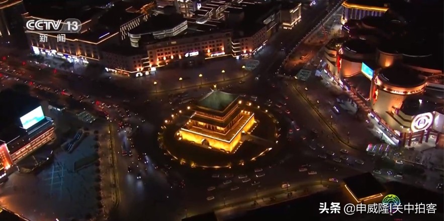 第一个镜头是西安大唐不夜城。无人机从开元广场升起,自南向北飞过雁塔南路,唐代大雁塔的雄姿呈现在眼前;第二个镜头是西安钟楼,无人机在钟楼上空盘旋,东、南、西、北四条大街交汇于此。
