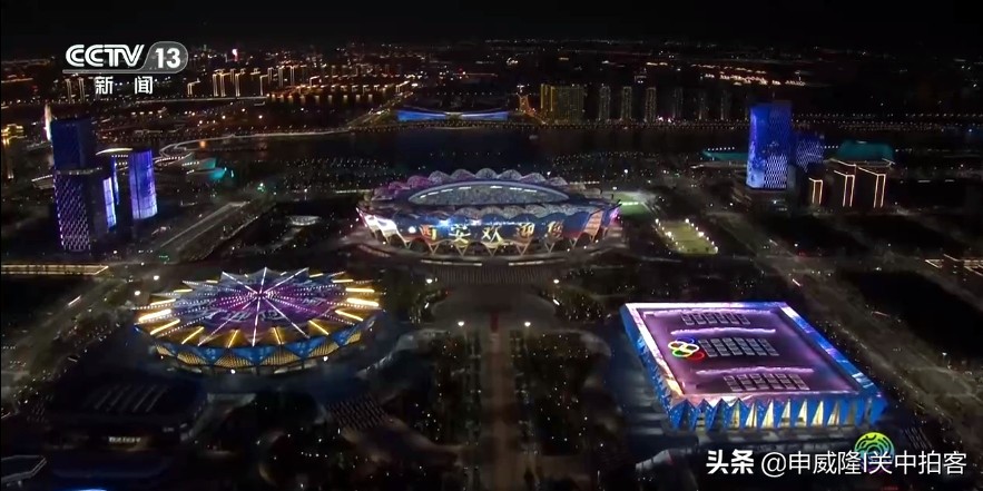 最后,我们来到西安市奥林匹克体育中心,体育场、体育馆、游泳跳水馆和周围的建筑都流光溢彩。体育场的外观好像一朵绽放的石榴花,盛大的十四运会开幕式就在这里举办。