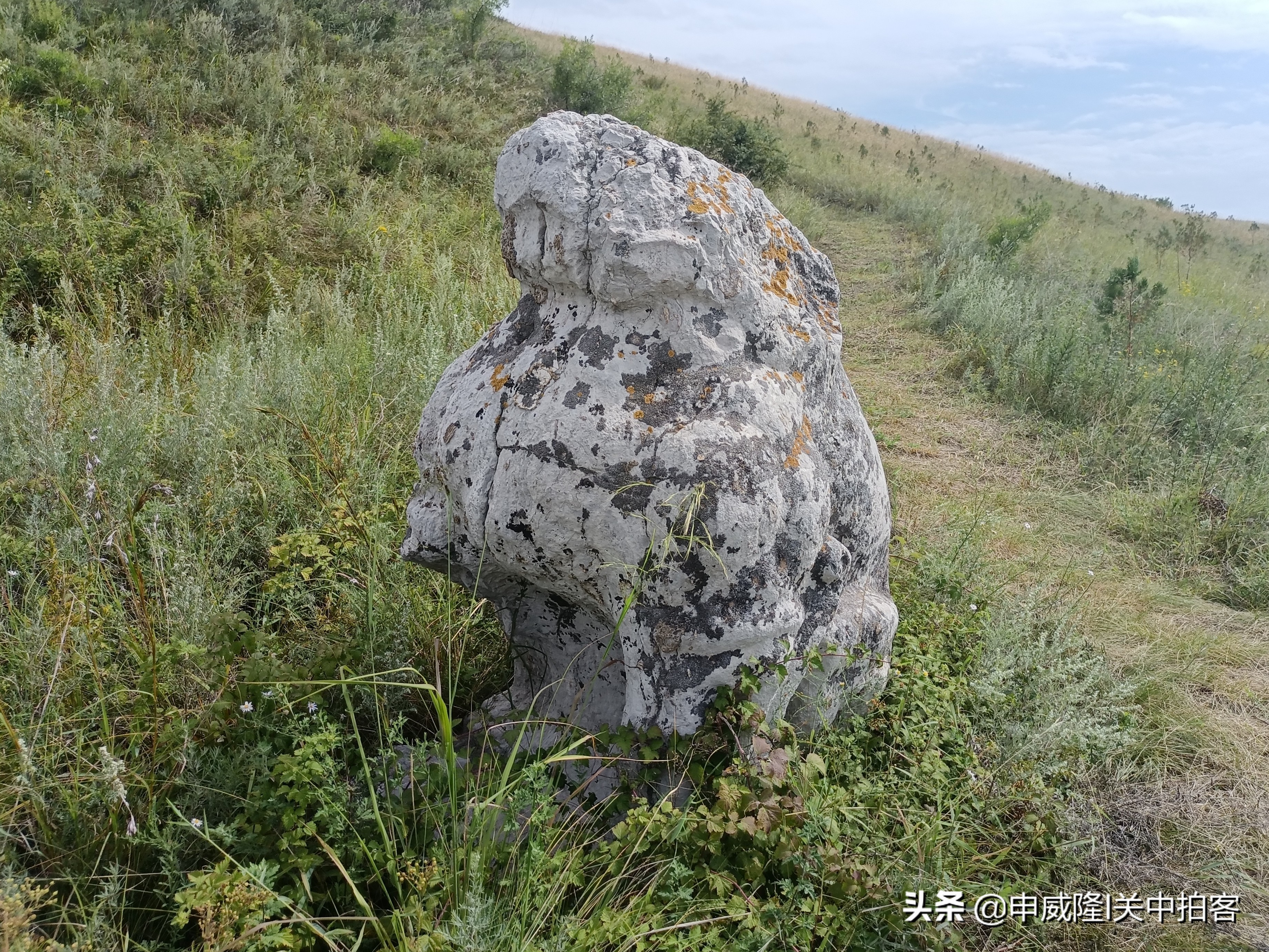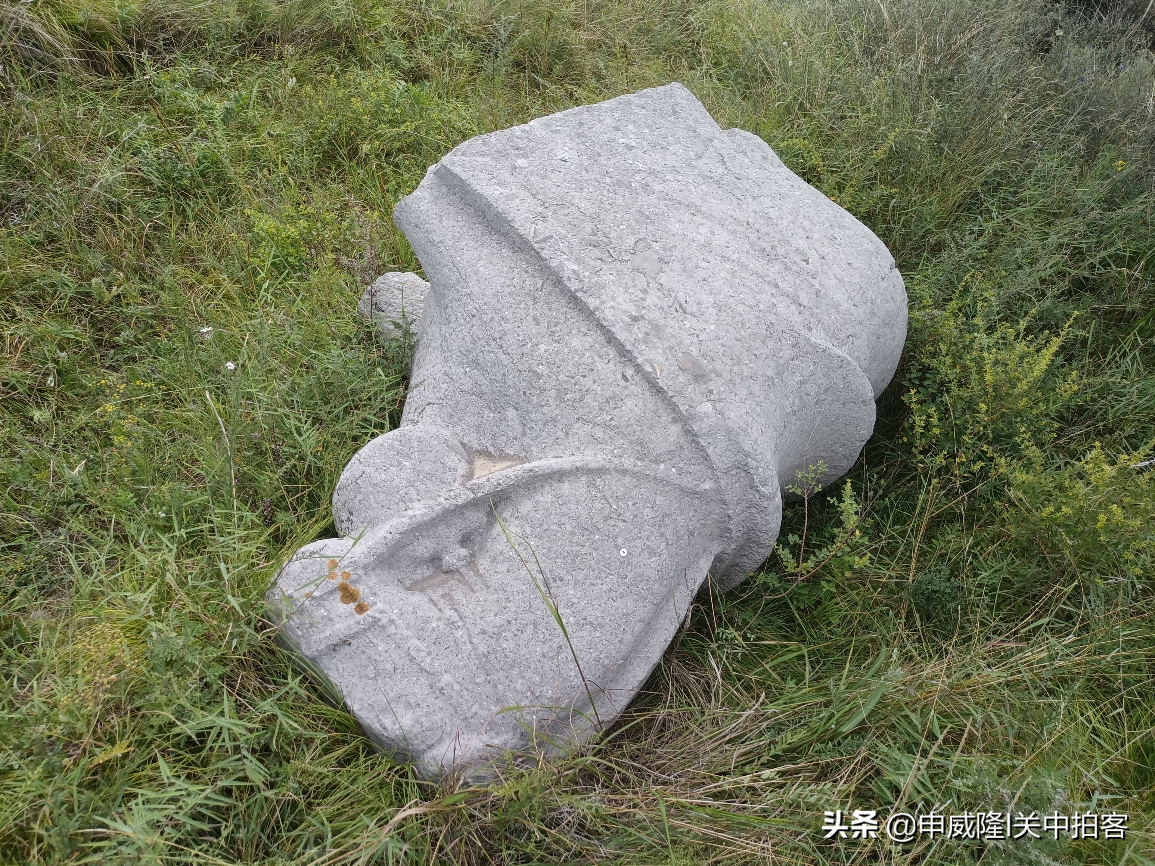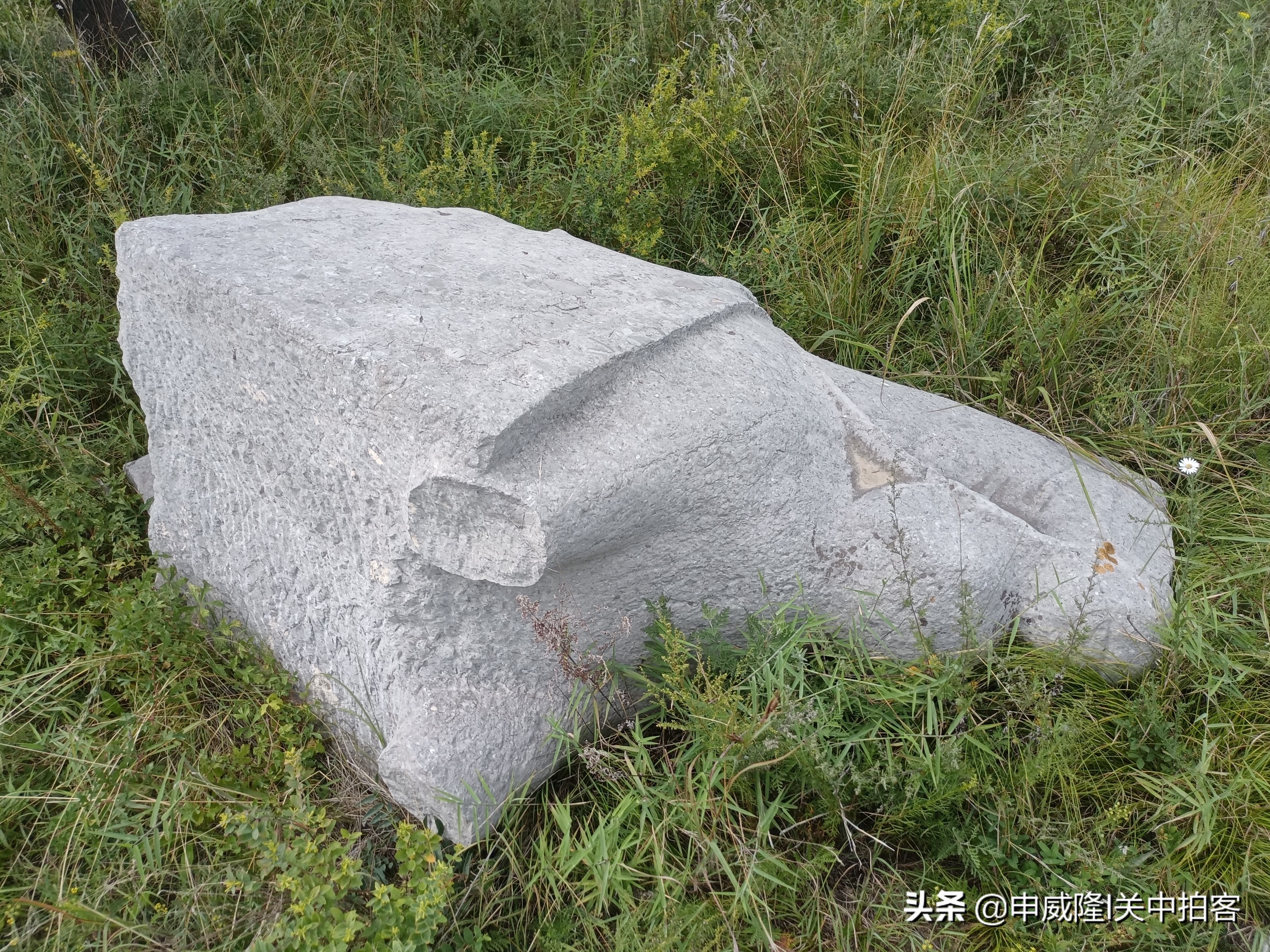从下午两点半出发,经过二十分钟攀登,终于到达土堆旁。周围杂草丛生,行走非常艰难,继续向上攀登一段,朝着土堆方向望去,看到一件石刻淹没在草丛之中,旁边竖立着一块全国重点文物保护单位碑。