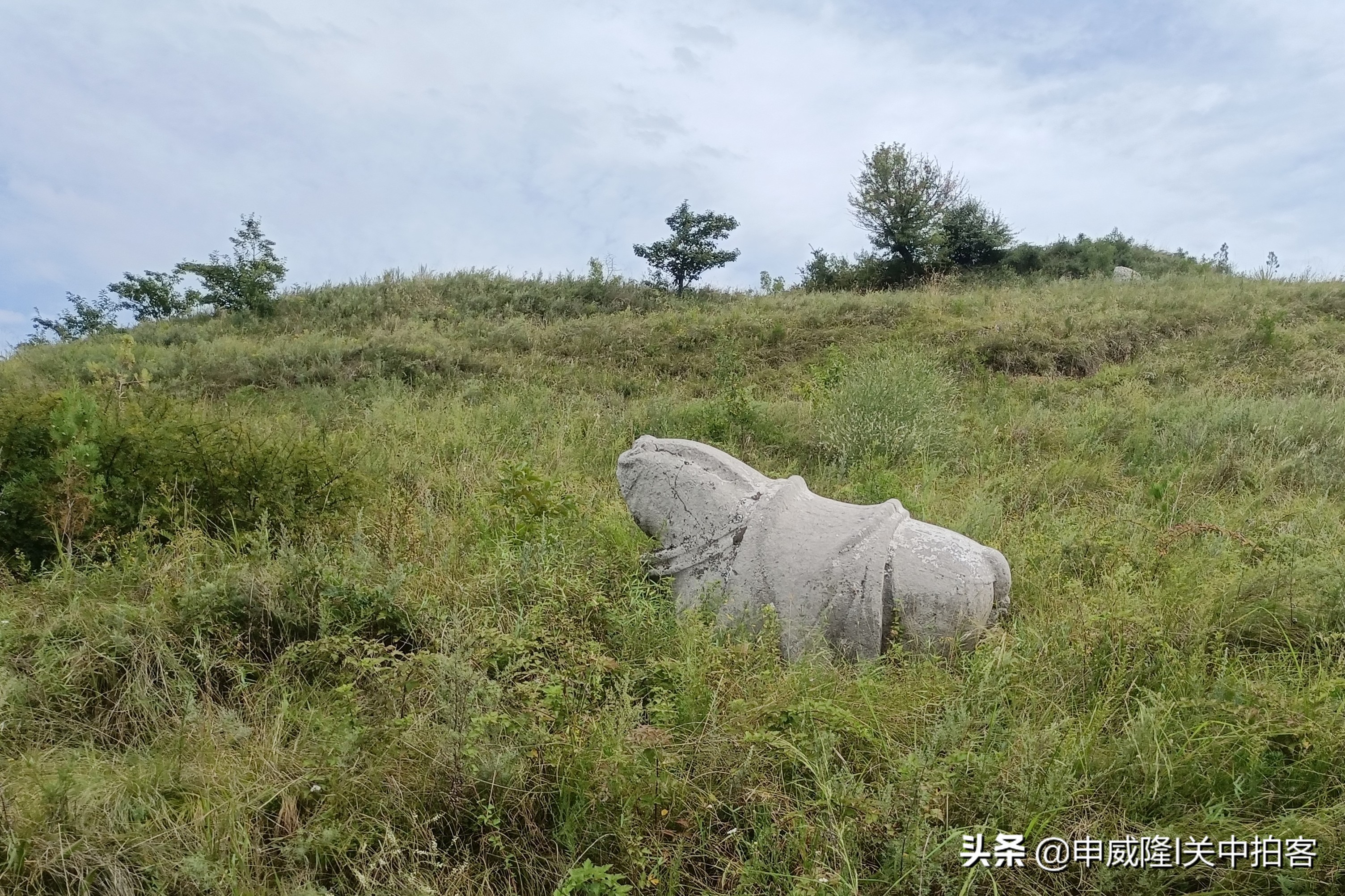 这座土堆是唐光陵北门西侧的阙台遗址,外观呈圆锥形,高度大约3米。石刻位于西侧阙台北约10米处,为北门神道西侧的一件石仗马,头部残缺,身体完好,尾巴束起,鞍鞯齐全。周围杂草太深,根本无法靠近,不知道仗马的四肢是否保存完好?
