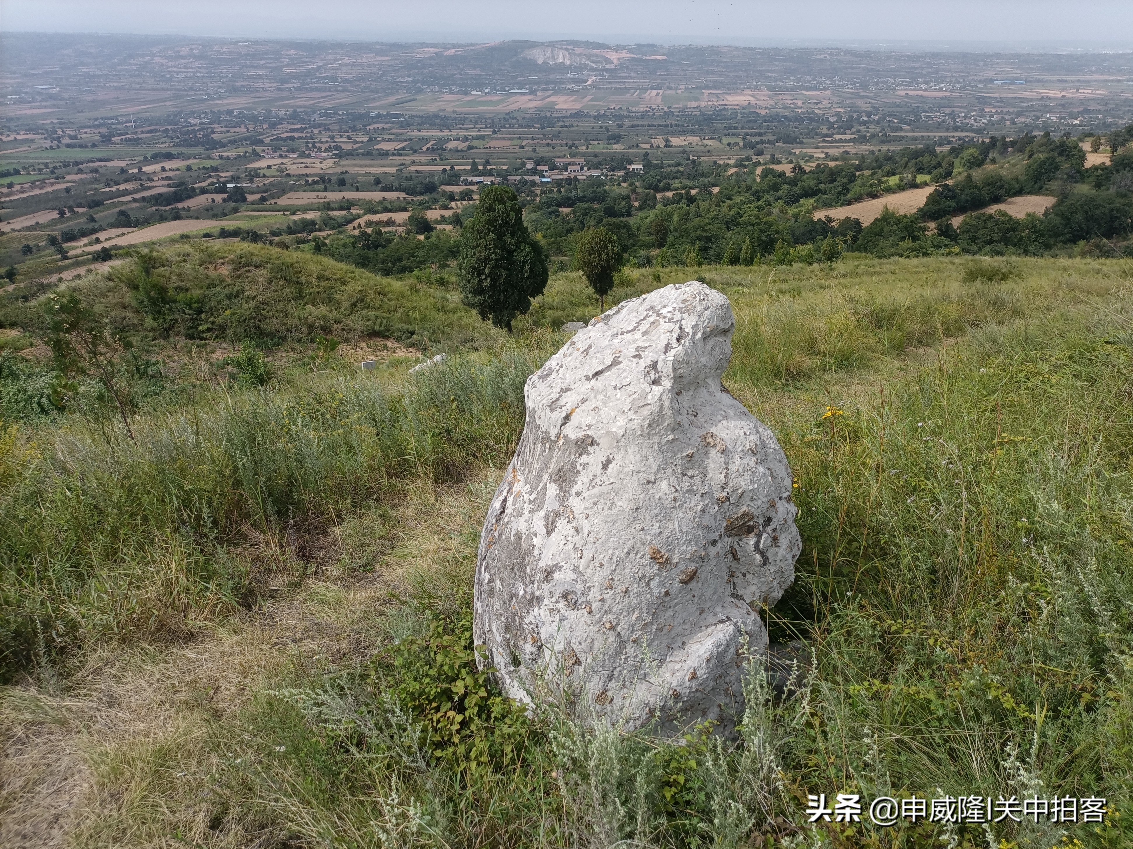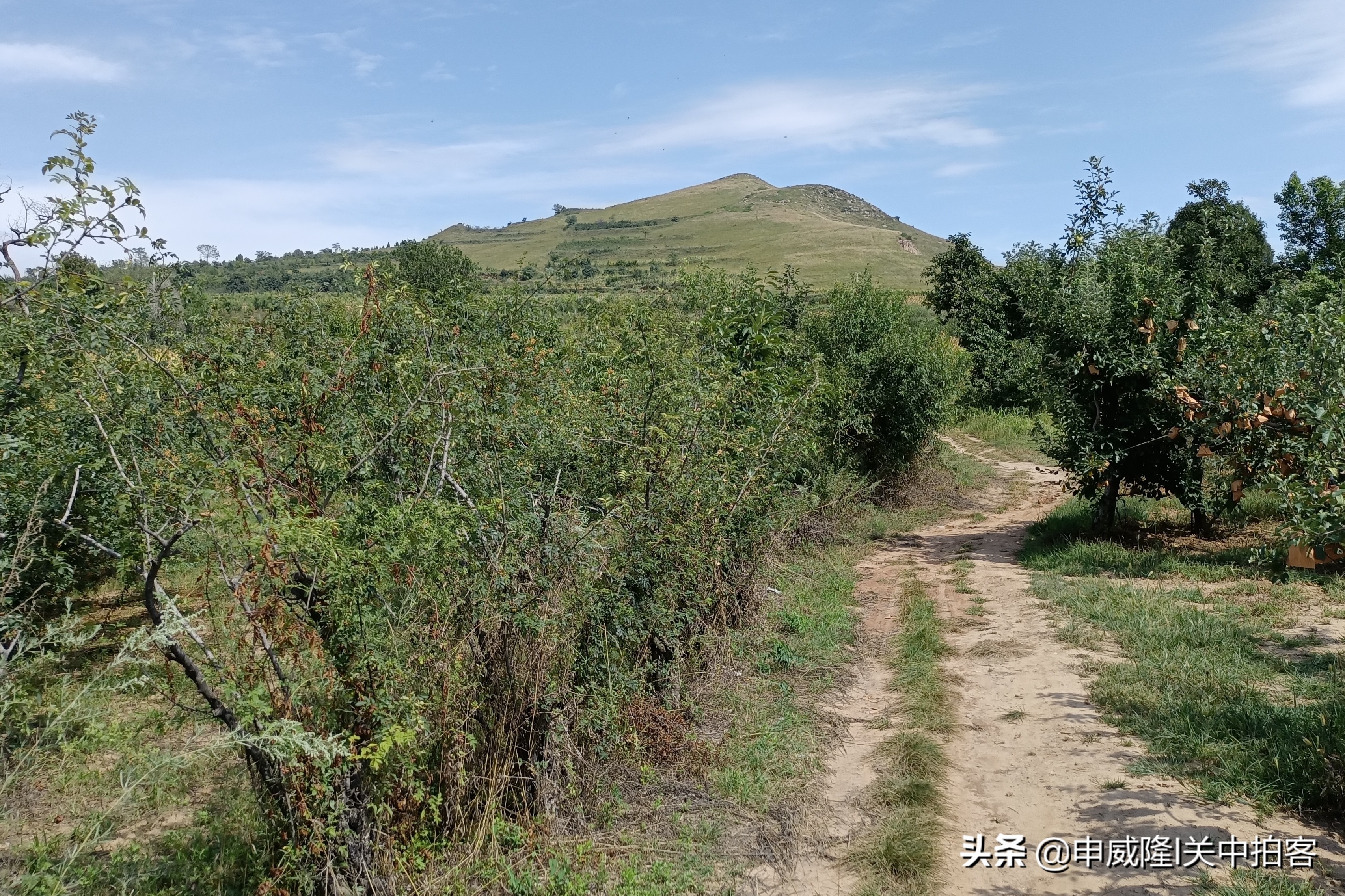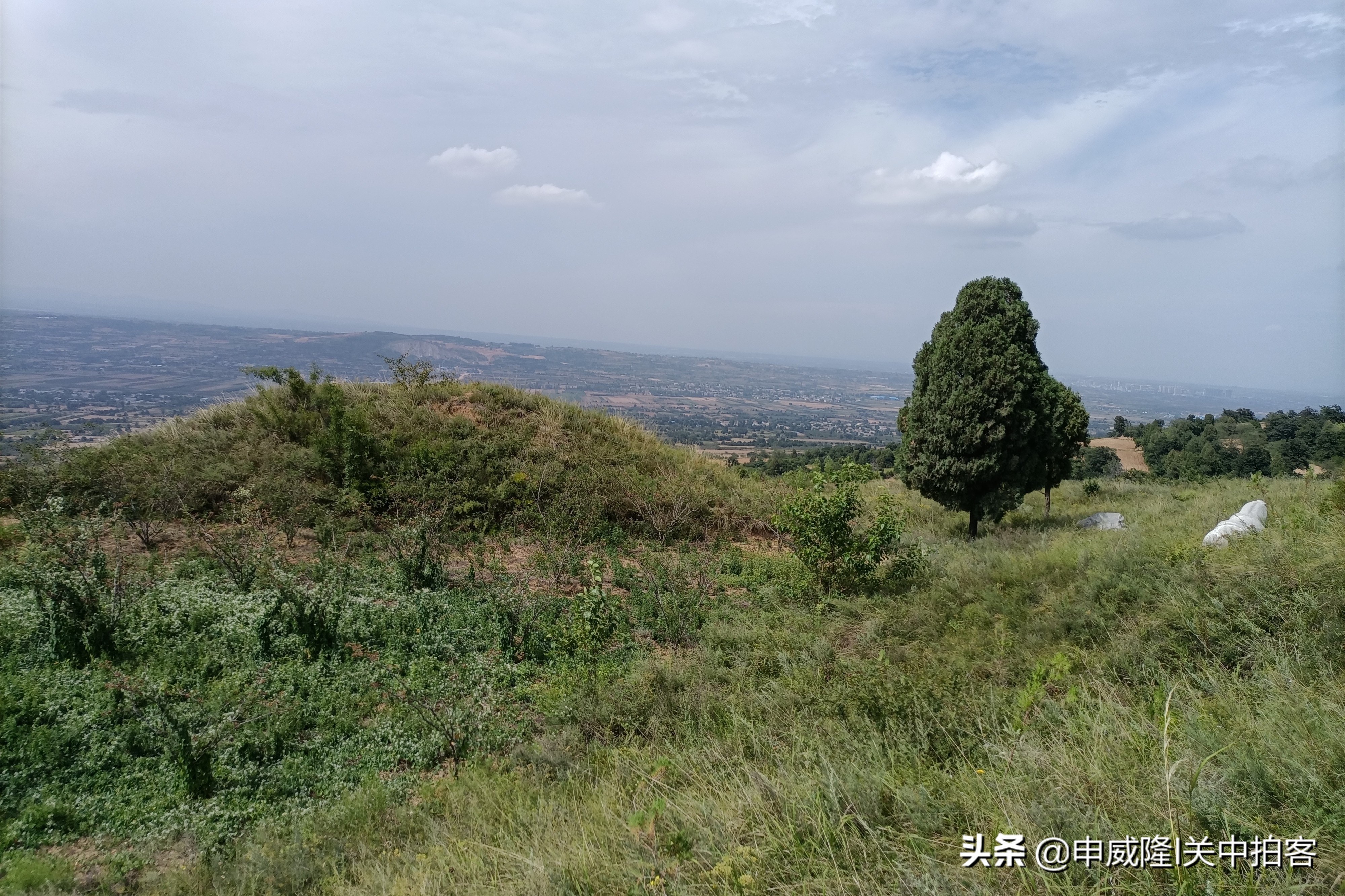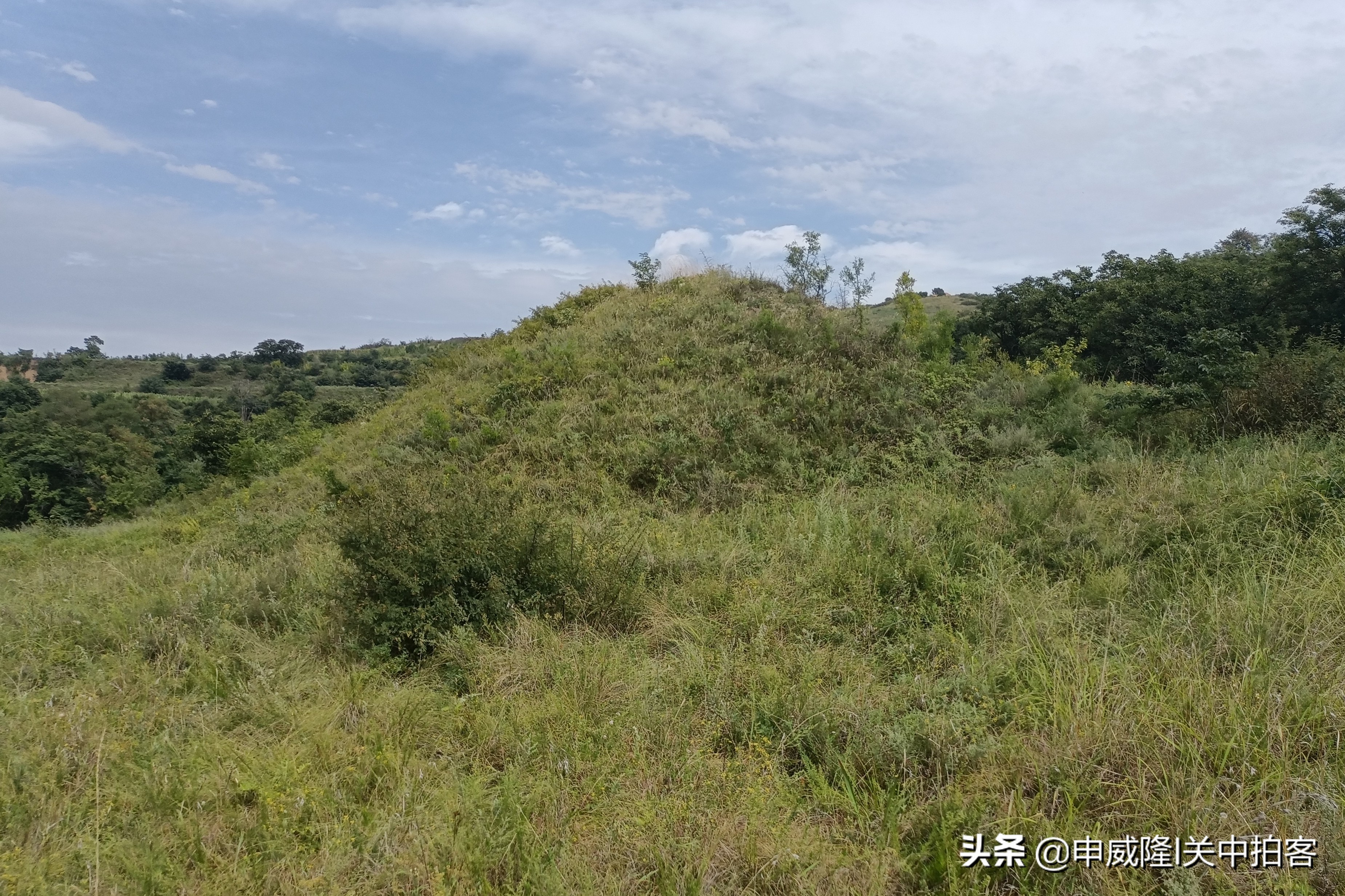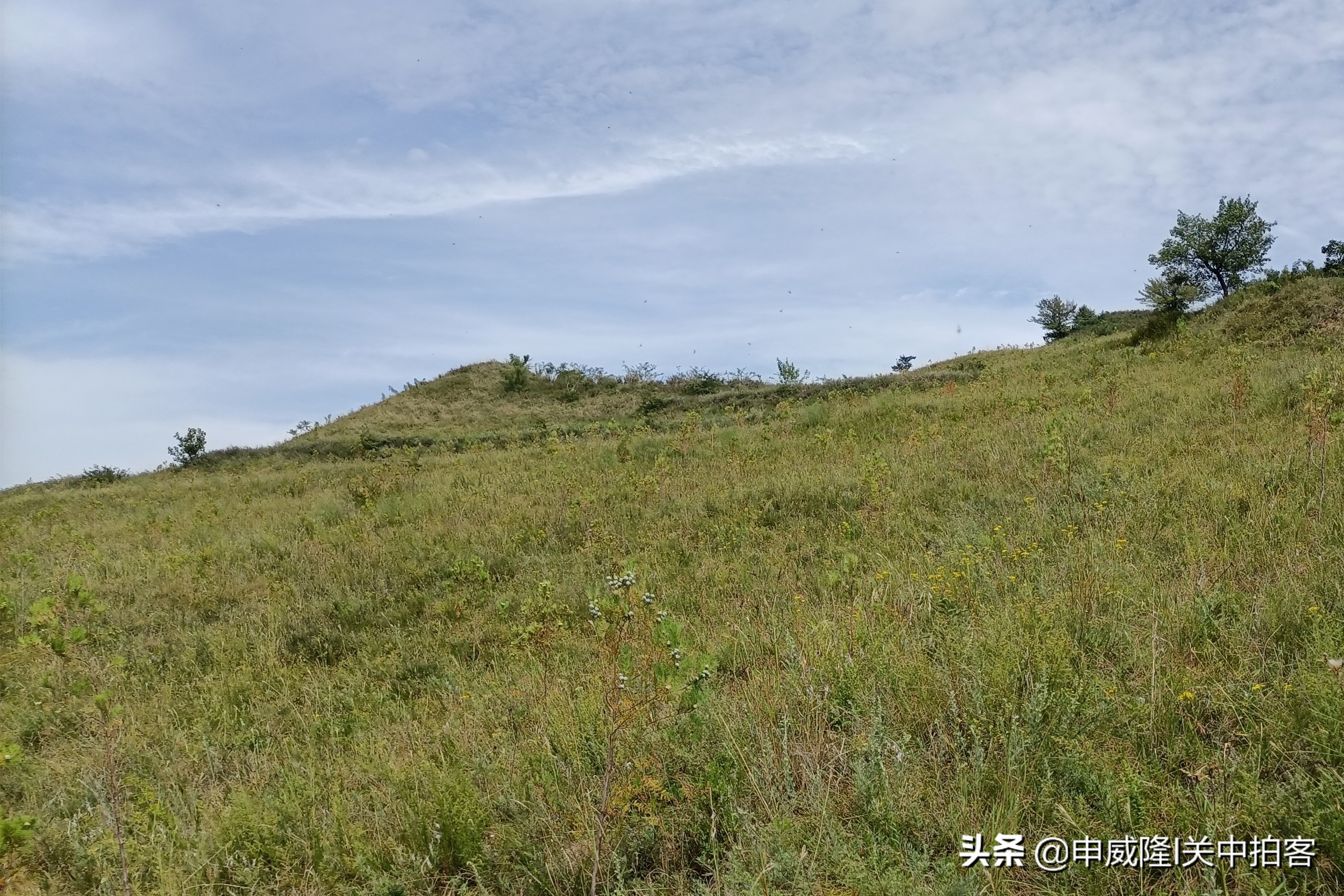 我们将车停在蟠桃村最南端,抬头朝着东南方向望过去,山坡上有一座明显的土堆,那里便是唐光陵北门的阙台遗址。于是,我们沿着曲折的土路,一步一步地登上山坡。最后,周围竟然没有路了!我们穿过草丛,逐渐靠近土堆。