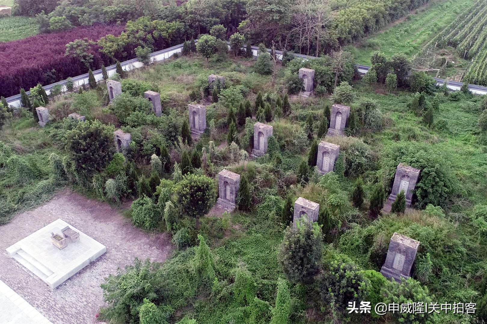 无人机从大门外的广场上升起,从南向北飞过陵园上方,朝着后面的墓地飞过去。在墓冢的前方,有一片祭祀区,两侧树立着众多的纪念碑,包括世界白氏宗亲会、新加坡白氏公会、韩国白氏代表团等白居易家族后裔所立的多块石碑。