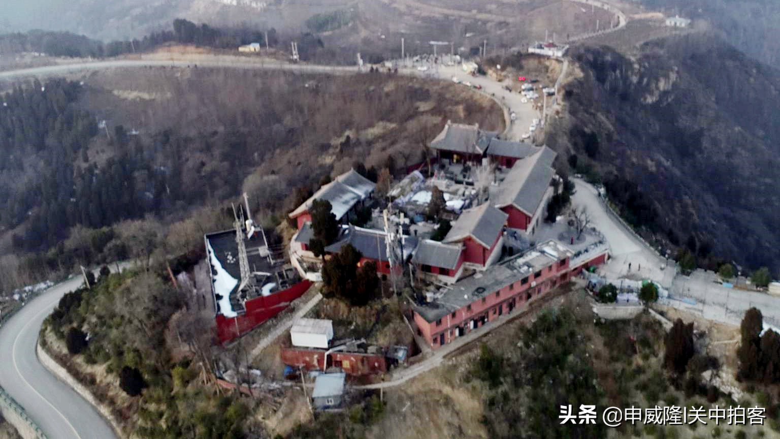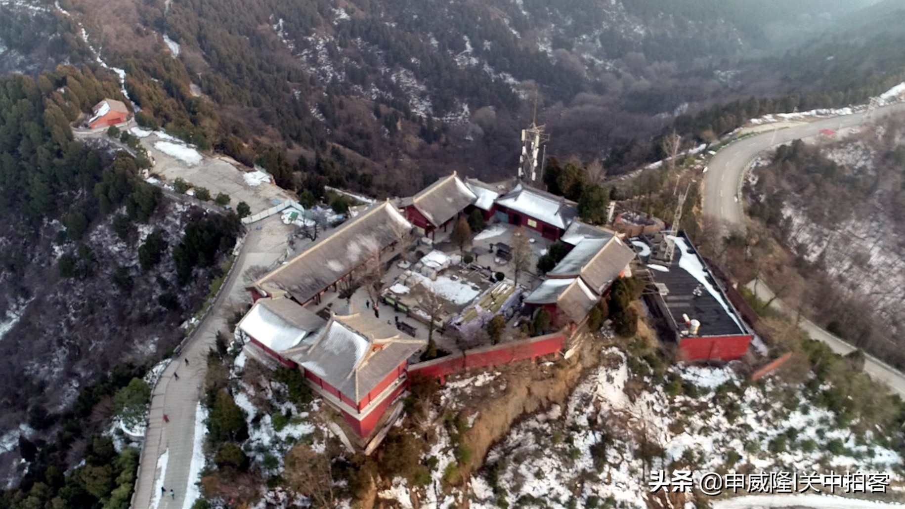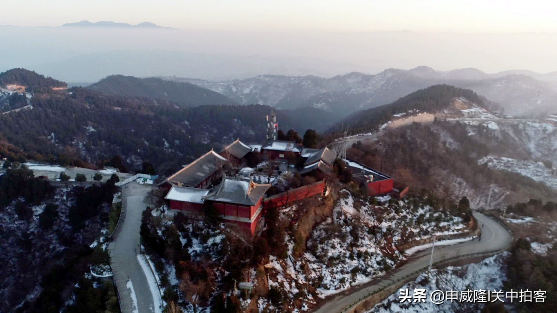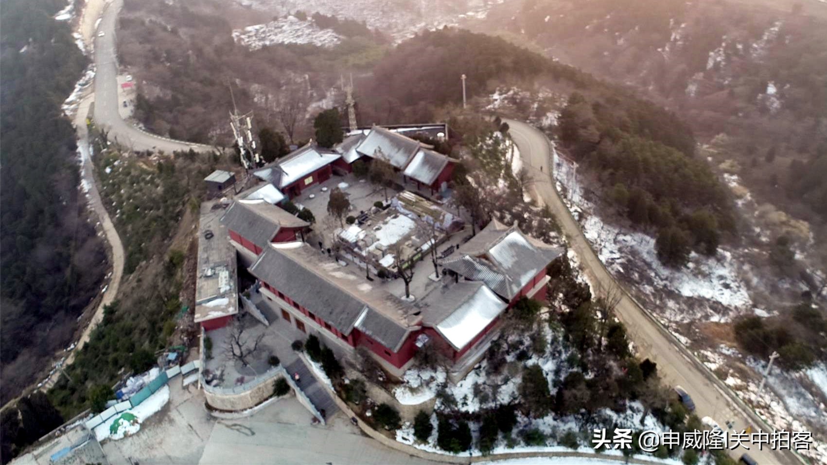 在人祖庙入口处,迎着夕阳的余晖,冒着凛冽的寒风,我操作自己的大疆精灵4无人机对这里进行了航拍。无人机升空以后,环绕人祖庙飞行,庙宇的全貌尽收眼底,周围的环境一览无余。群山连绵起伏,山间白雪皑皑,云雾缭绕,宛若仙境。