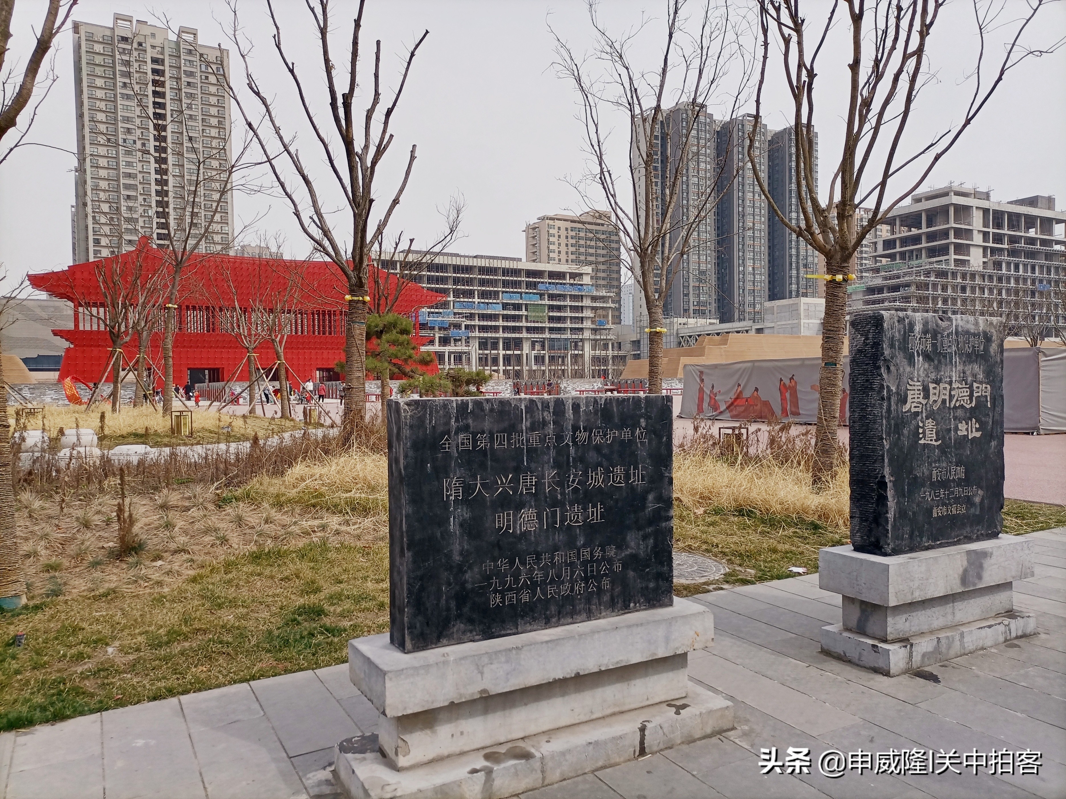 如今,在新建成的明德门考古遗址公园南侧,依然可以看到这块全国重点文物保护单位碑。在这块石碑的旁边,还竖立着一块西安市第一批重点文物保护单位碑,上面写着“唐明德门遗址”五个大字。虽然曾经的石碑依然矗立在原地,但是周围的环境已经发生了翻天覆地的变化。