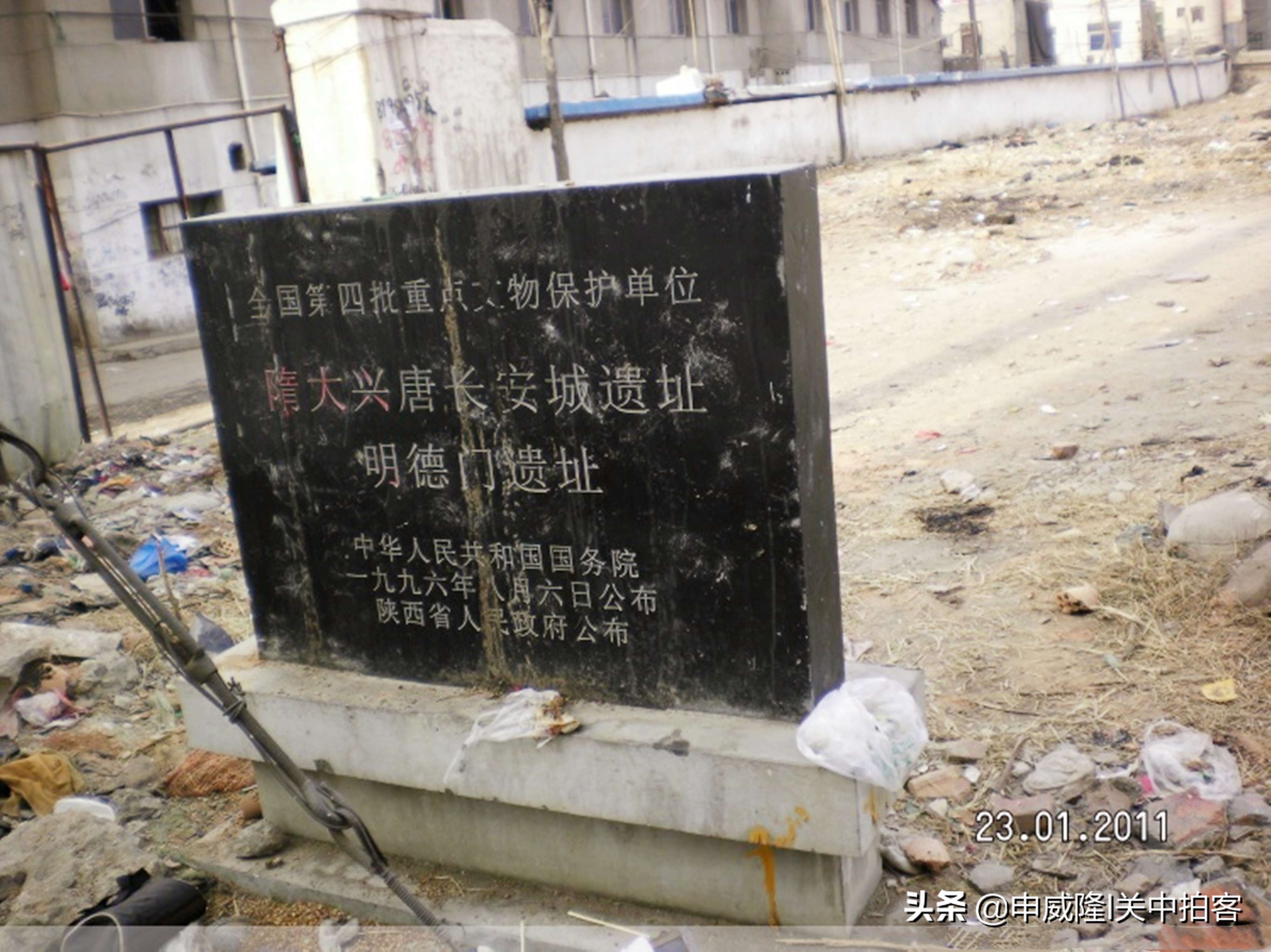 当时,走进明德门遗址所在的围墙内,南北长约100米,东西宽约50米。在这片空地上,到处杂草丛生,堆满生活垃圾,好像一座巨大的垃圾堆。穿过杂草,走到南端,可以看见一块残破的石碑,上面写着“唐明德门遗址”。