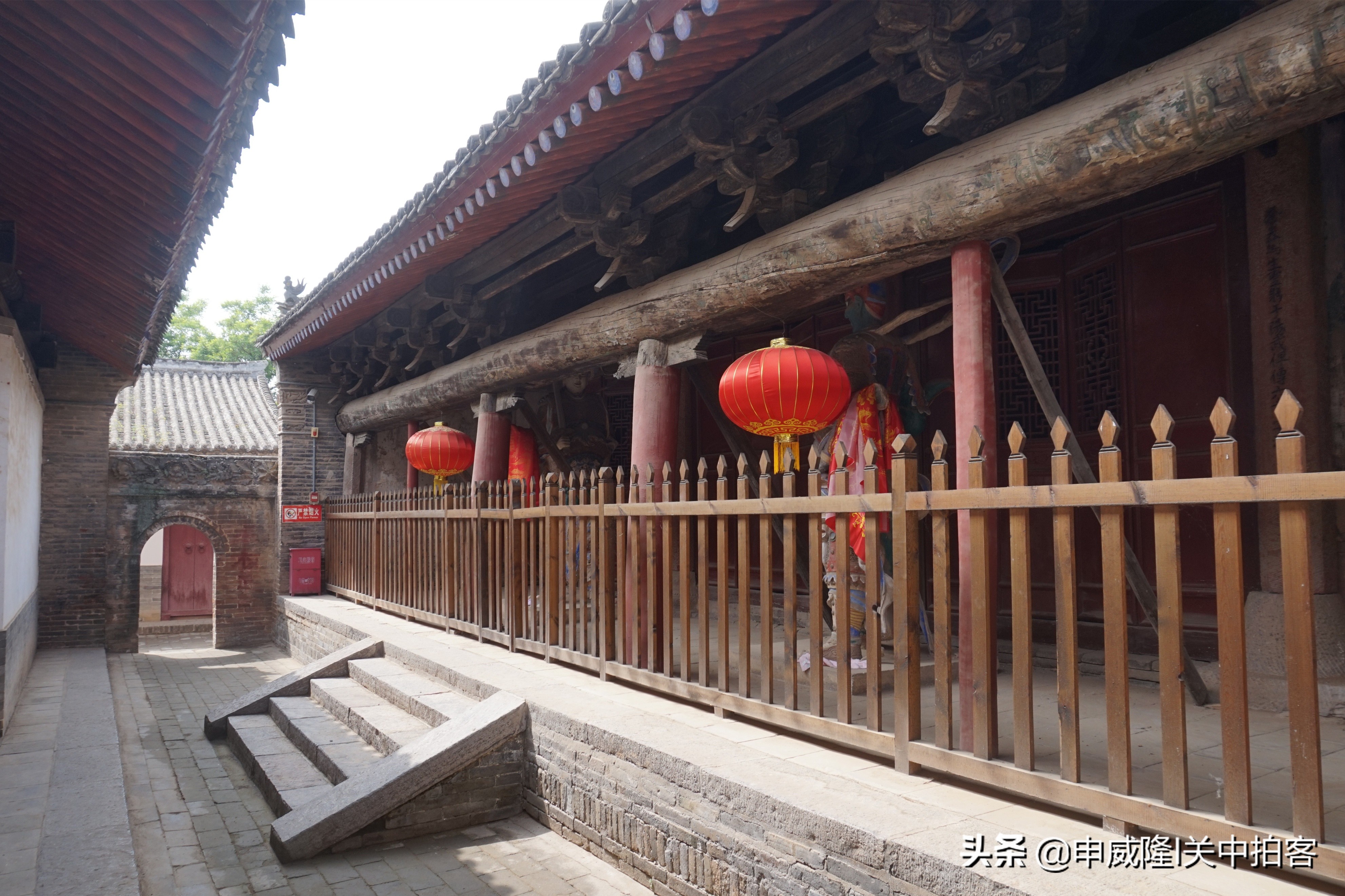 绕到献殿后方,还有一座寝殿,也被称为“后殿”。它的始建年代不详,在宋、金、元、明、清和民国时期进行过修葺。目前,这里有金元时期的遗构,为“明三暗五”的形式,通面阔五间,两梢为穿堂,进深一间,前檐带廊。据说,在殿内三面墙上尚存17幅壁画,内容为黄帝和仓颉造字的传说故事。
