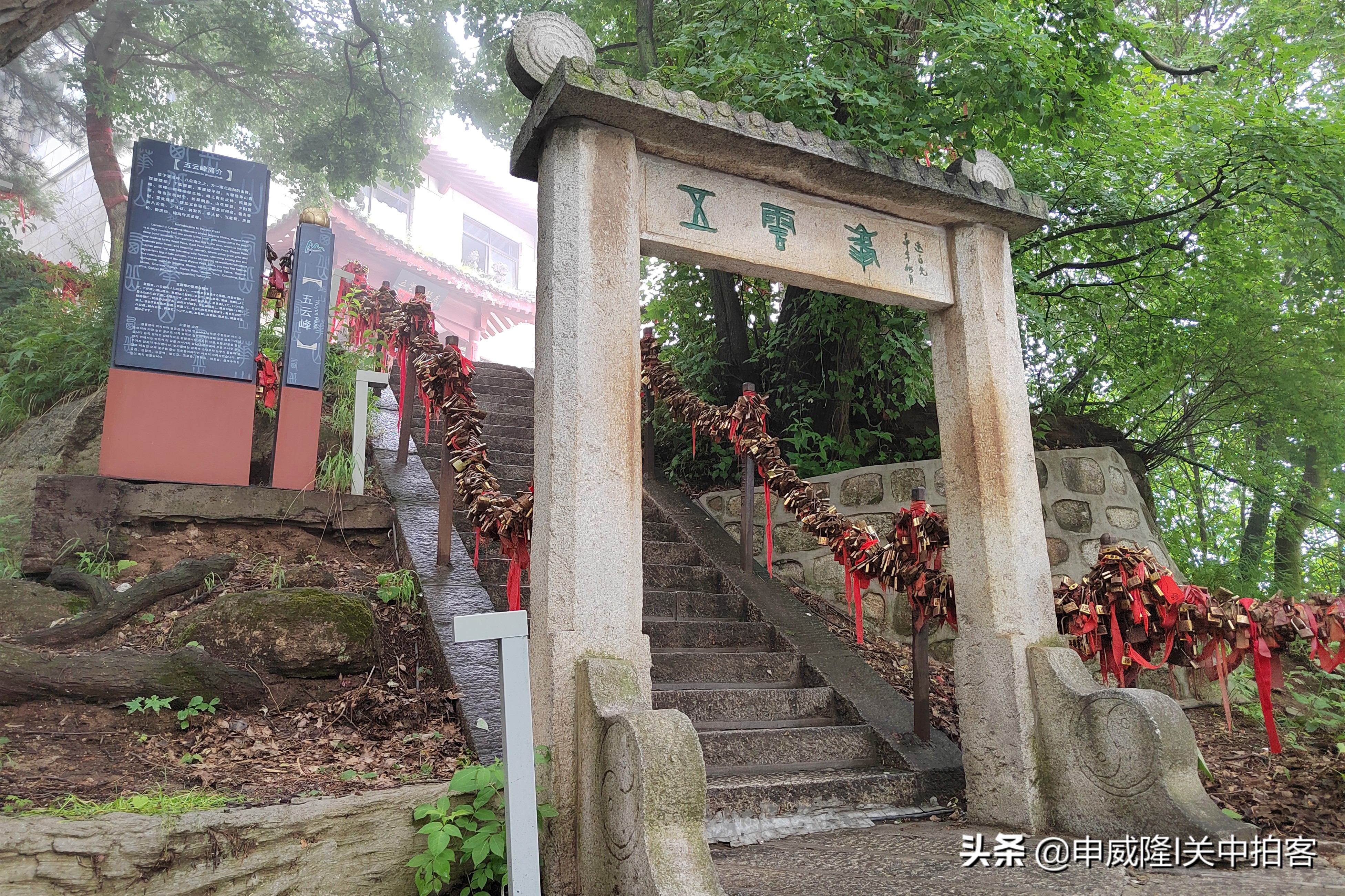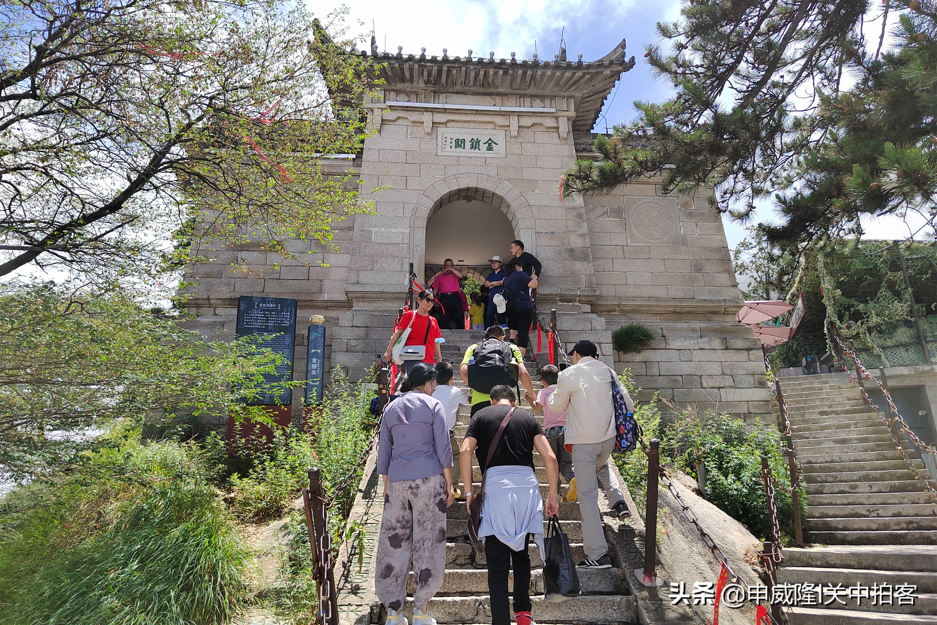 继续向上约1分钟,便可以看见金锁关的大门。这里是经过五云峰前往中、东、南、西峰的咽喉要道,有一座城楼般的石拱门,锁关后则无法通往四峰。道家认为,华岳为仙乡神府,只有过了金锁关,才算进入仙境中。