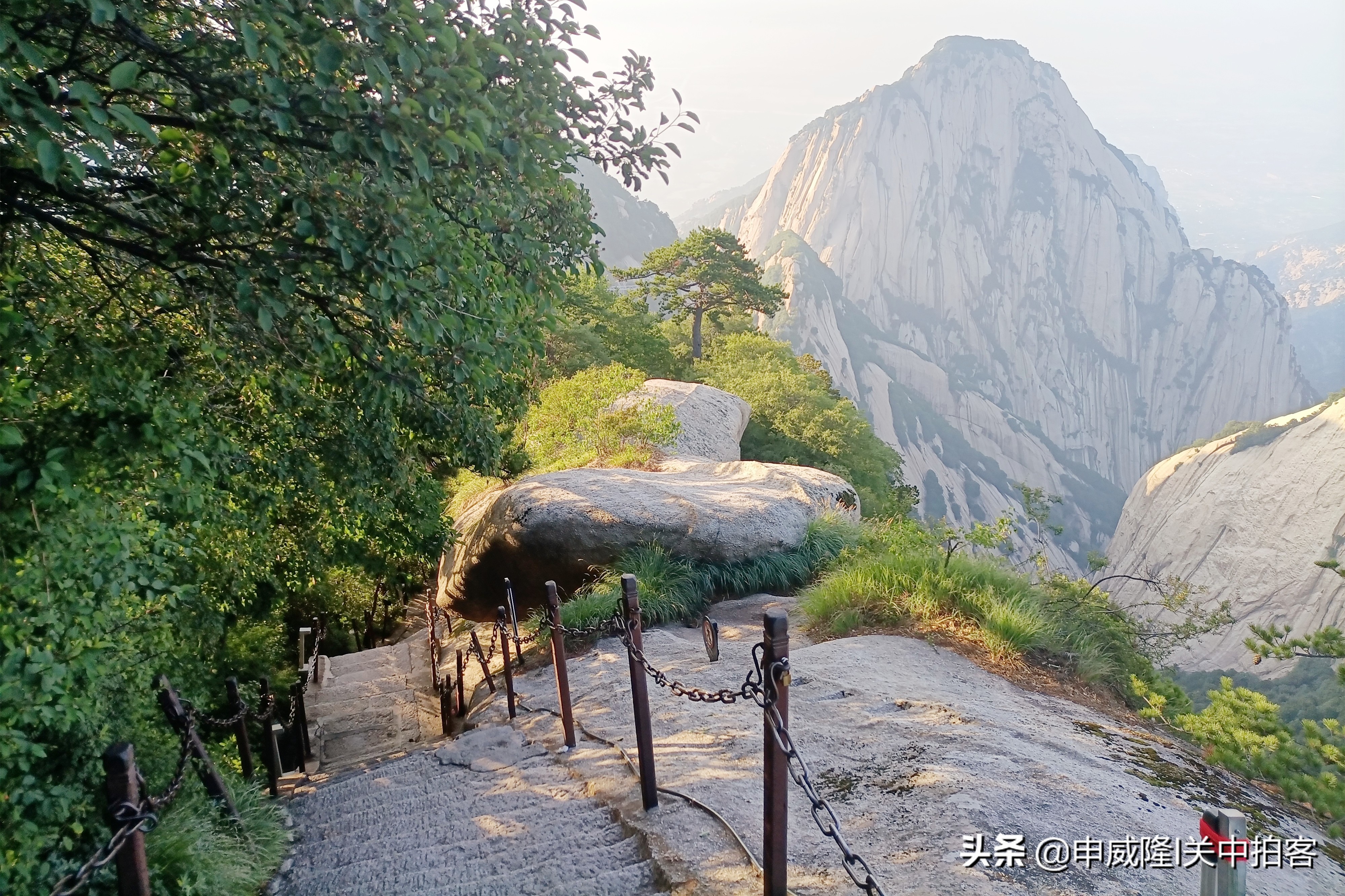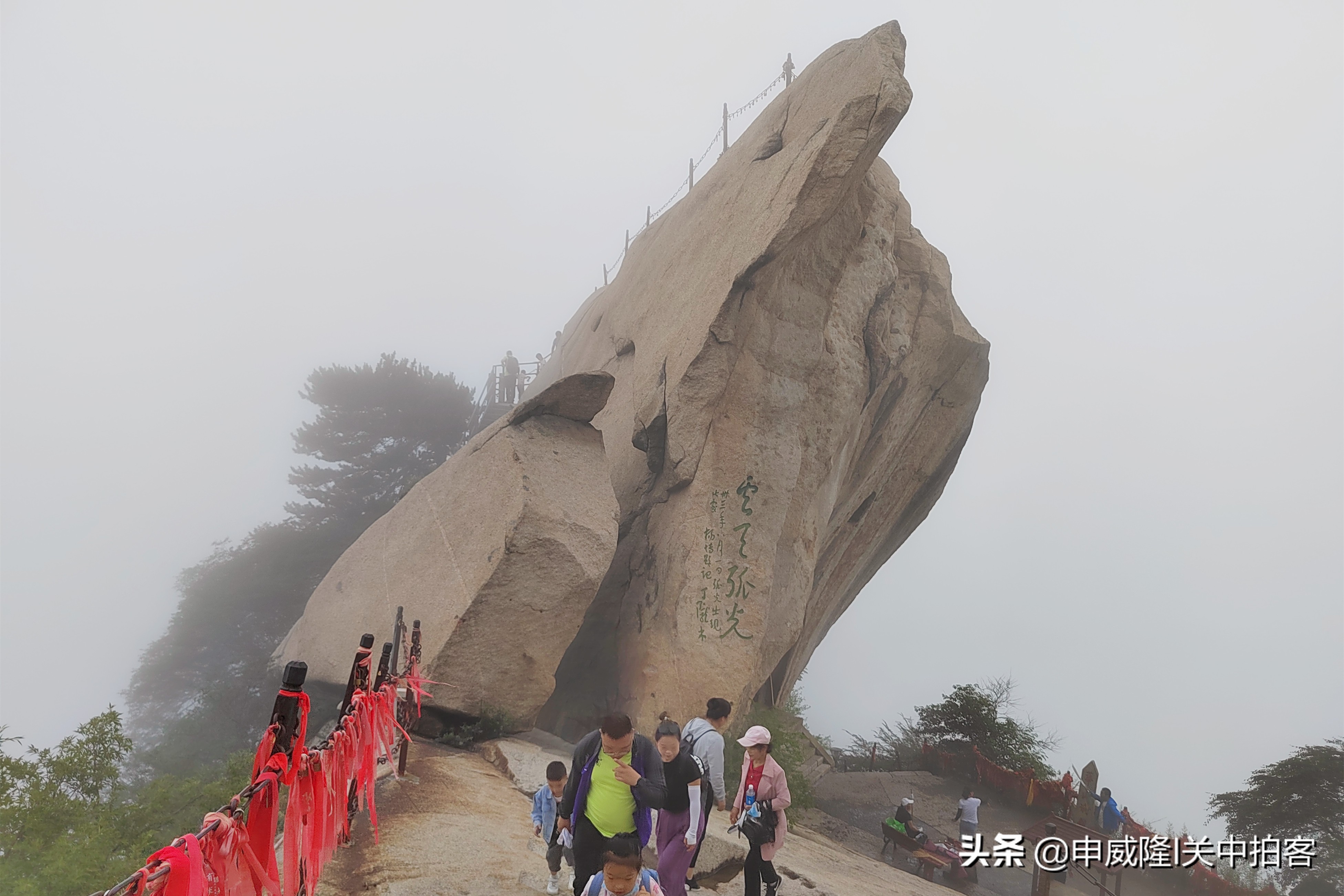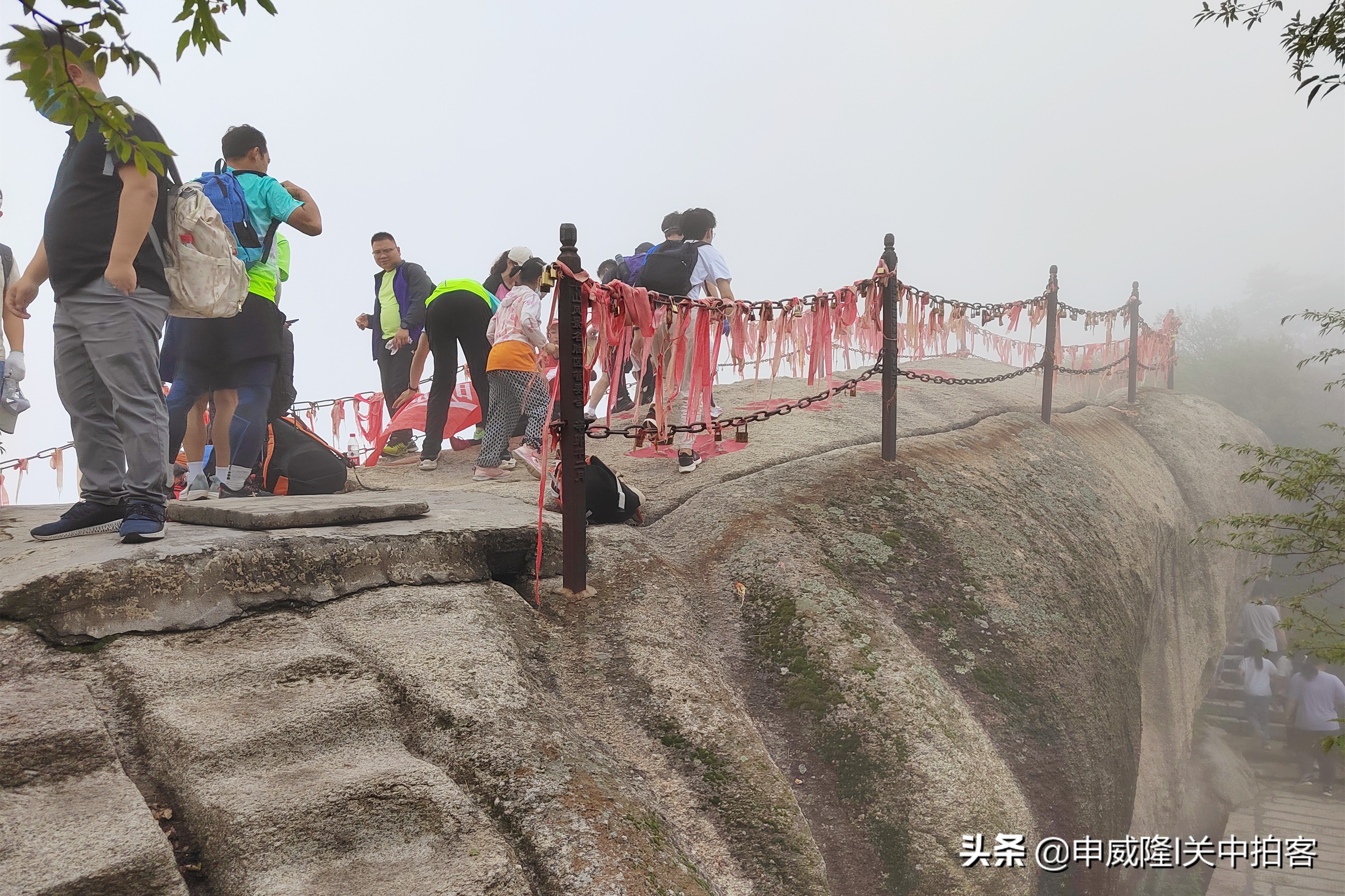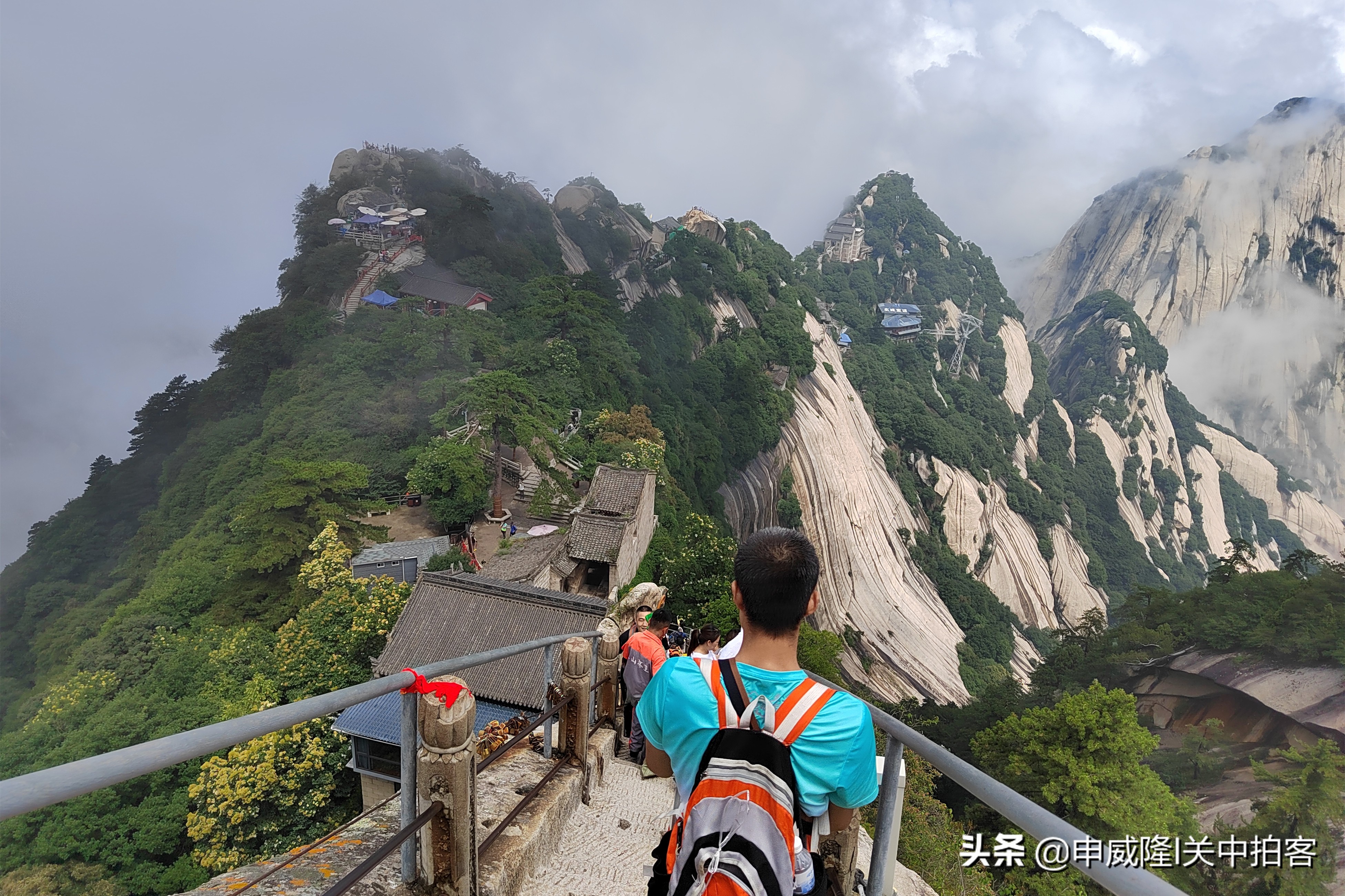 上午9点25分,我们乘坐北峰索道登上华山后,先前往北峰顶,眺望华山全貌。然后,从北向南,沿着山脊,经过擦耳崖、卧牛石、苍龙岭、五云峰、金锁关等地到达主峰——