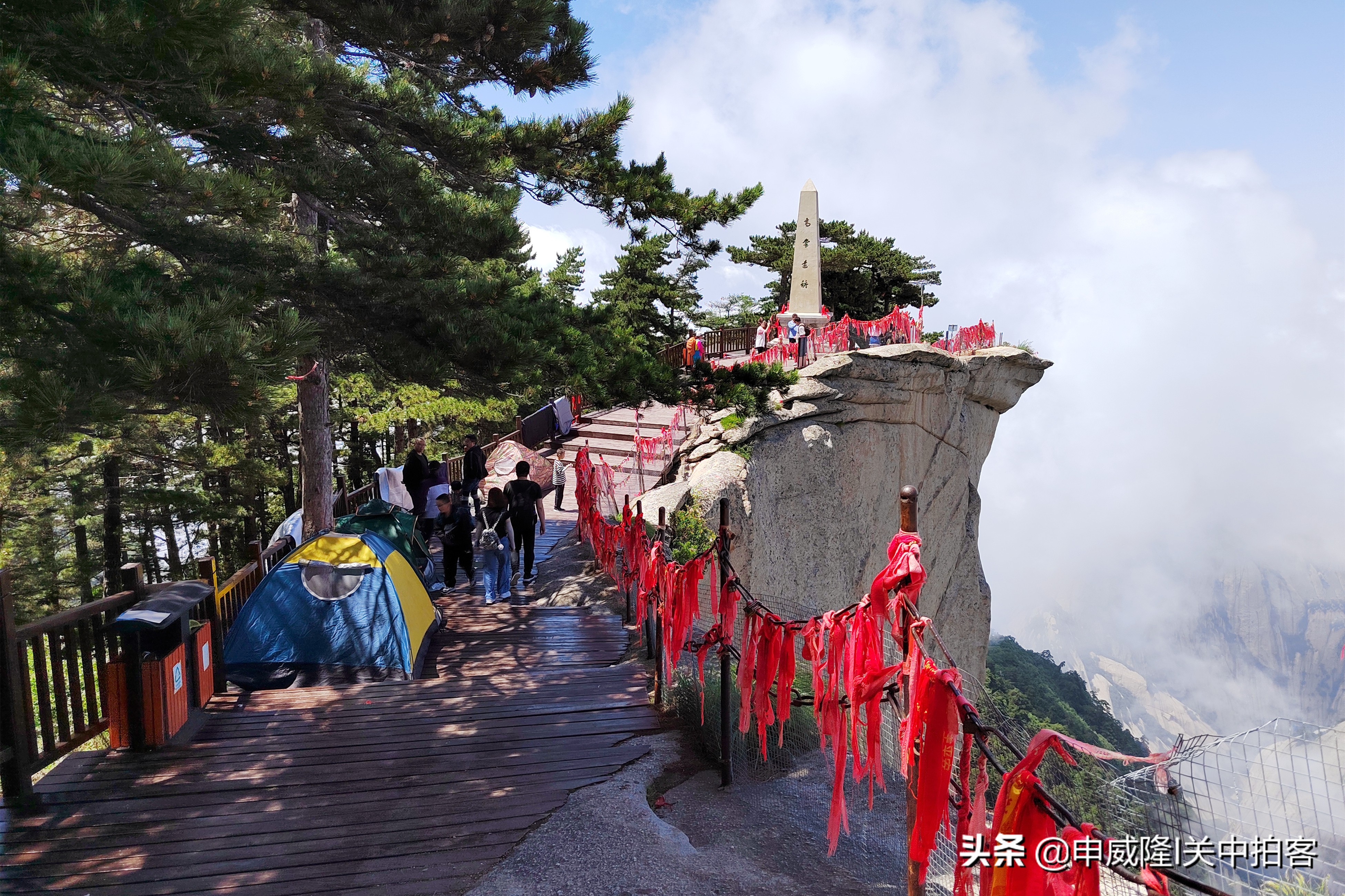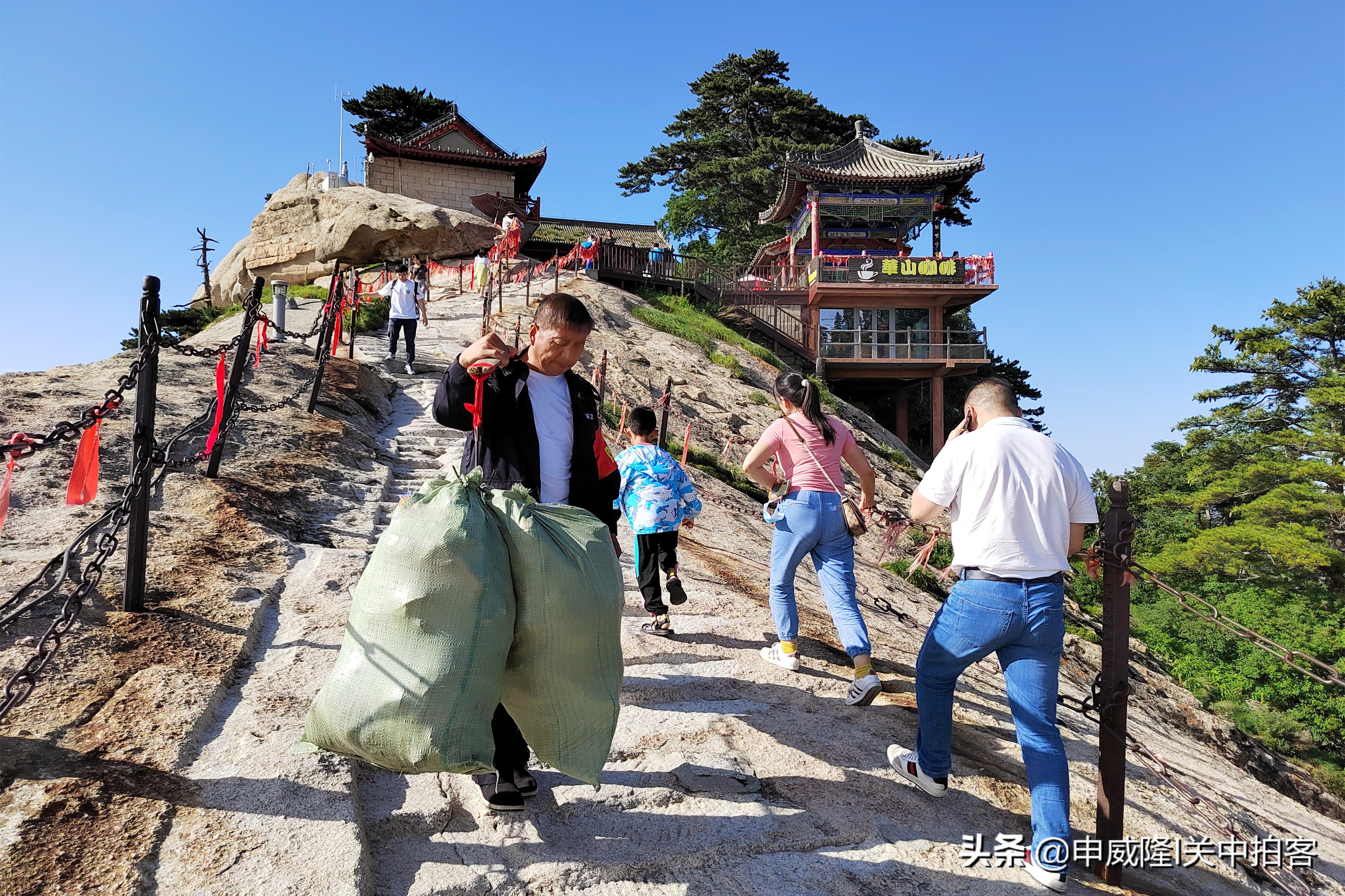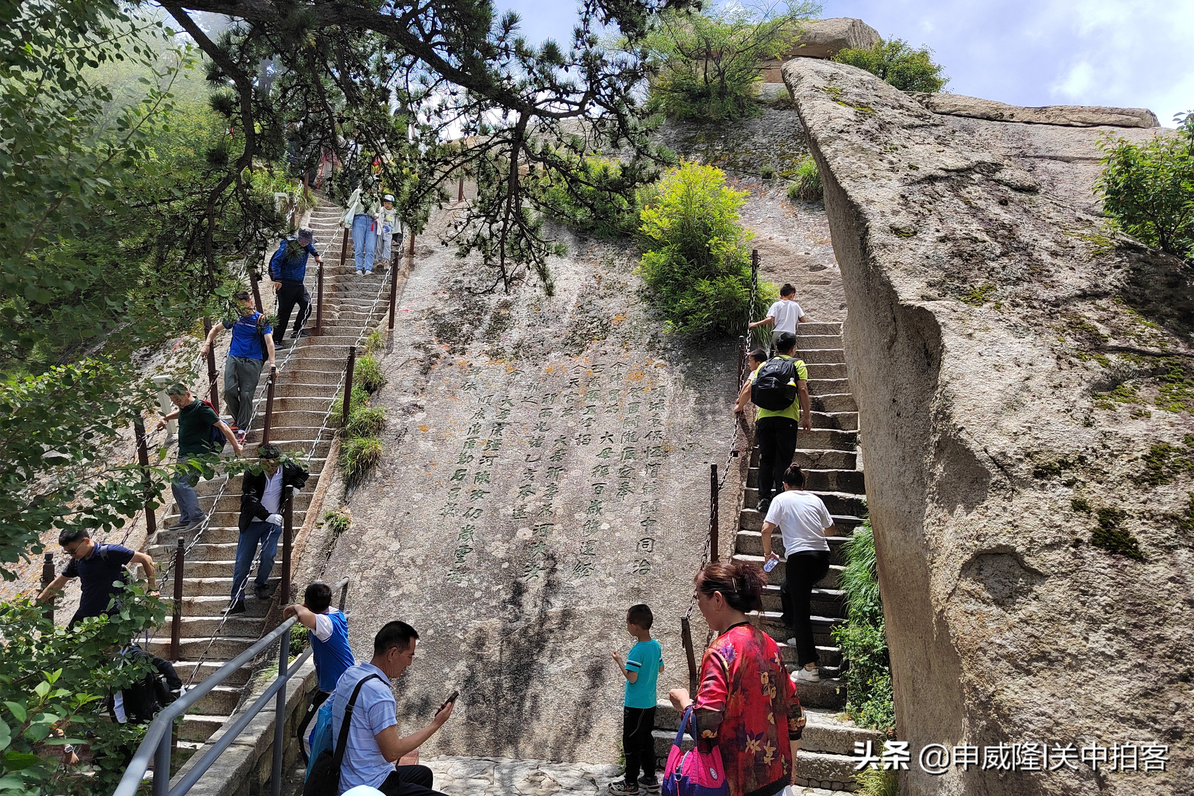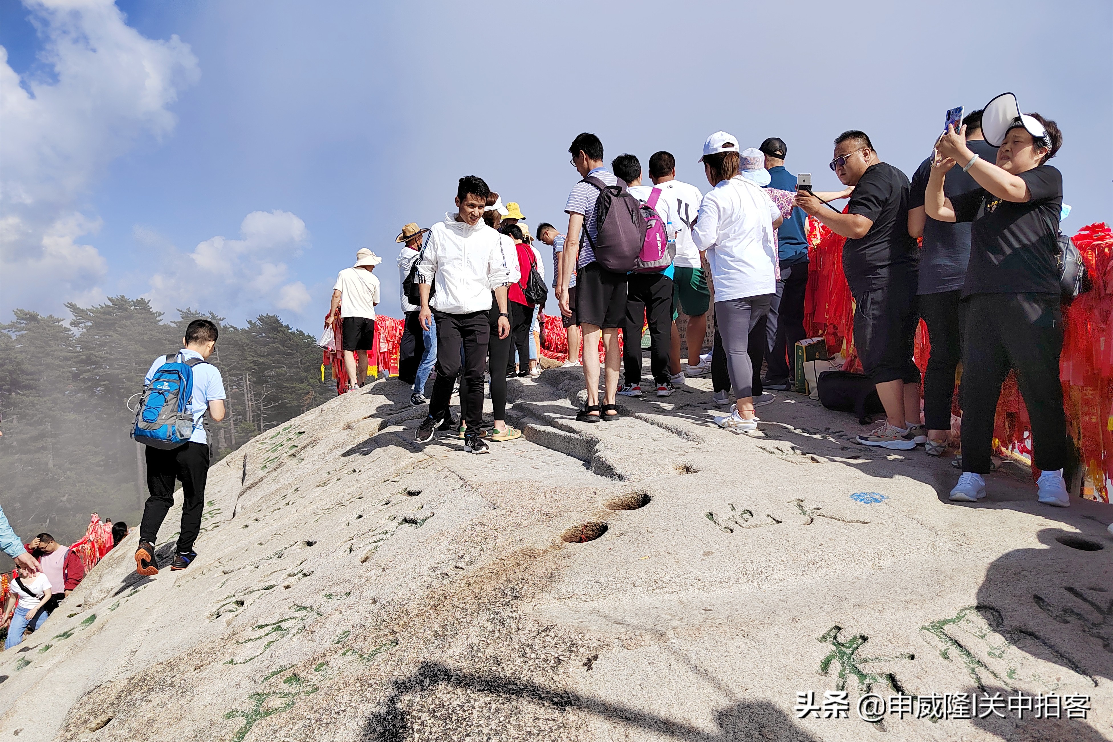 上午9点25分,我们乘坐北峰索道登上华山后,先前往北峰顶,眺望华山全貌。然后,从北向南,沿着山脊,经过擦耳崖、卧牛石、苍龙岭、五云峰、金锁关等地到达主峰——