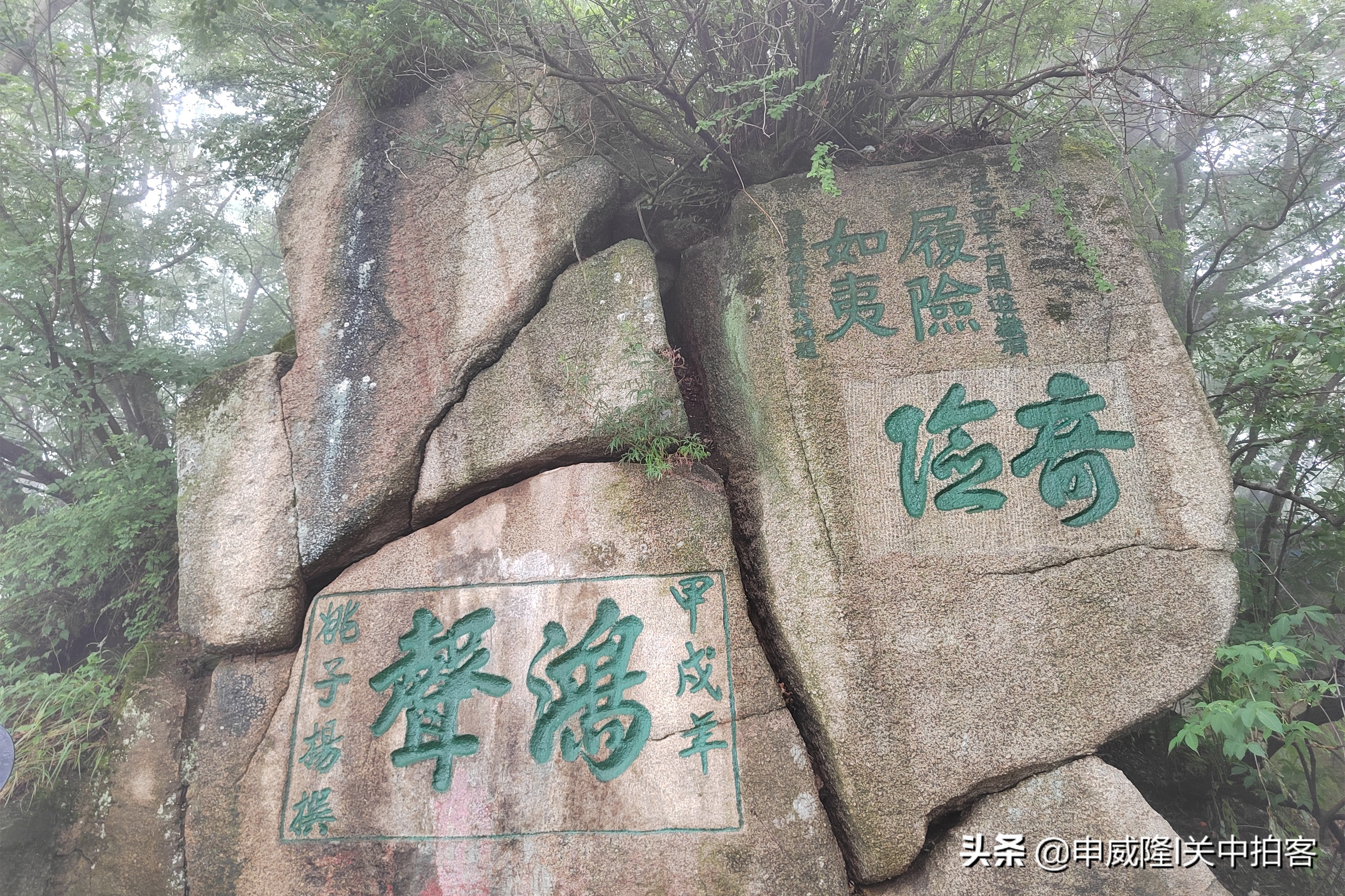中午12点40分,经过一块空地,被称为“鸿声台”。这里的岩石上,可以看到很多摩崖题刻,包括“履险如夷”“奇险”和“鸿声”等文字。周围是大片松林,每当山风吹过时,犹如万马奔腾,似黄河大合唱。