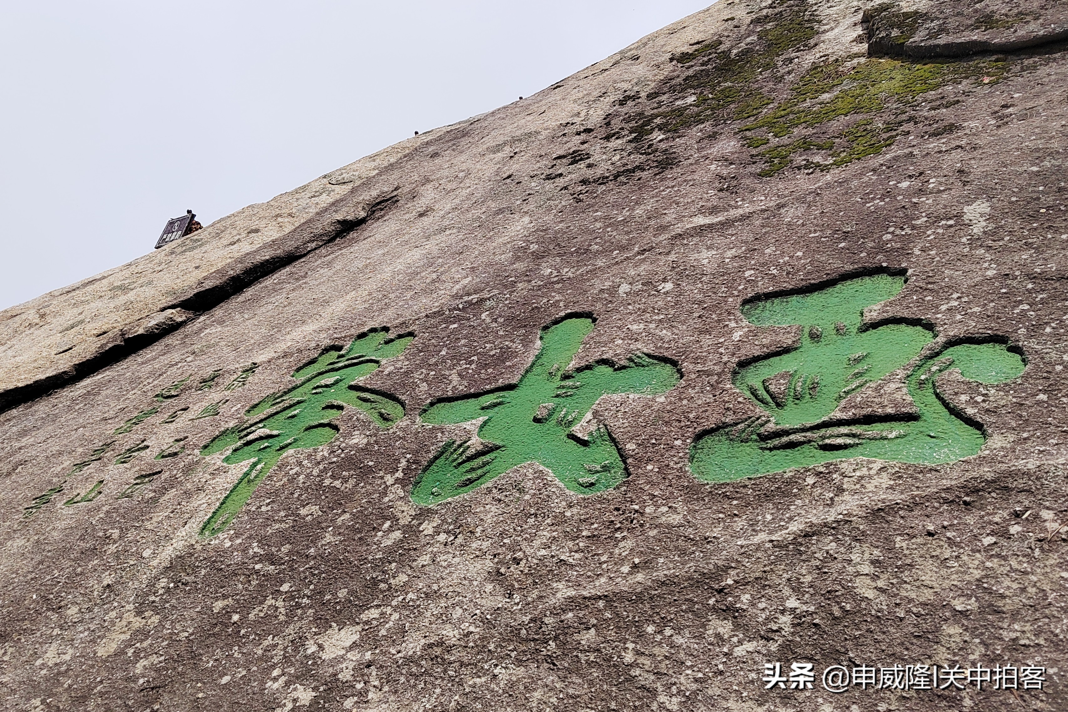 上午10点40分,绕过天梯之后,迎面出现一块巨大的立石,表面镌刻着“云天弧光”四个字。据说,这块岩石分裂为两个部分,较大的一块岩石为日,较小的一块岩石为月,合称为“日月岩”。