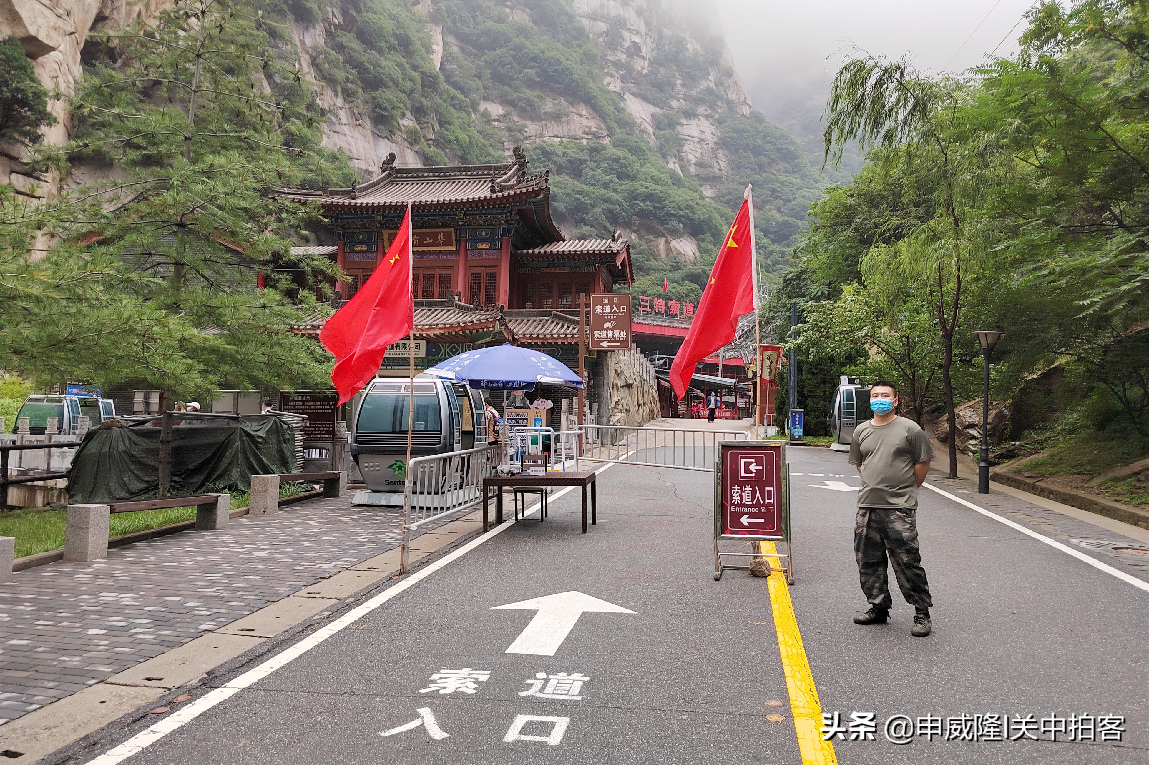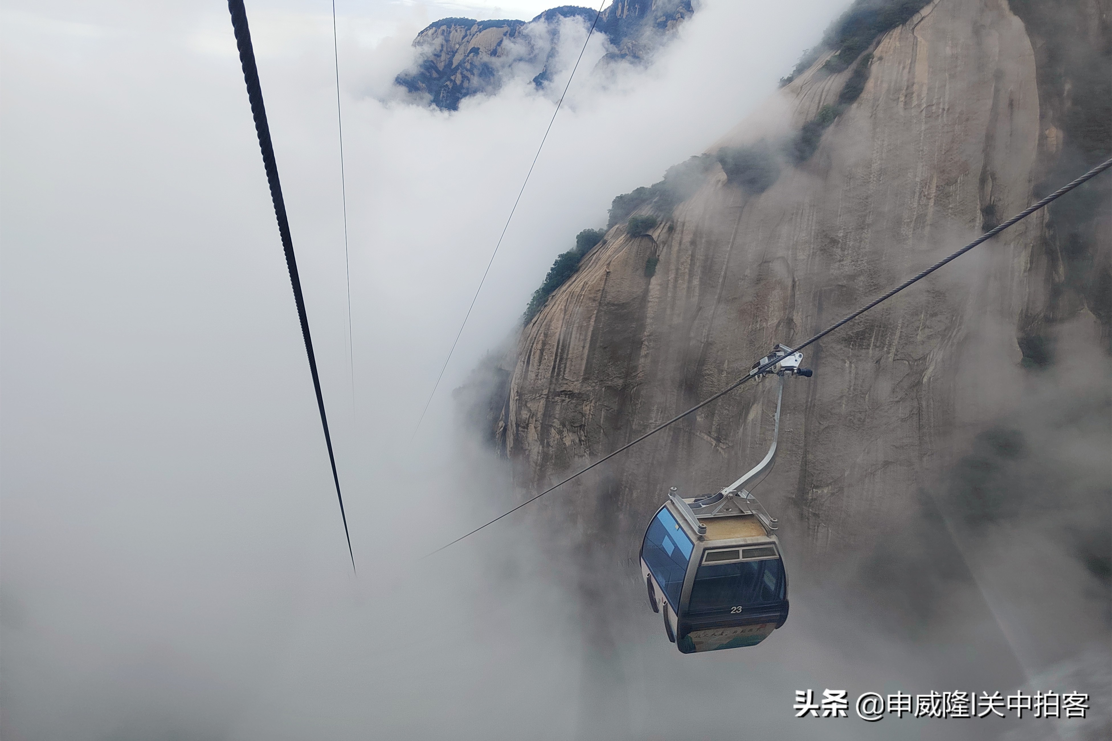 早上8点多,我们到达华山游客中心,从这里的东线通道进入景区。乘坐进山车,经过15分钟,到达华山东侧黄甫峪内的瓦庙沟。在这里乘坐北峰索道,沿着“智取华山路”的上方,经过10分钟便到达华山北峰。雨过天晴,雾气升腾,坐在缆车内,仿佛置身于仙境之中。