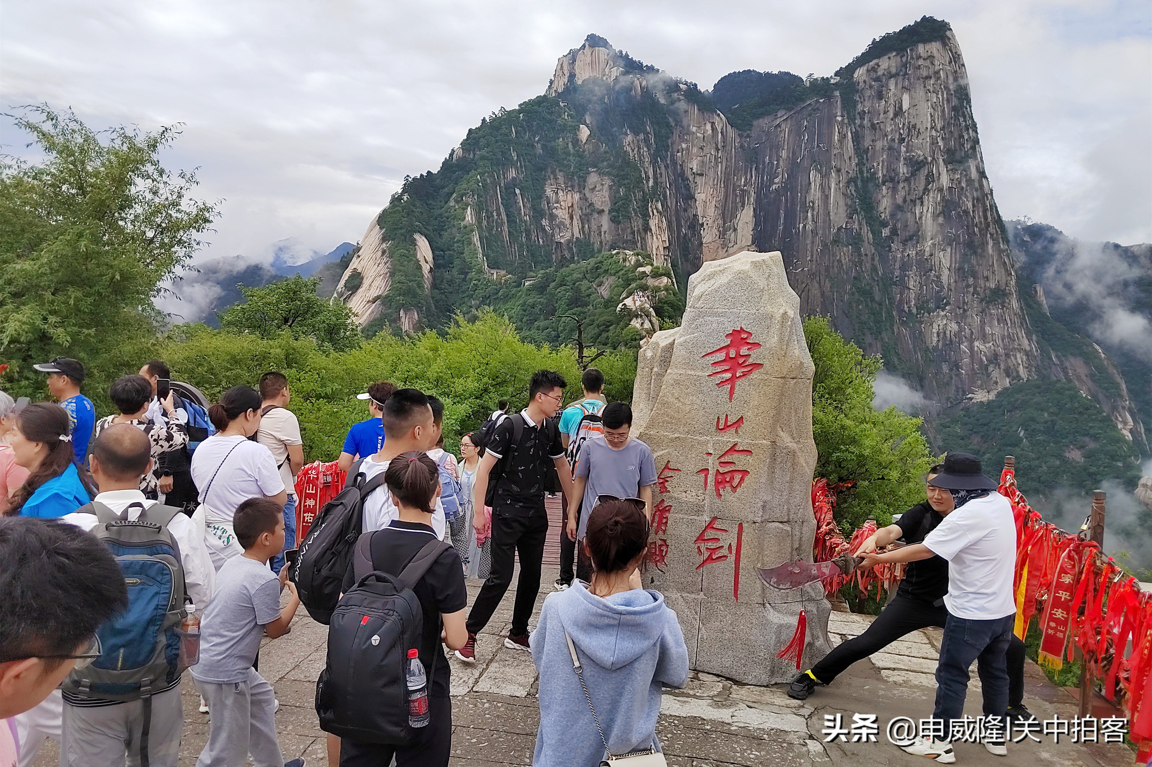 离开北峰索道,沿着台阶向上,经过25分钟到达北峰顶。这里视野很好,游客聚集于此,都在争先恐后地跟金庸题写的“华山论剑”四个大字合影留念,背景就是气势恢宏的华山四座主峰(东峰、中峰、南峰、西峰)。