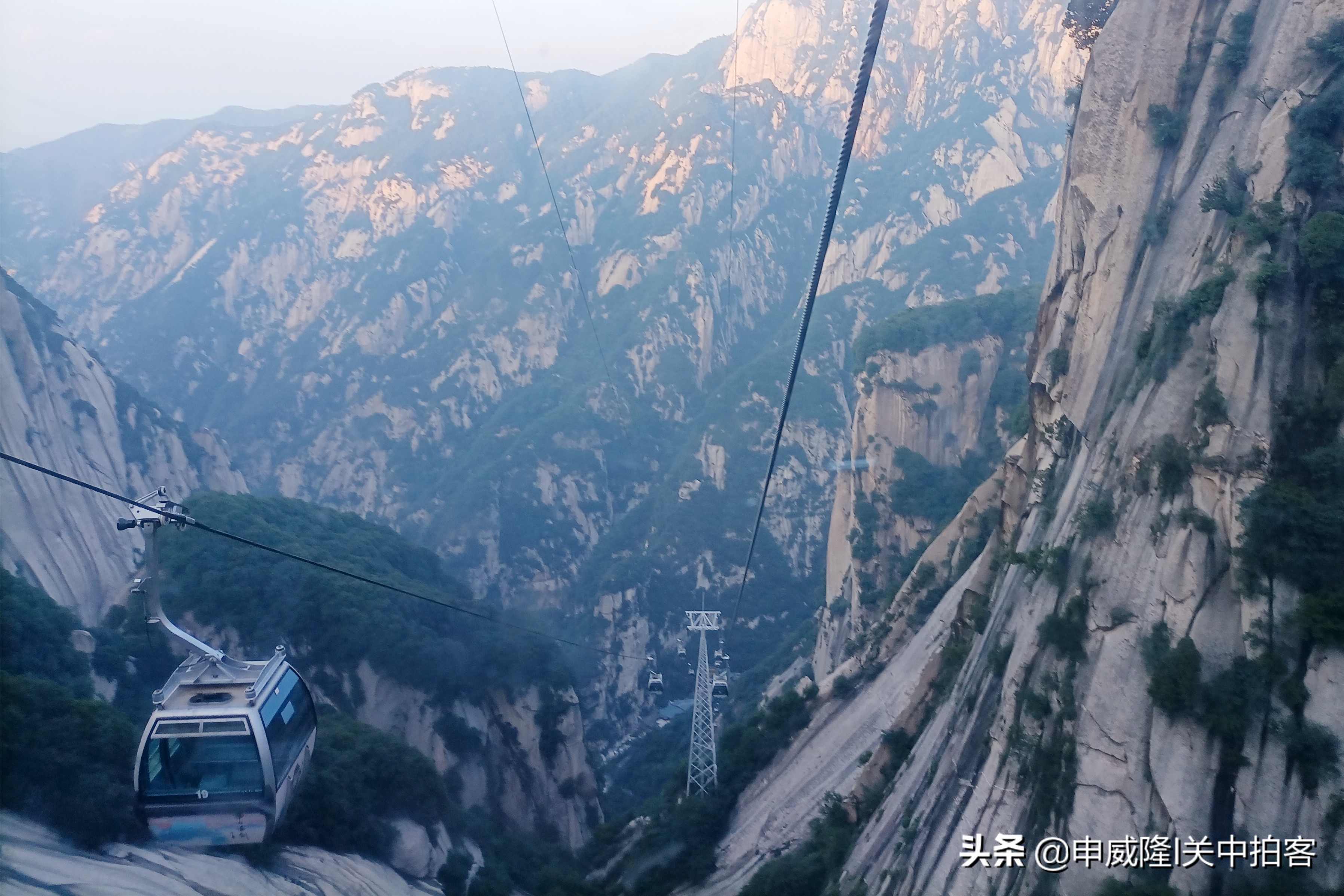 傍晚7点15分,赶到北峰索道,乘坐缆车下山。跟清晨不同,云雾已散去,坐在下行的缆车上,可以俯瞰下方“智取华山路”的壮丽景色。