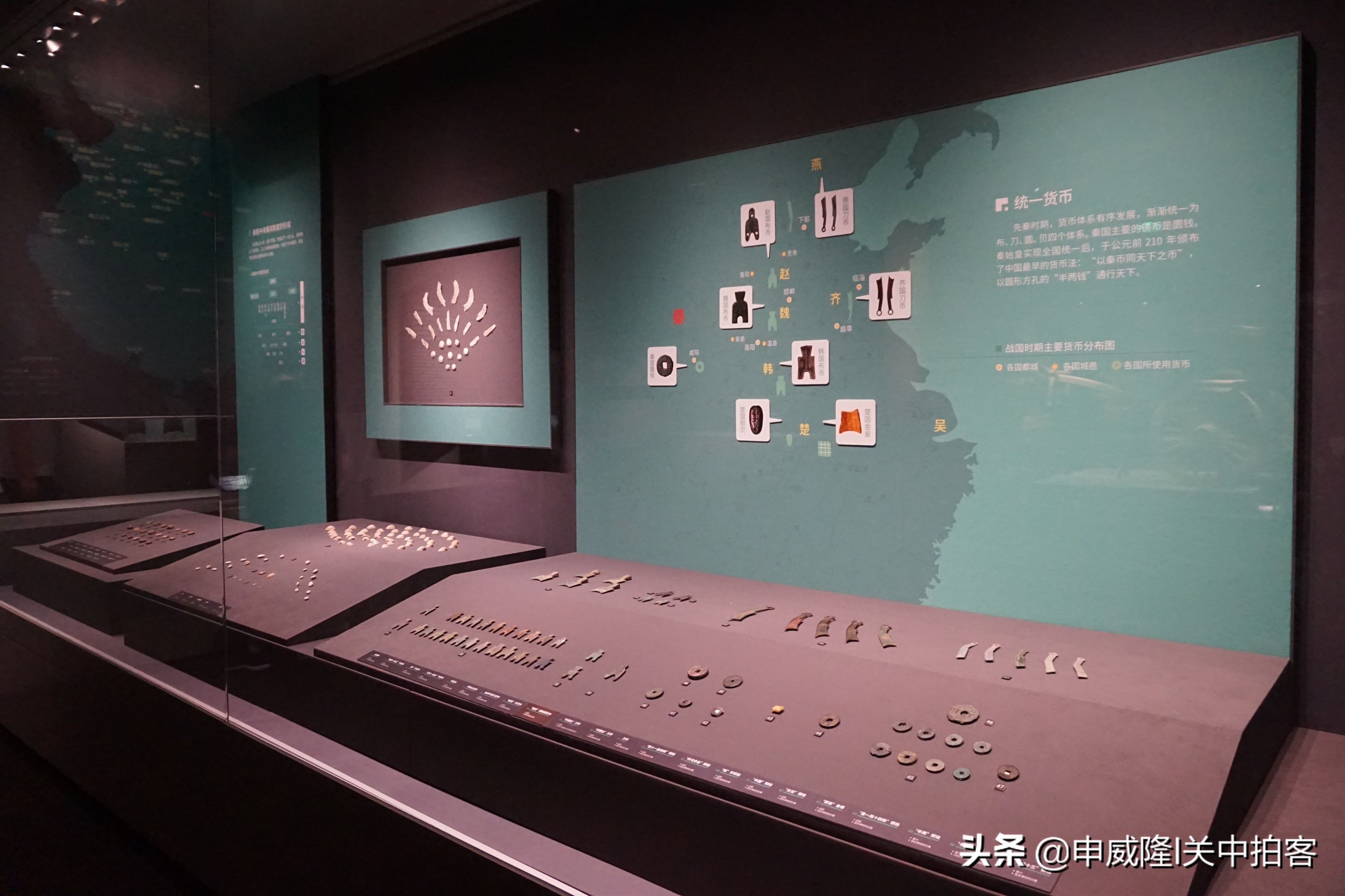 这里展示了西周至秦代时期的各种货币,从早期的贝币到后来流行的金属货币,从形态各异的钱币到统一的方孔圆钱,从一个侧面反映秦人统一六国的历史。公元前221年,秦始皇统一全国,颁布车同轨,书同文,行同伦,地同域,量同衡,币同形的政策,将过去六国使用的铲币、刀币、环钱等统一为秦国使用的半两钱币。