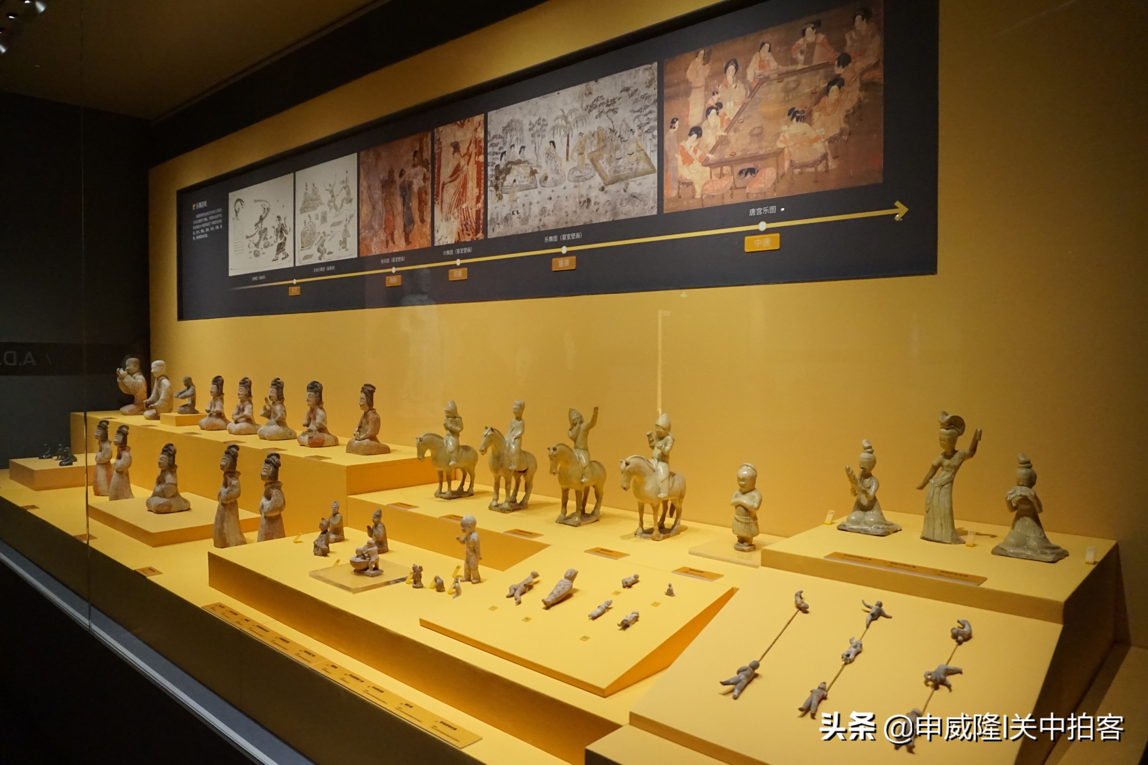旁边的展柜之中,结合古代的绘画,展示了汉代、十六国至隋唐时期的陶俑,反映了不同时期人们生活娱乐的真实场景。隋代的黄釉骑马俑和乐舞俑,数量稀少,价值珍贵。