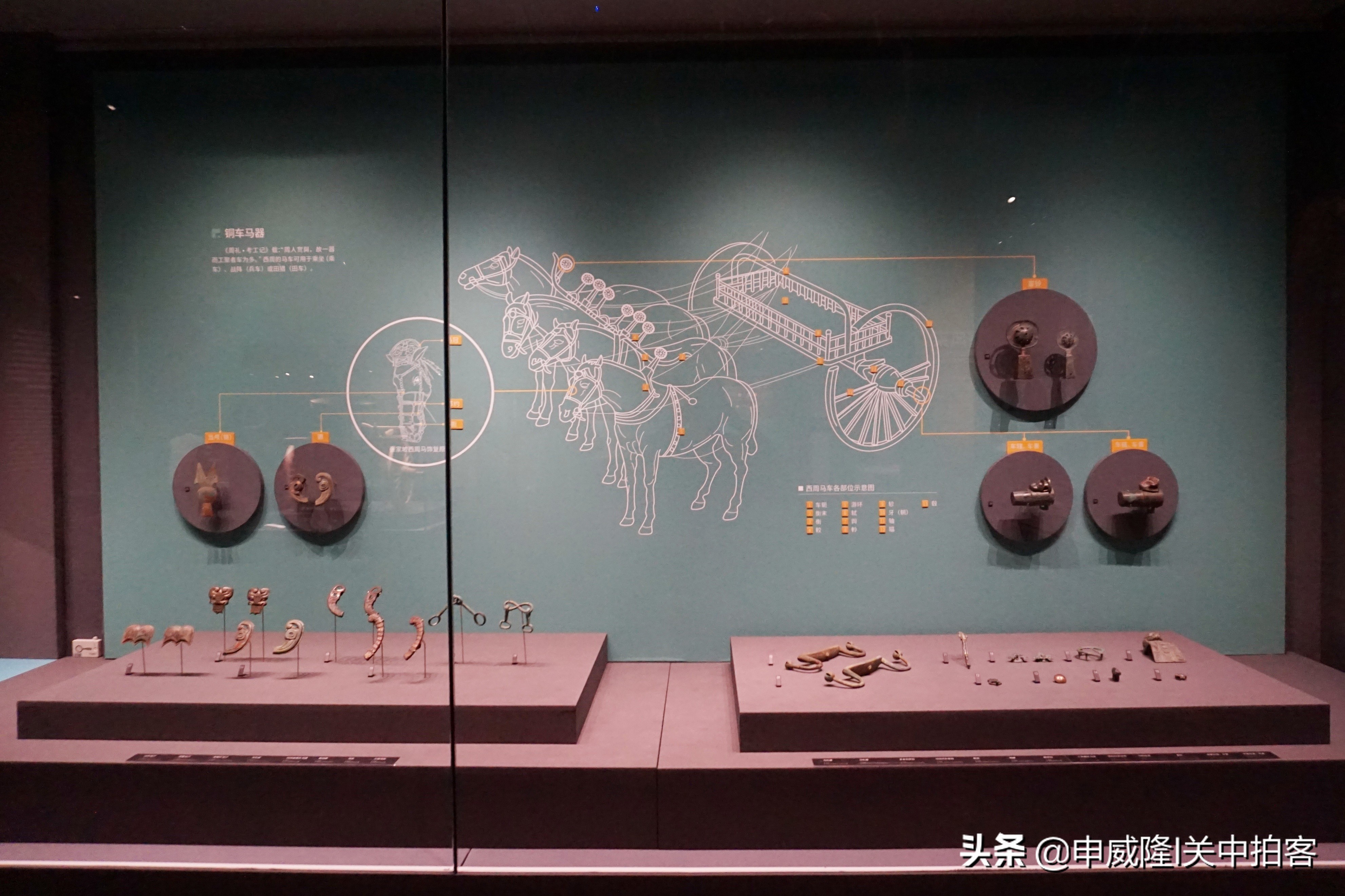这里通过青铜车马饰展示了周秦时期的车马形制,反映了当时乘坐(乘车)、战阵(兵车)和田猎(田车)的车辆使用制度。同时,结合马车各部位示意图,标注不同车马饰的具体位置。