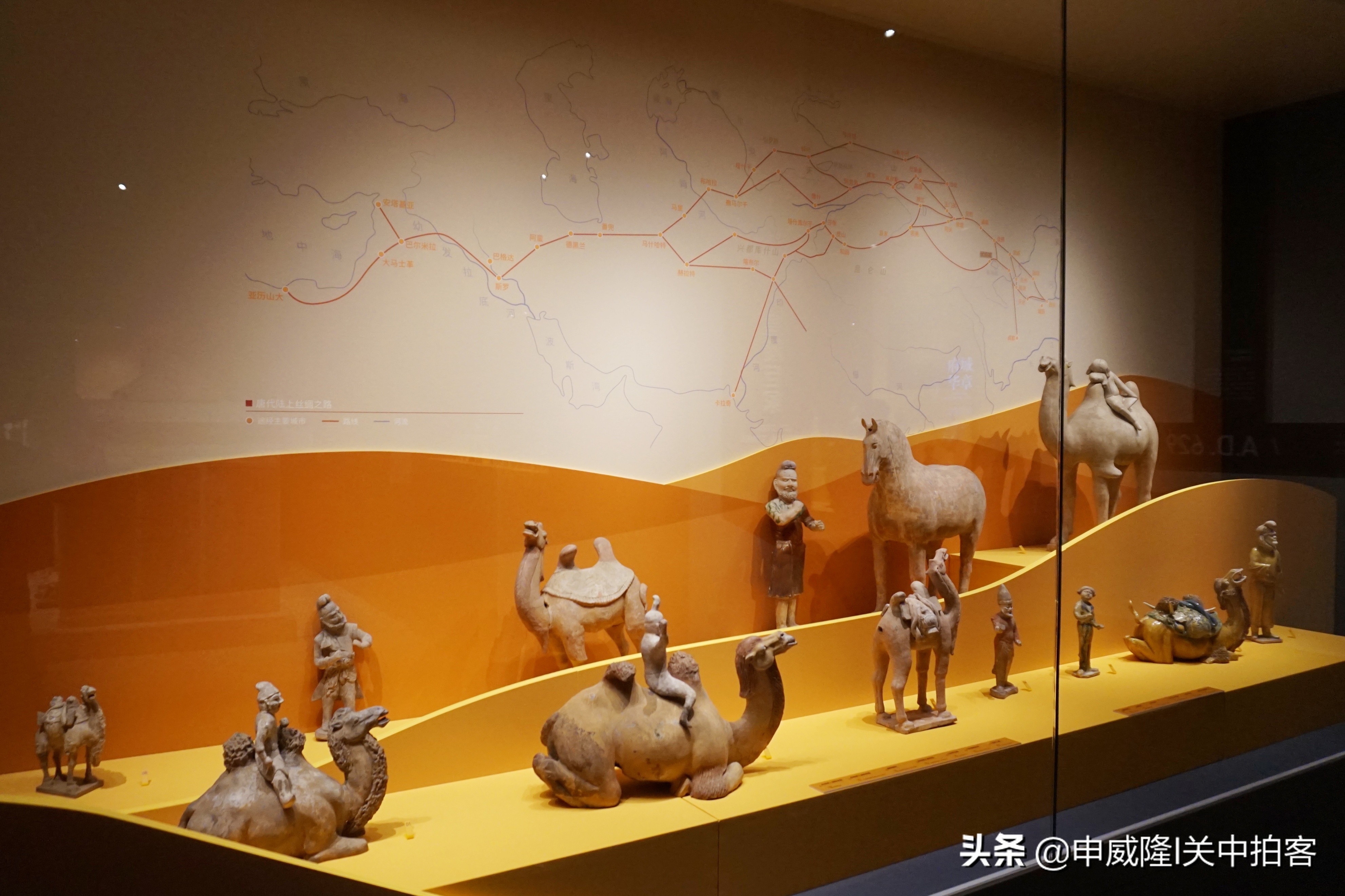 旁边的展柜之中,结合“丝绸之路”沿线国家的地图,展示了唐代各种各样的骆驼陶俑。其中,有一件骑驼胡人小憩俑,在骆驼背部的两个驼峰间,身穿胡服的女孩侧身盘腿,左手搭在左腿上,右手搭在驼峰上,头枕右臂,作小憩状。